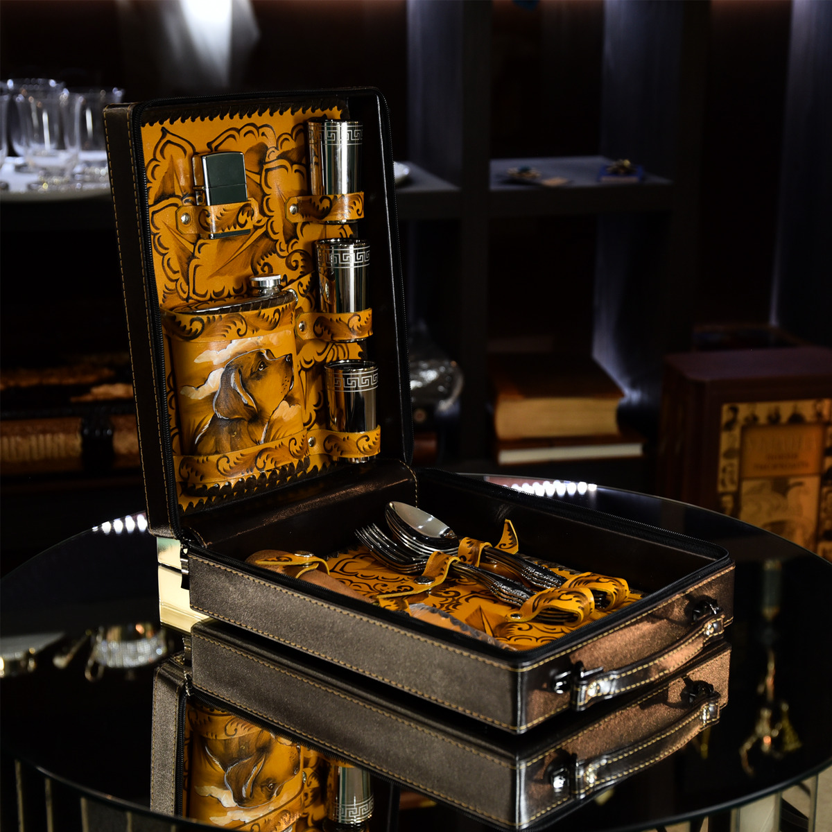 Охотничий набор «Гранд» рассчитан на пять персон. Он состоит из фляги, зажигалки, штопора, набора ложек, вилок и стопок, термоса, туристического ножа, складного ножа, ножа-тяпки, мангала, шампуров, а также комплекта тарелок. Каждый предмет сложен в отдельный кожаный чехол. Это удачный подарок для семьянина и души компании, ведь в нем есть все, что может пригодиться во время активного отдыха.