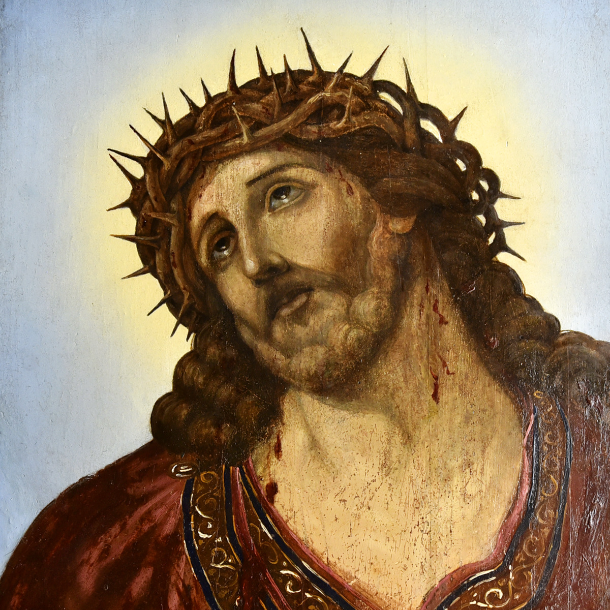4. Спас в терновом венце. Следующий эпизод Страстей Христовых – это когда Его уже осудили, пытали и теперь ведут на казнь. Либо возможен другой вариант, как на этой иконе, в которой изображается момент, когда римские солдаты издевались над Царём Царей, одев Ему на голову терновый венец вместо короны.
