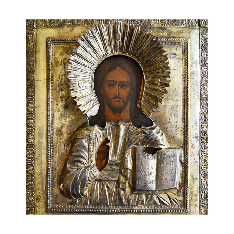 1. Господь Вседержитель. Часто ещё встречается греческое именование «Пантократор». Иконы этого типа представляют нам Иисуса Христа как Царя царей, правителя всего мира. А также Того, Кто буквально может всё. Того, Кому подвластны физические законы нашего мира, так что Он и по воде ходит как по земле. Но тут есть ещё один более тонкий момент. Кроме того, что иконы этого типа рассказывают нам о Иисусе Христе как Властителе Вселенной, они ещё изображают один из главных догматов Христианства – Боговоплощение. Ведь титул Вседержителя в Ветхом Завете принадлежал только Богу-Отцу. А в Новом стал применяться и к Его Сыну, Который одновременно Человек и Бог. Одним из прекрасных образцов иконы Иисуса Вседержителя является эта раритетная икона аж 1812 года. Она писана на золоте и выполнена в серебре.