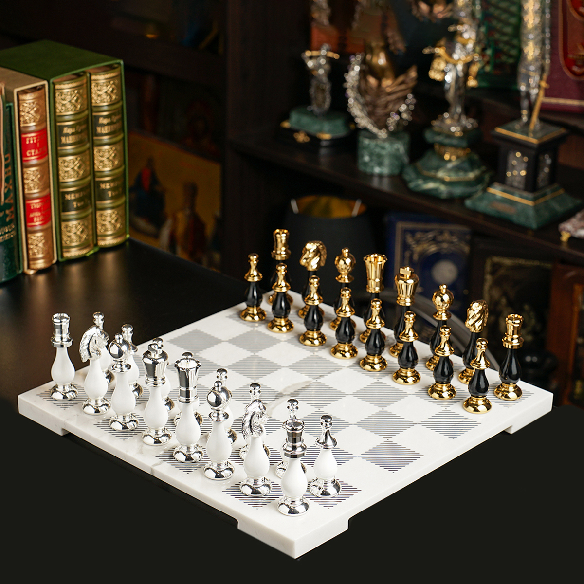 Elite chess set "Carrara Lux", board made of Bianco Carrara marble and gilded figures BY the Italian brand ITALFAMA