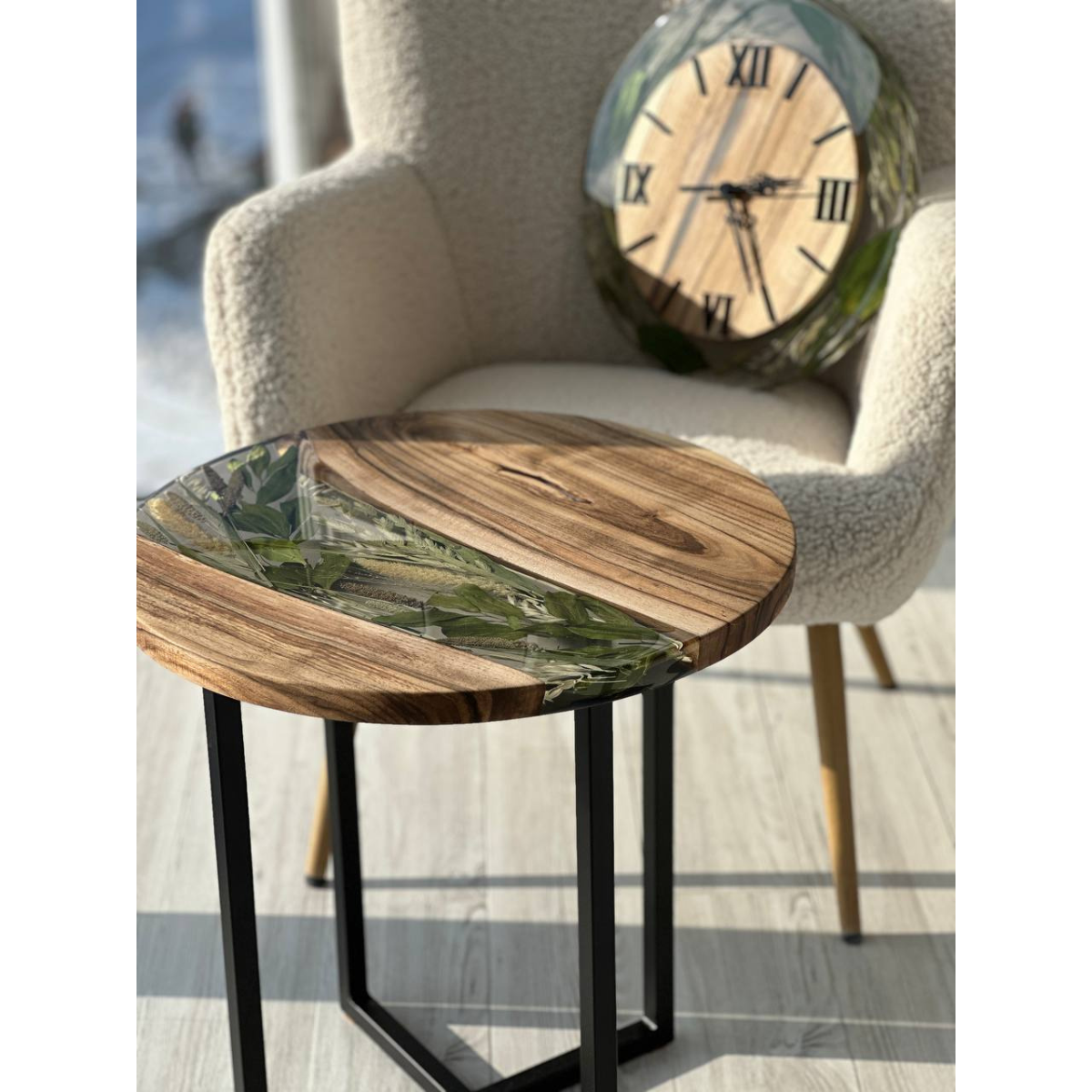 Handmade table and clock set "Force of Nature" with walnut and herbs