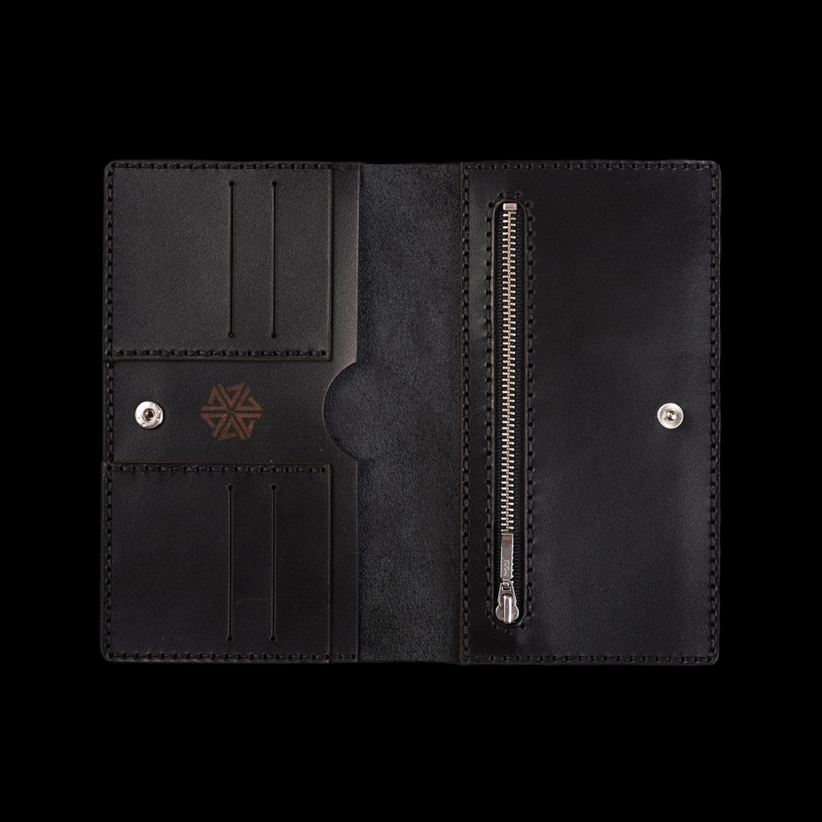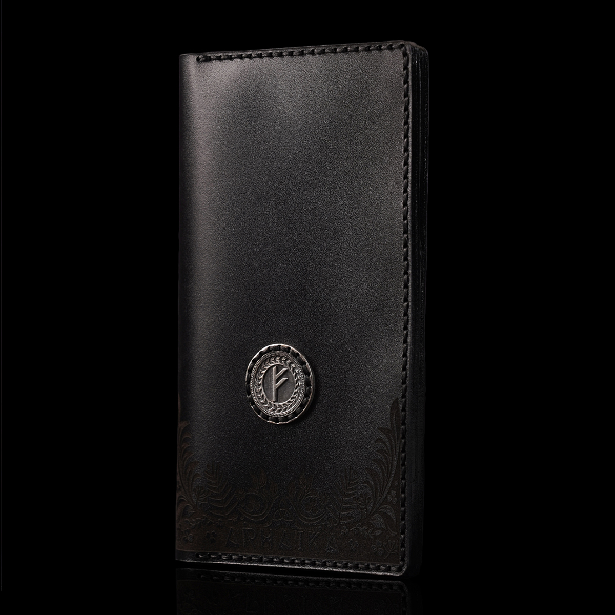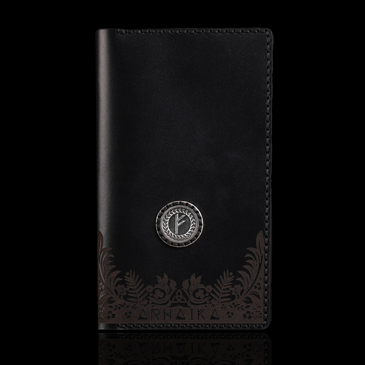 Leather wallet "Framtid" with silver rune Fehu (black) by Arhaika