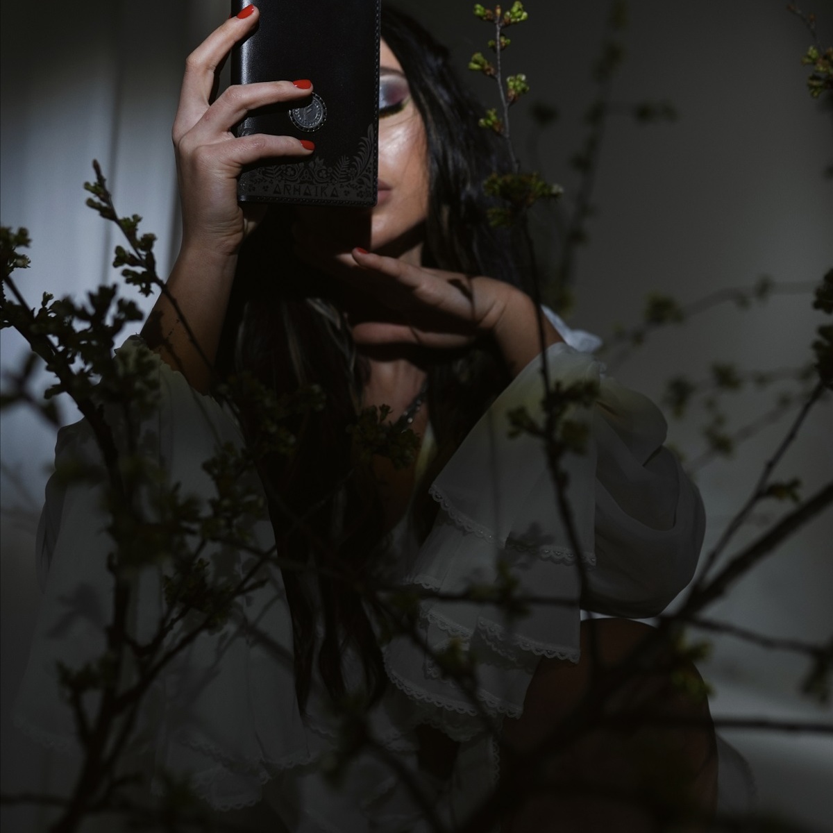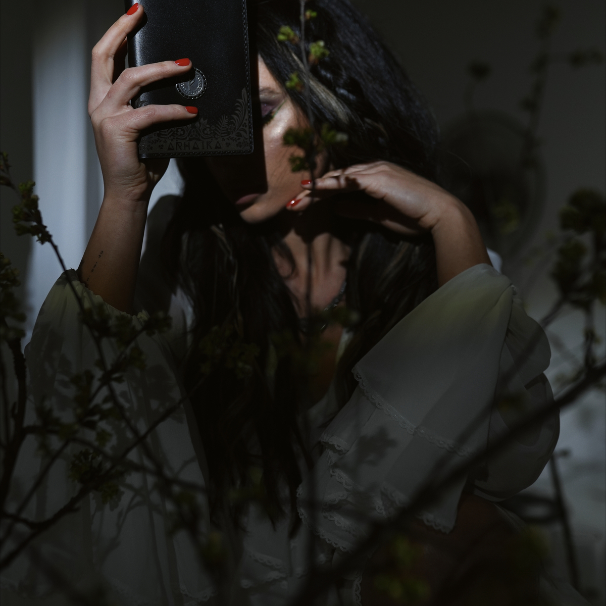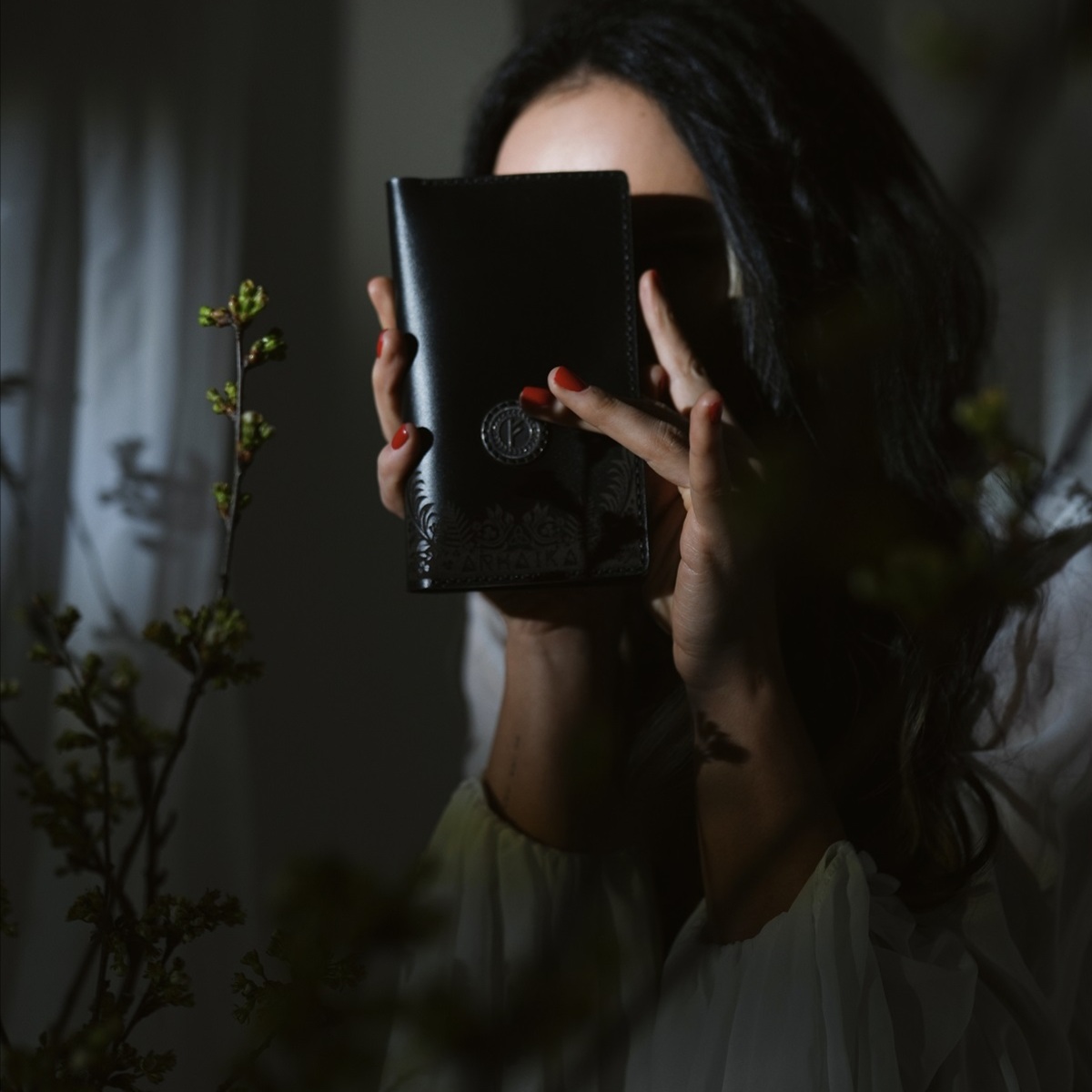 Leather wallet "Framtid" with silver rune Fehu (black) by Arhaika