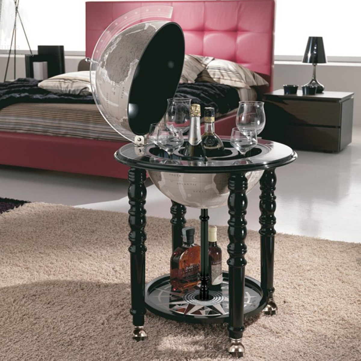 Если вы склоняетесь к выбору настольного глобус-бара, присмотритесь к «Галилео». Этот аксессуар – настоящее произведение искусства итальянских мастеров, сочетающее в себе элитный мини-бар и трехмерную модель планеты Земля. Такой предмет декора придаст интерьеру кабинета или комнаты дорогой вид.