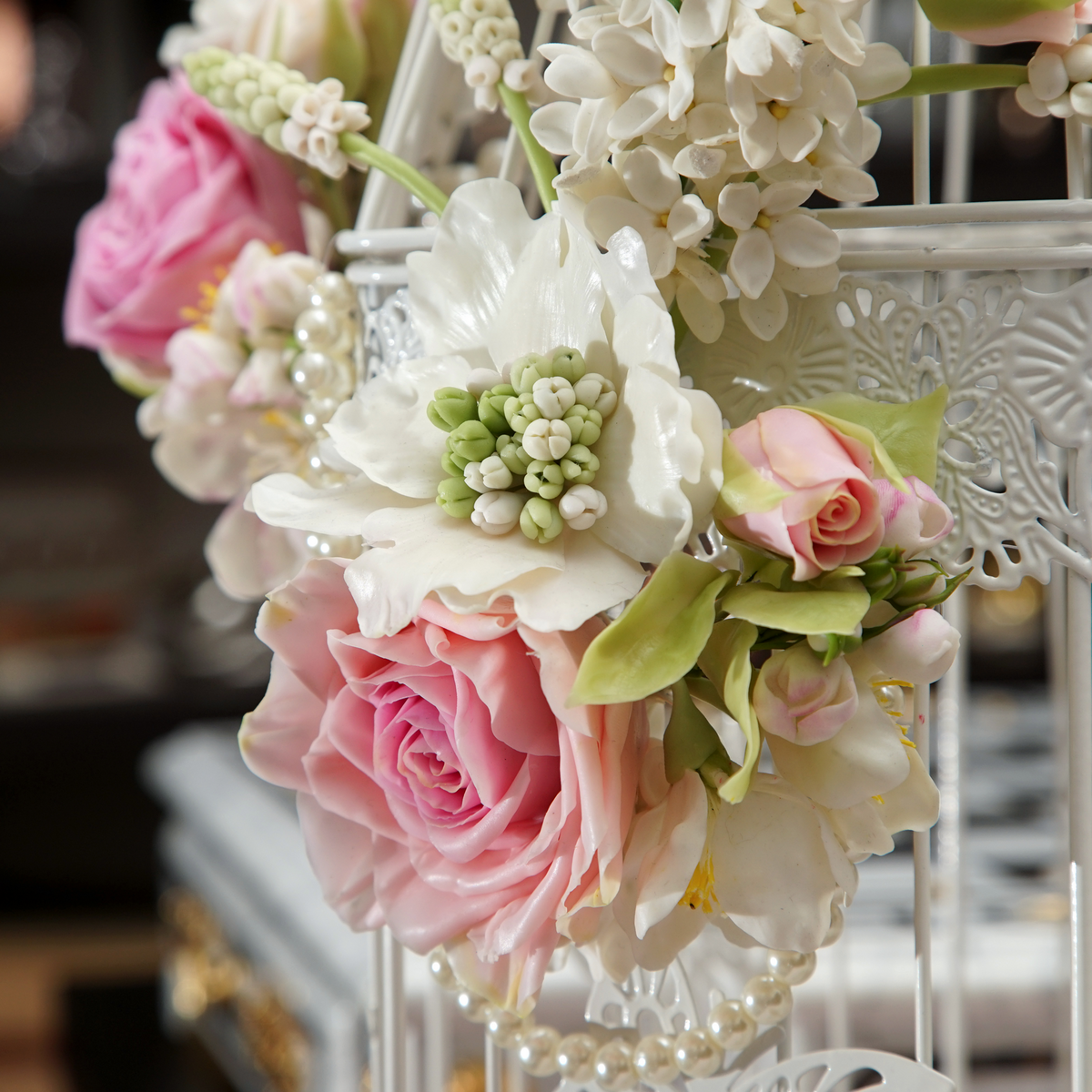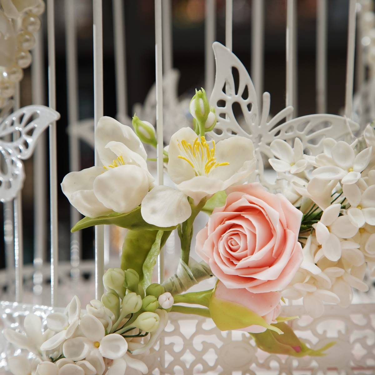 Декоративная клетка с цветами из холодного фарфора от Flora Moderling