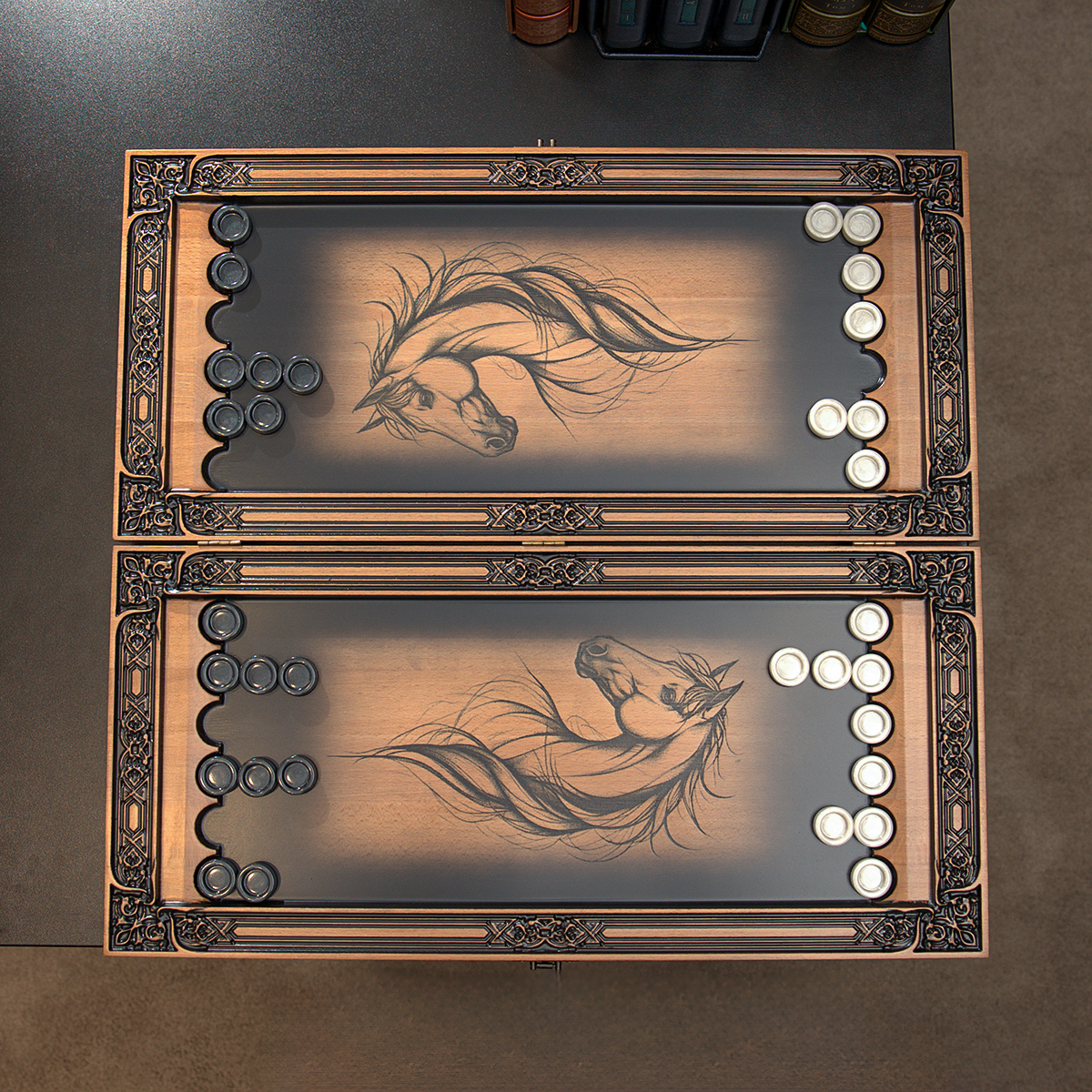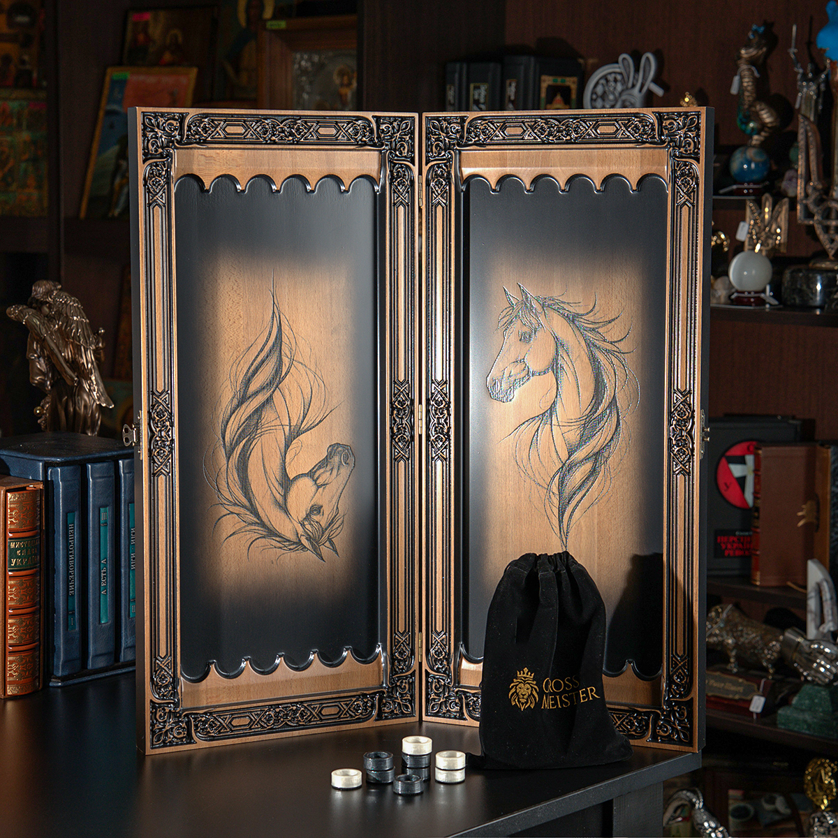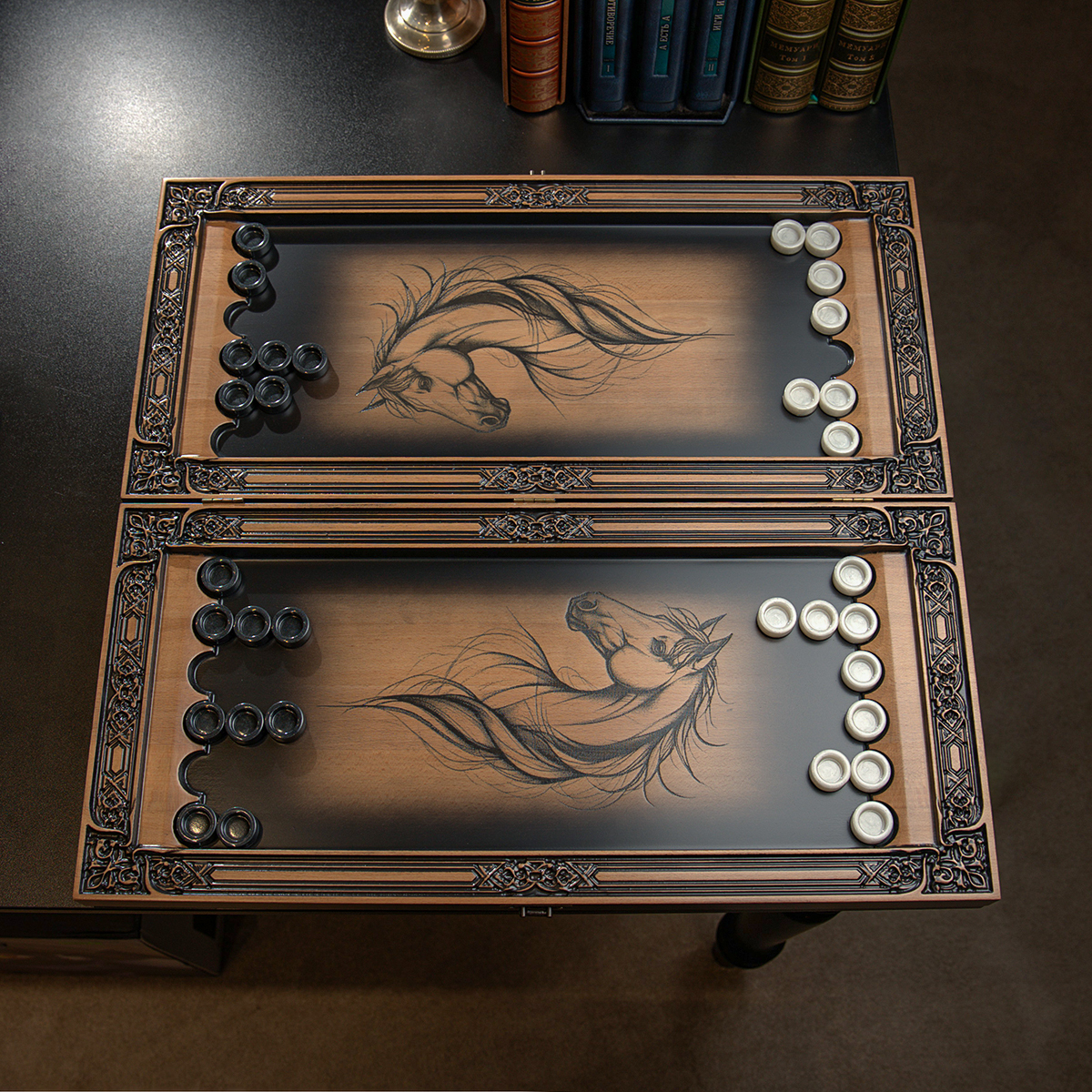 Деревянные нарды "Лошадь и Подковка на Удачу" ручной работы (60х28 см)