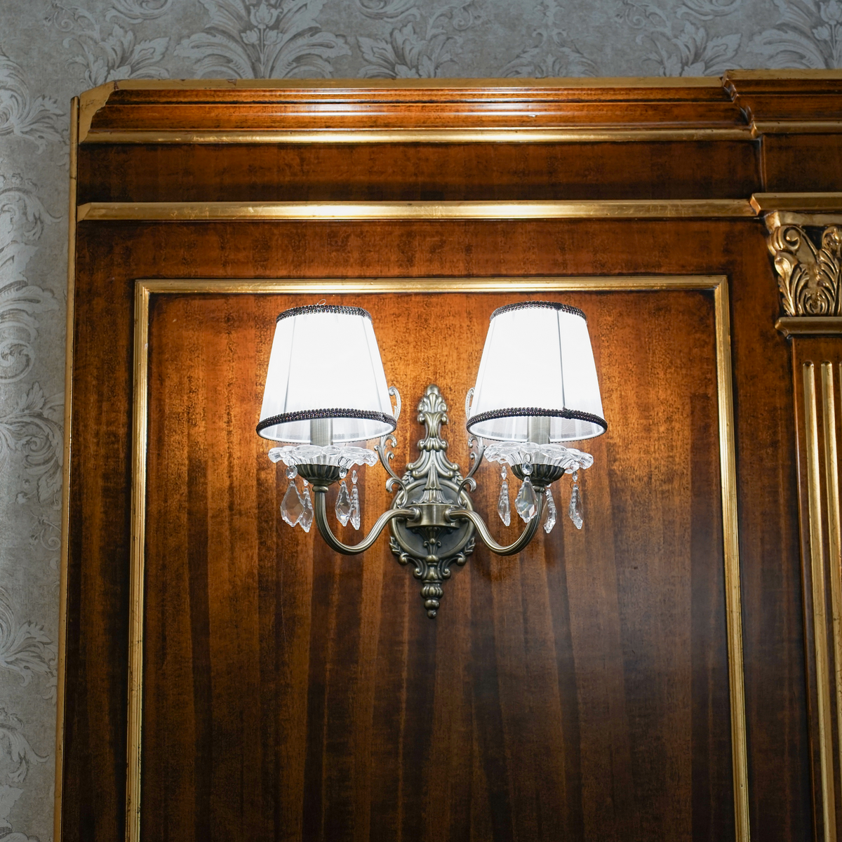 Классическая настенная панель из натурального дерева, украшенная резьбой и позолоченными элементами в ретро-стиле (в комплекте 2 настенных бра со светильниками)