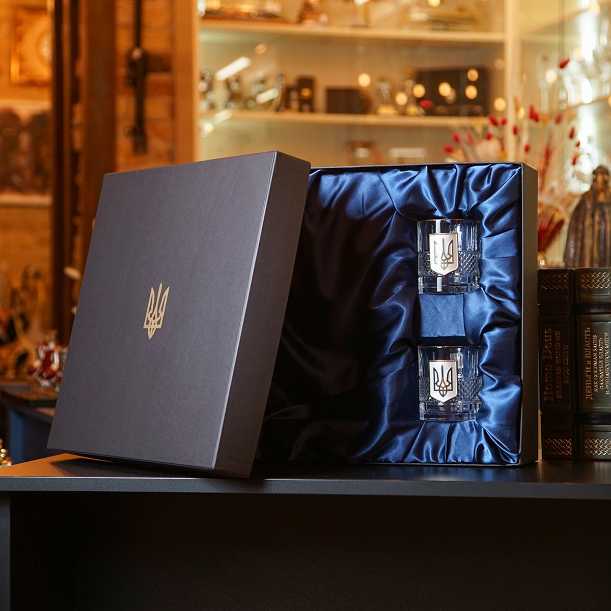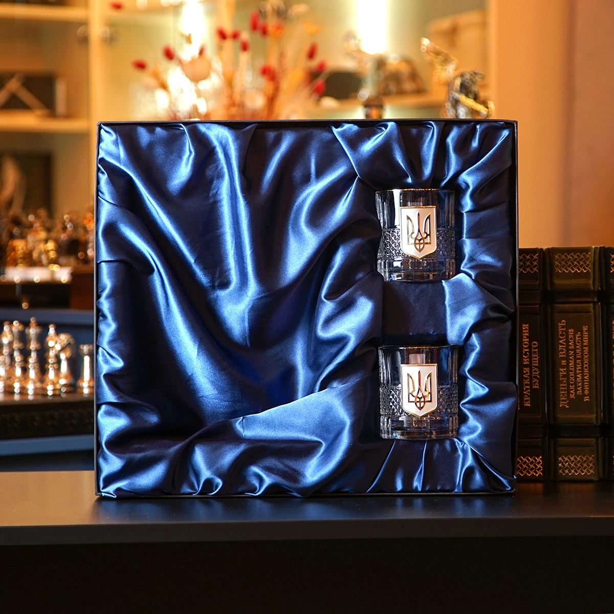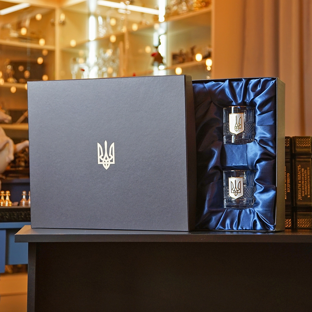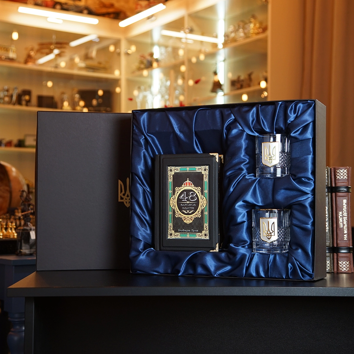 Комплект из двух бокалов для виски "Тризуб" и книги Роберта Грина "48 законов власти" в подарочной коробке