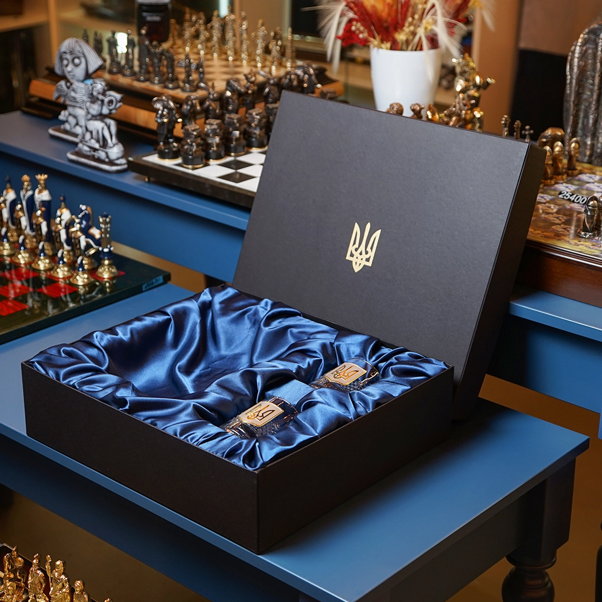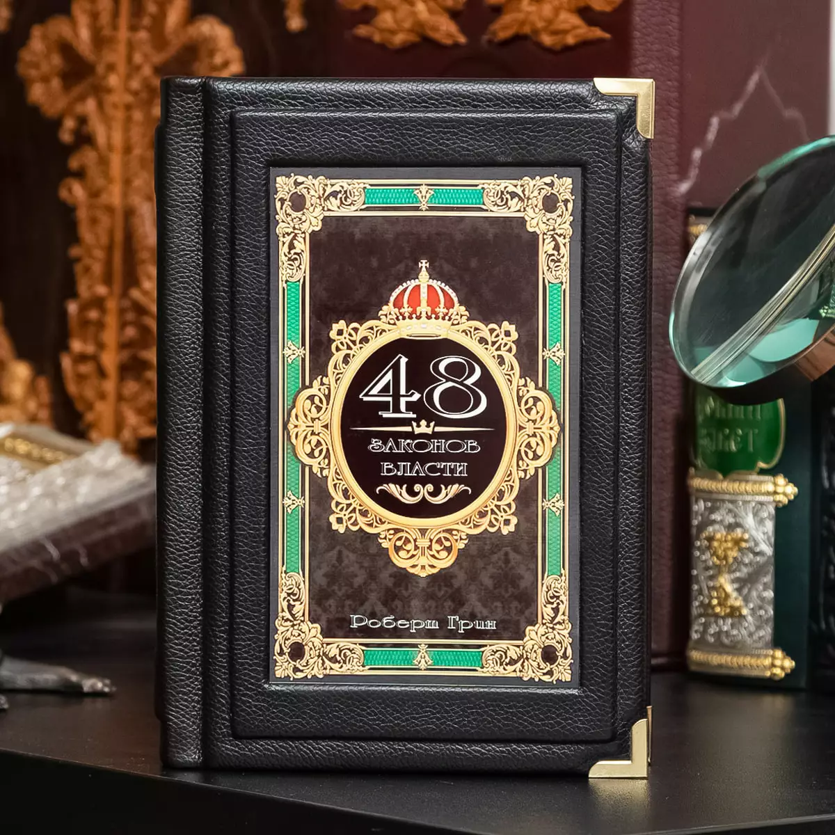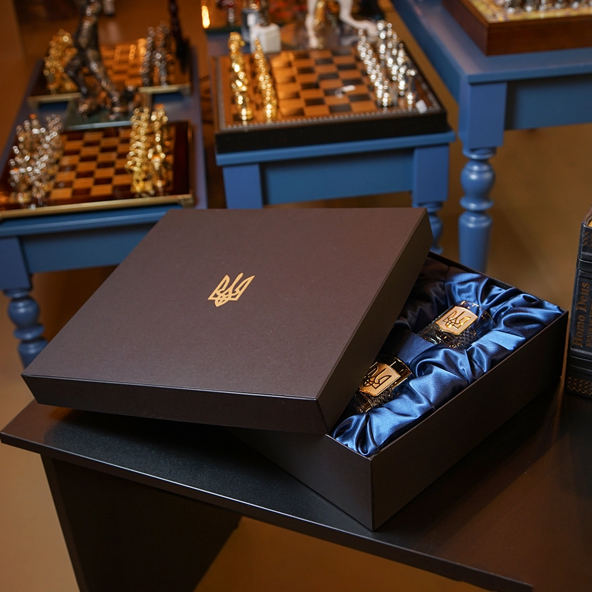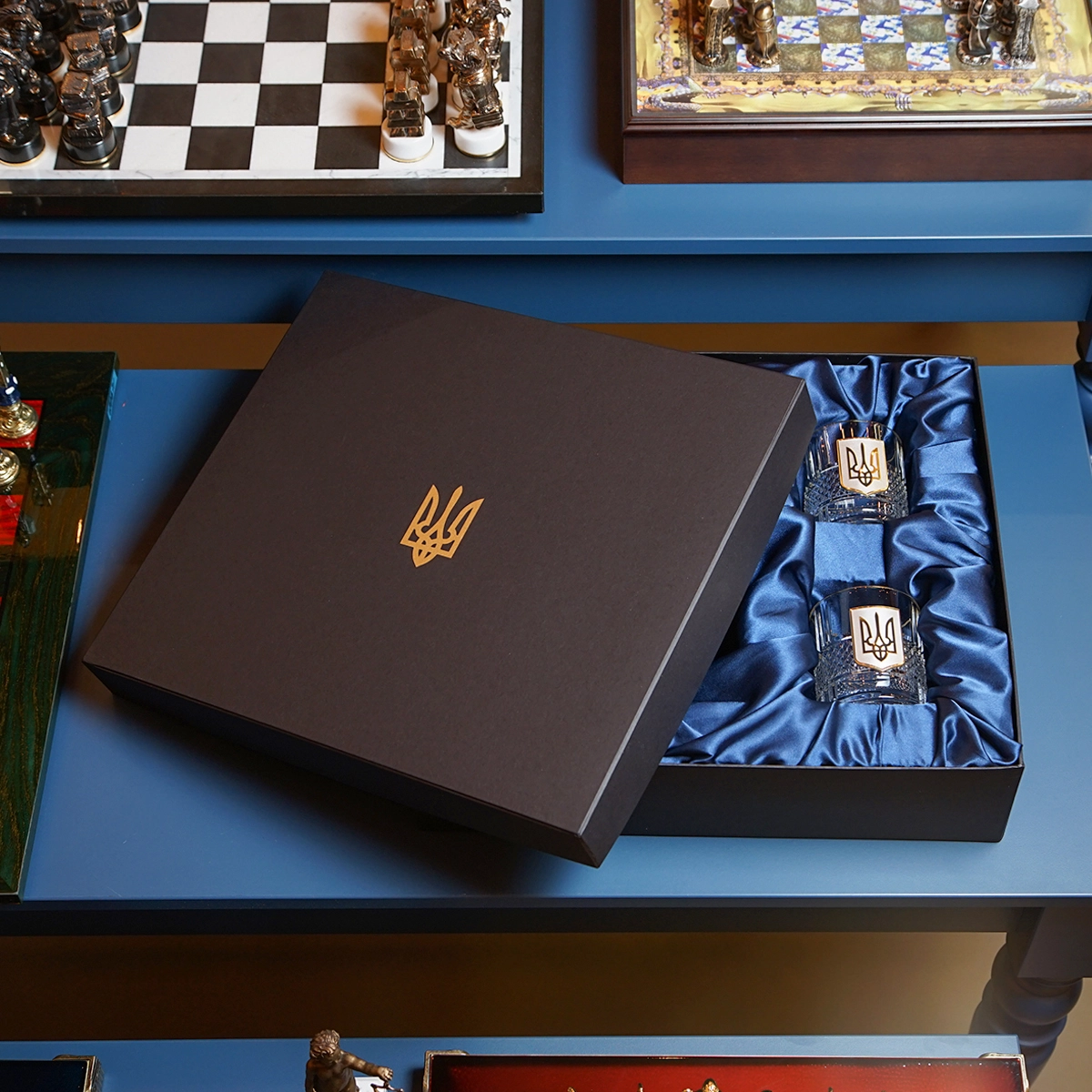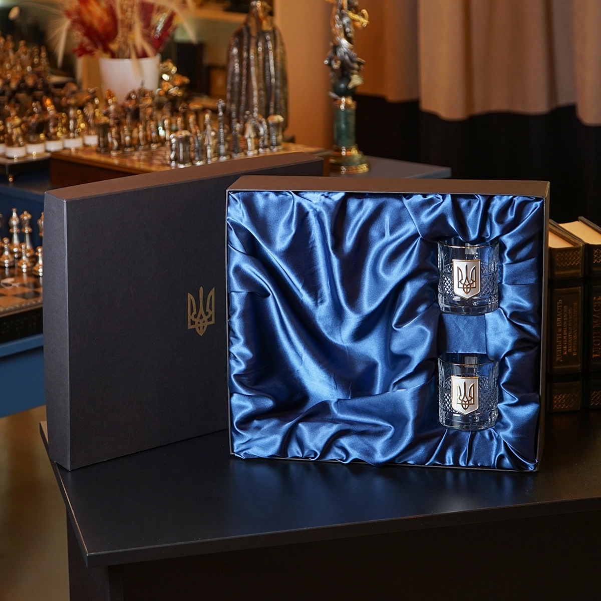 Комплект из двух бокалов для виски "Тризуб" и книги Роберта Грина "48 законов власти" в подарочной коробке