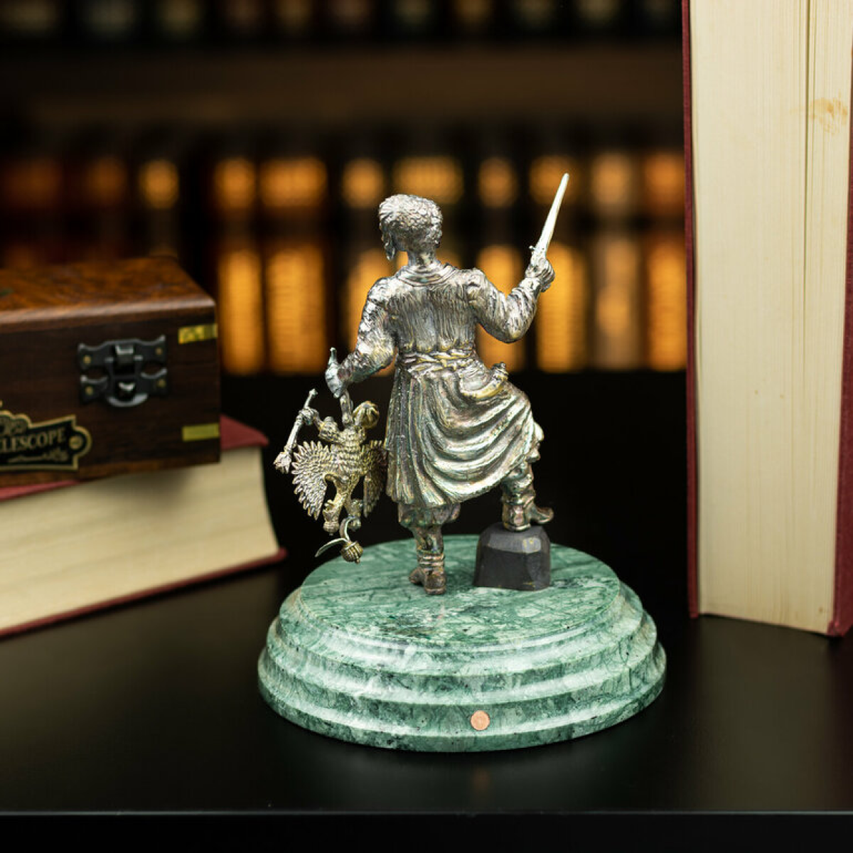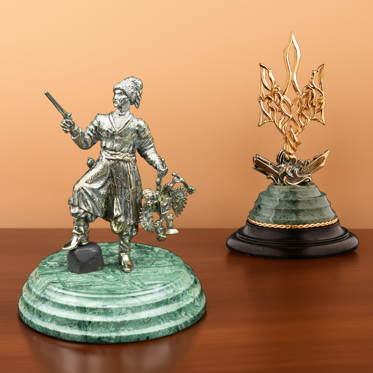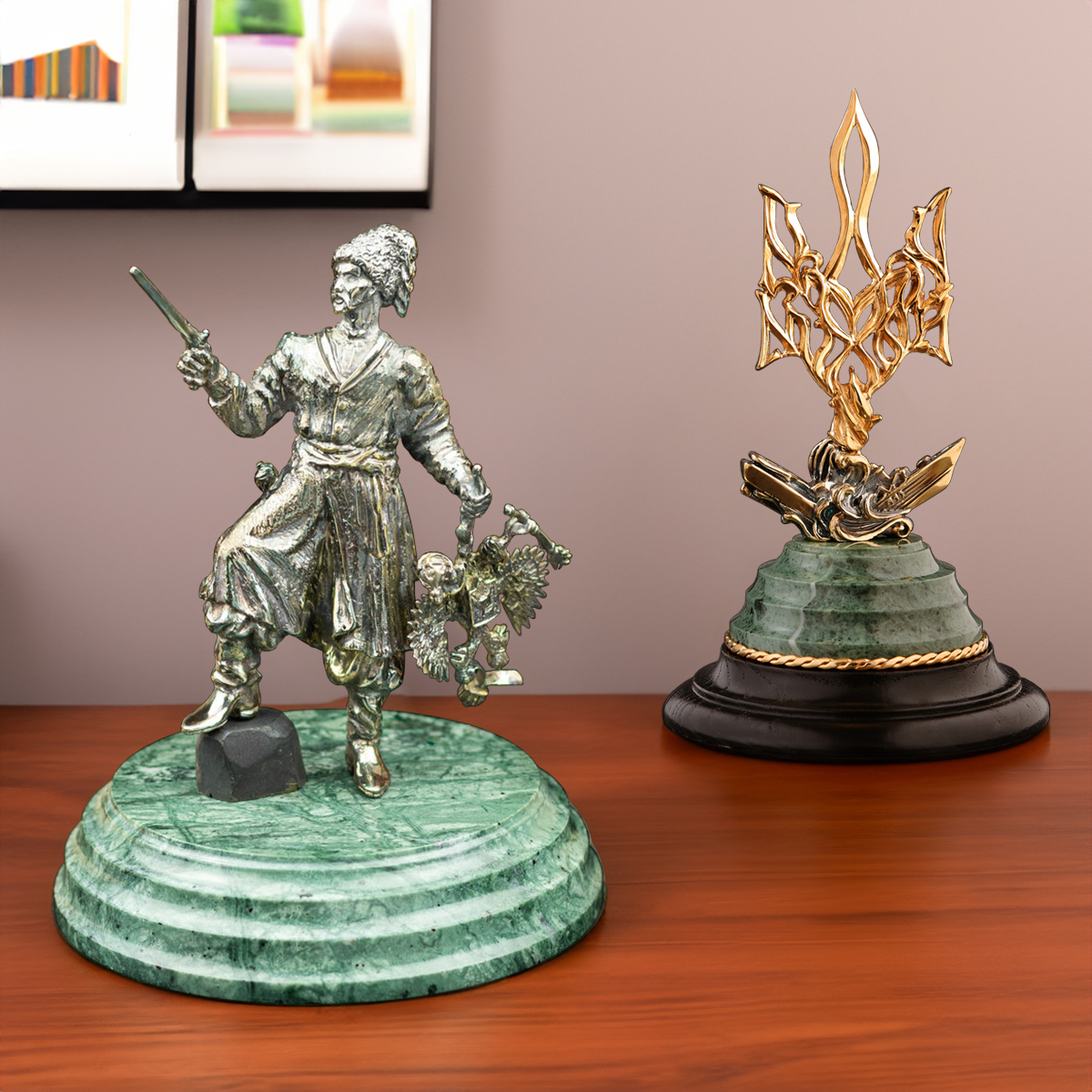 Комплект из статуэтки на мраморной подставке "Козак Освободитель" и авторской статуэтки Герб Украины Трезубец с позолотой и серебром