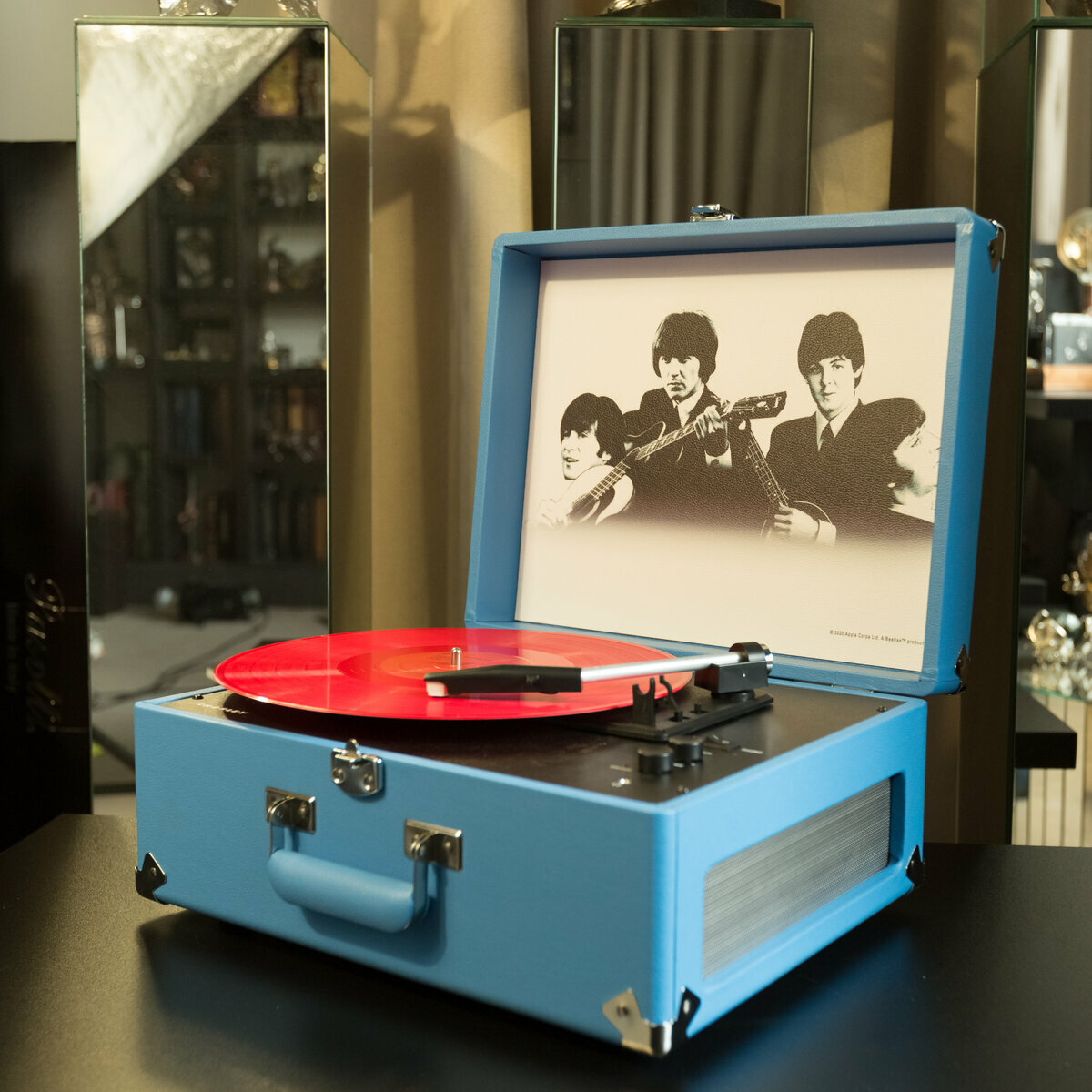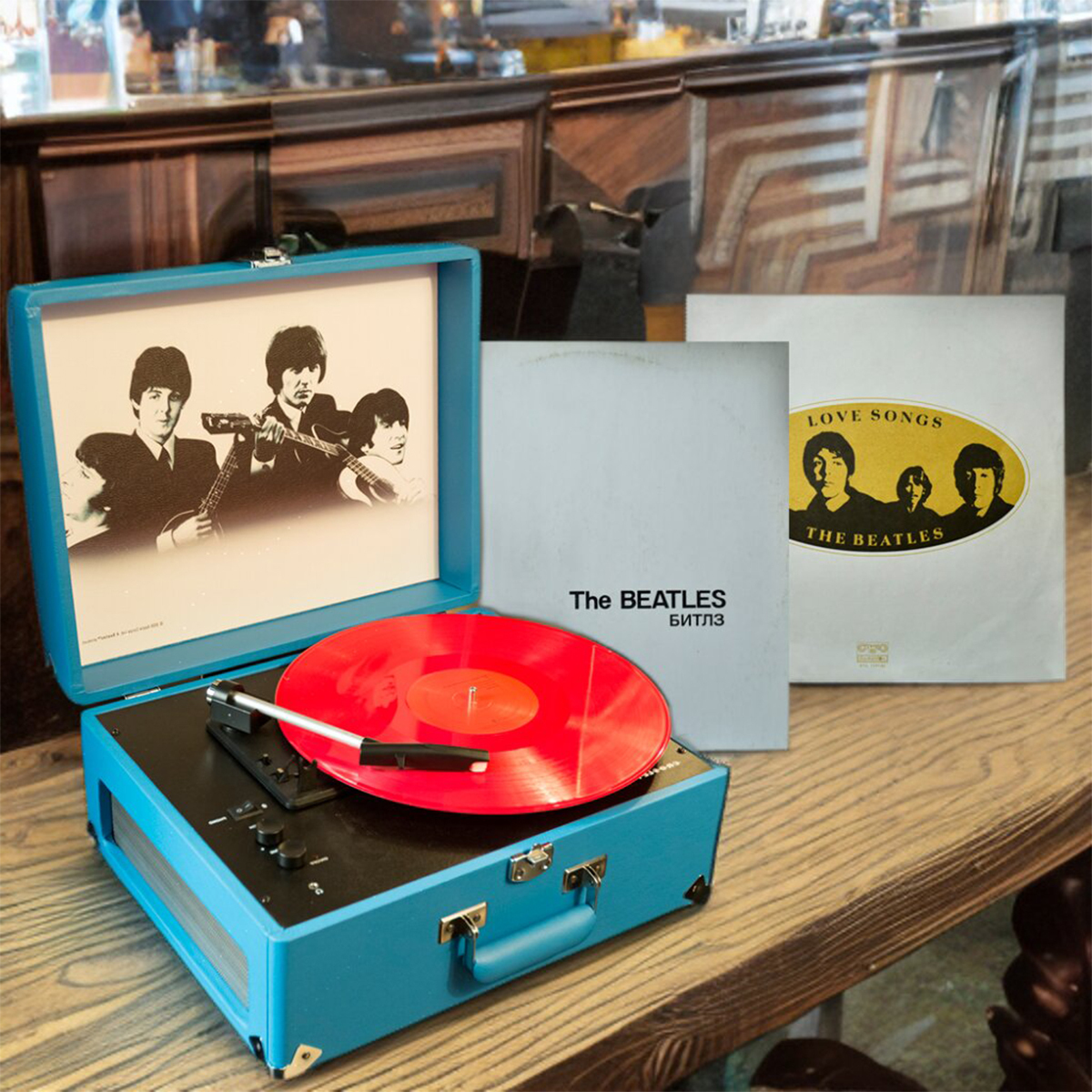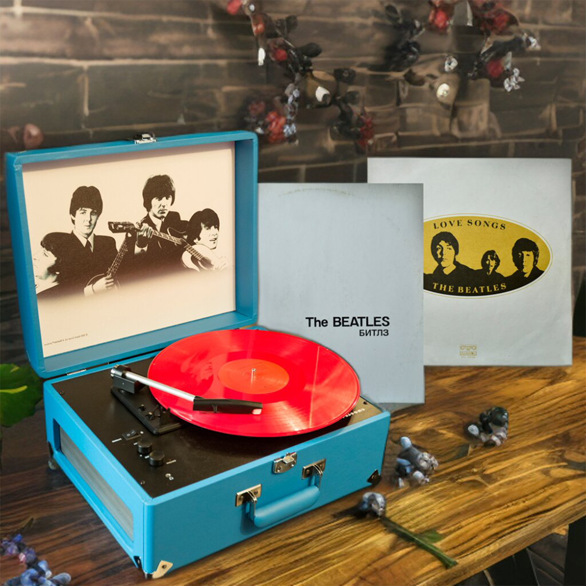 Комплект из портативного винилового проигрывателя “Beatles” от Crosley и виниловых пластинок The Beatles «Love Songs» (2 LP) и «Белый альбом» (2 LP) 1977 г.