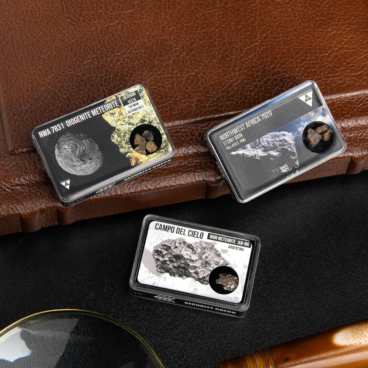 Комплект сертифицированных метеоритов "Campo Del Cielo" (Аргентина), "NWA 7920" (Марокко) и "NWA 7831" (Западная Сахара)
