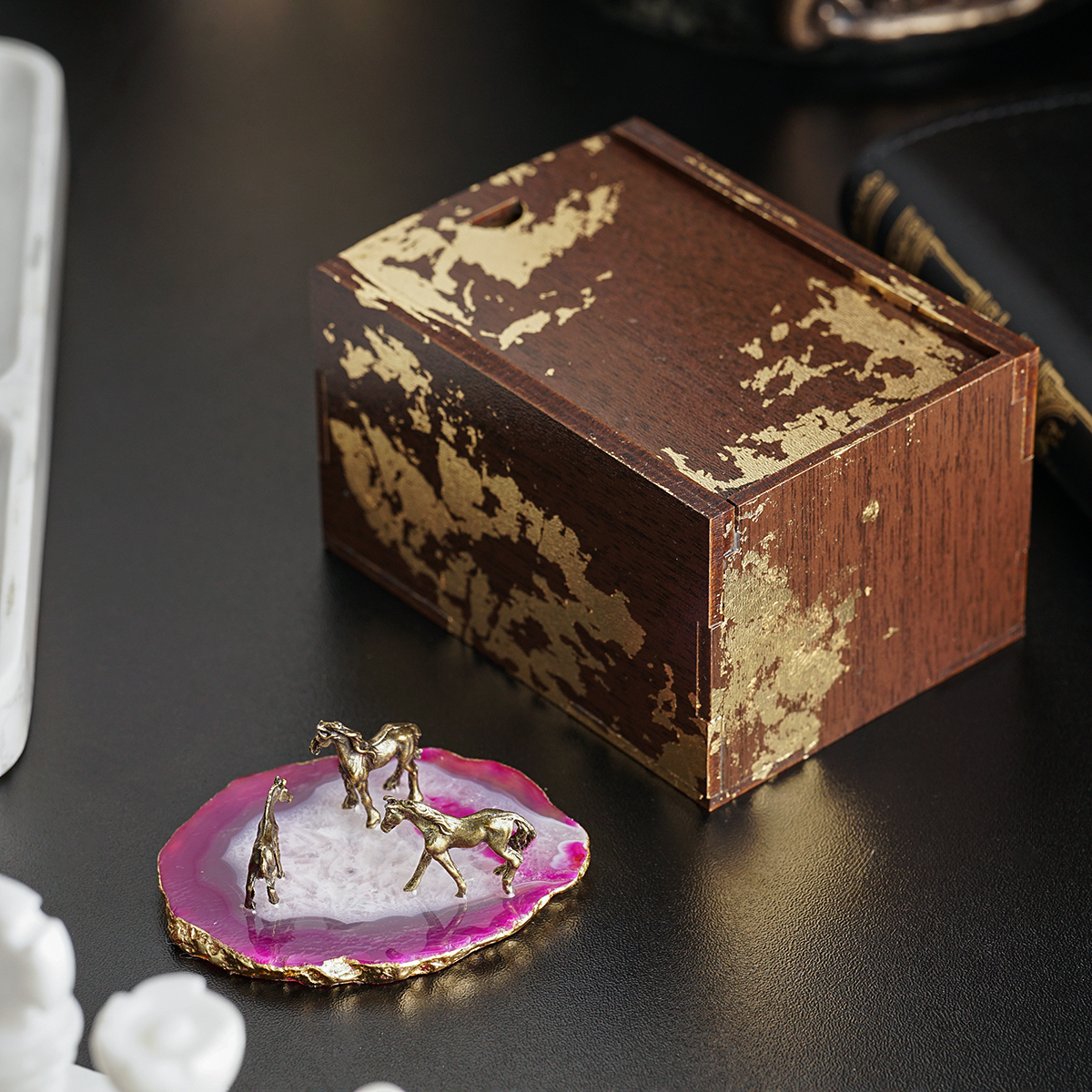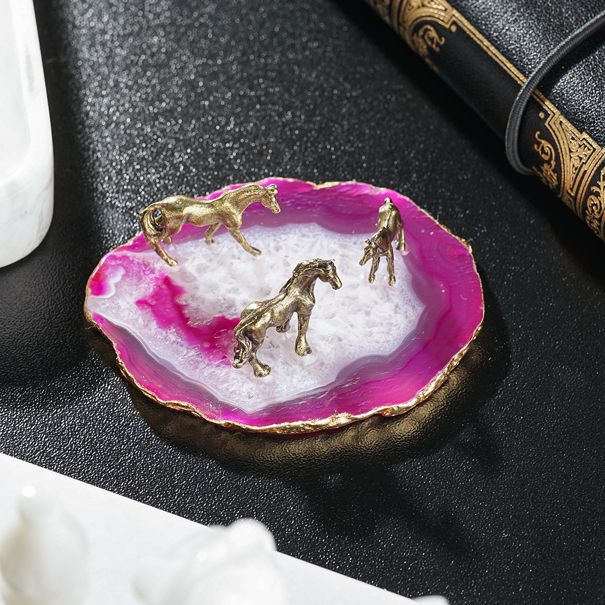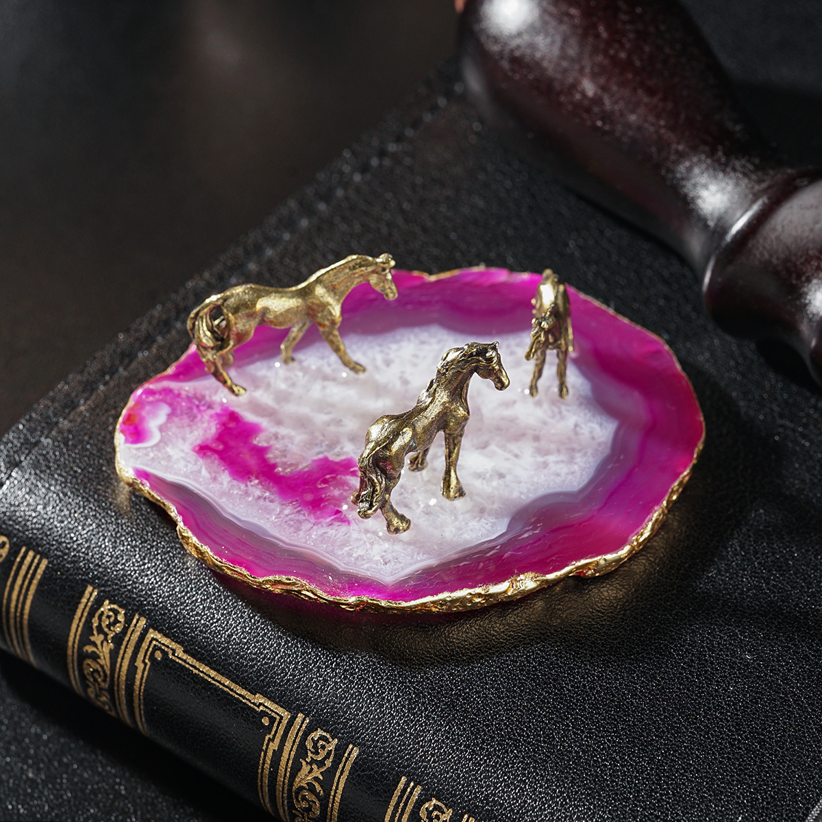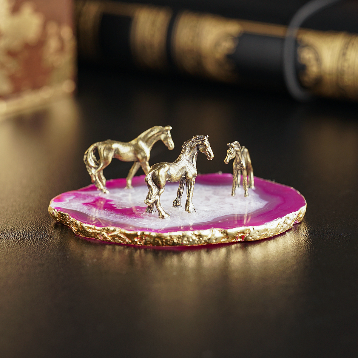 Миниатюра лошади на подставке из агата с золотой поталью "Breath of the wind" (малиновый)