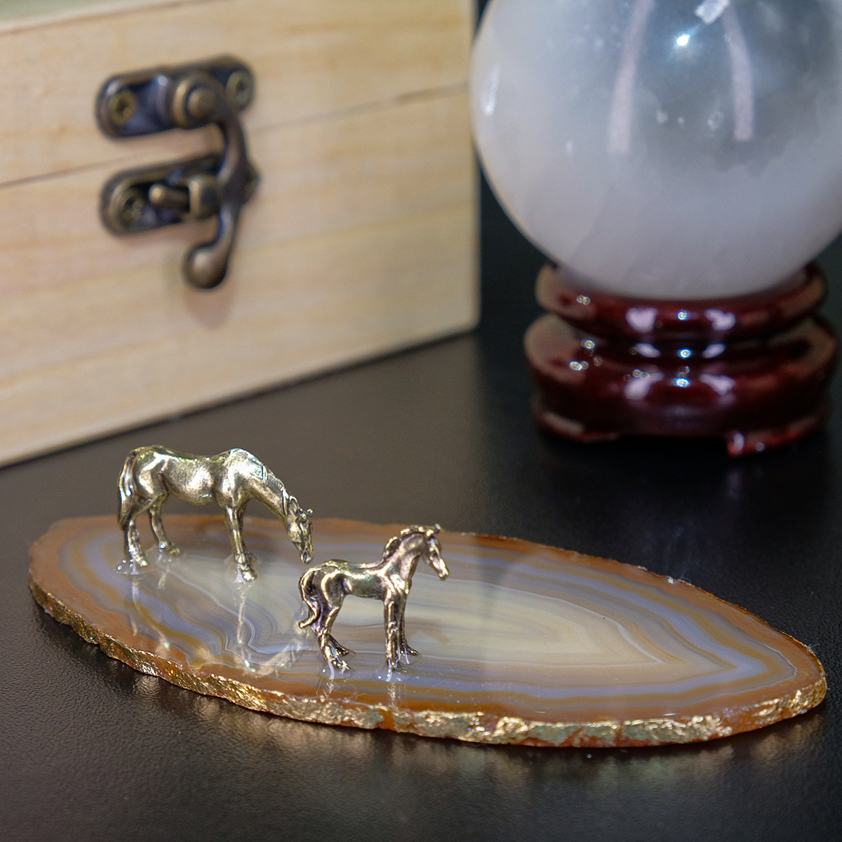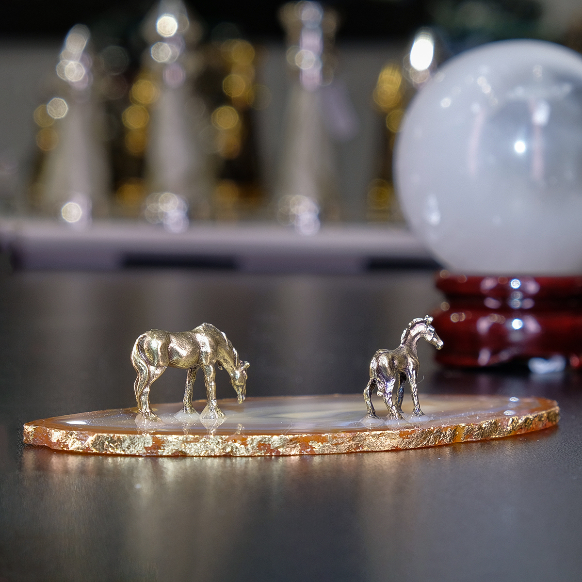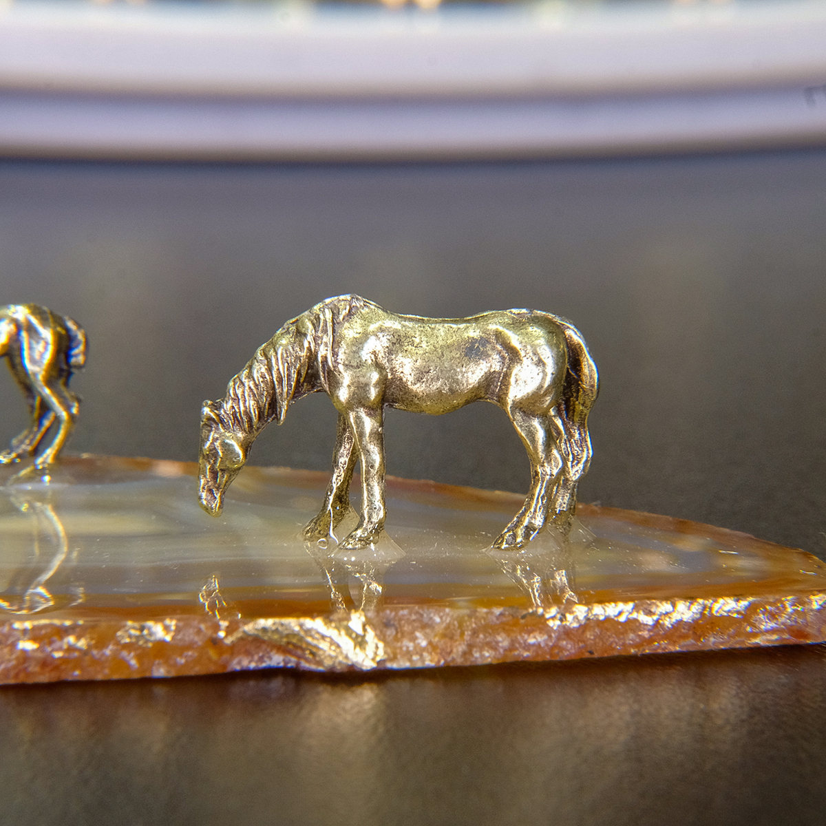 Миниатюра с двумя фигурками лошадей на подставке из агата с золотой талью "Line of movement" (медово-карамельный)