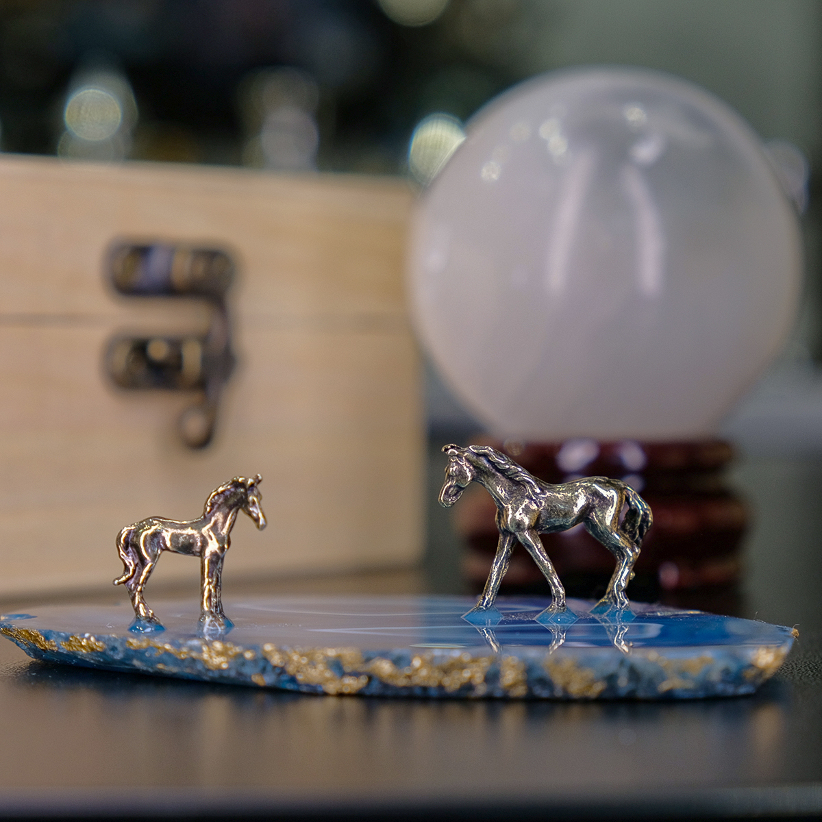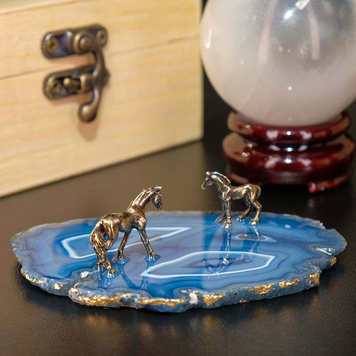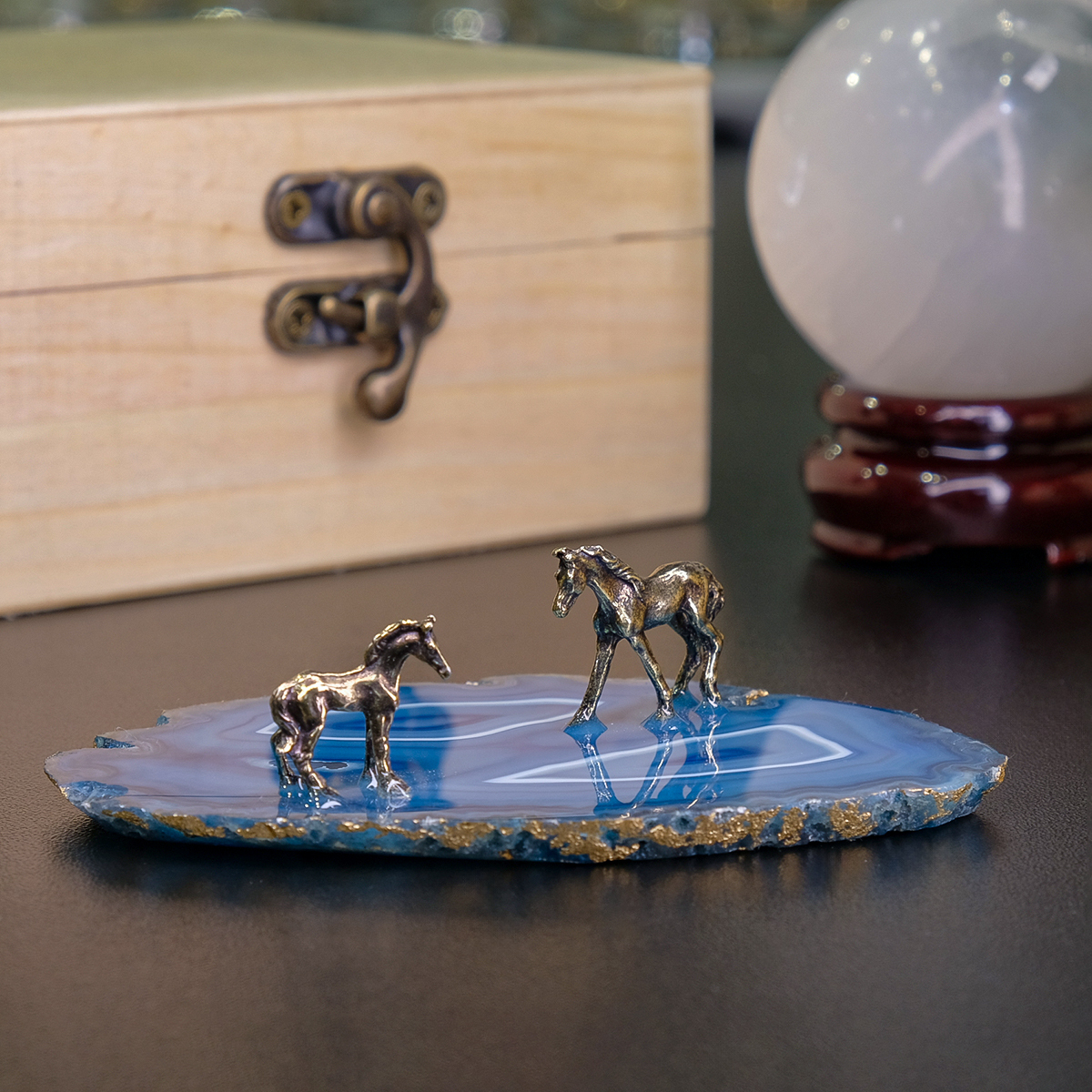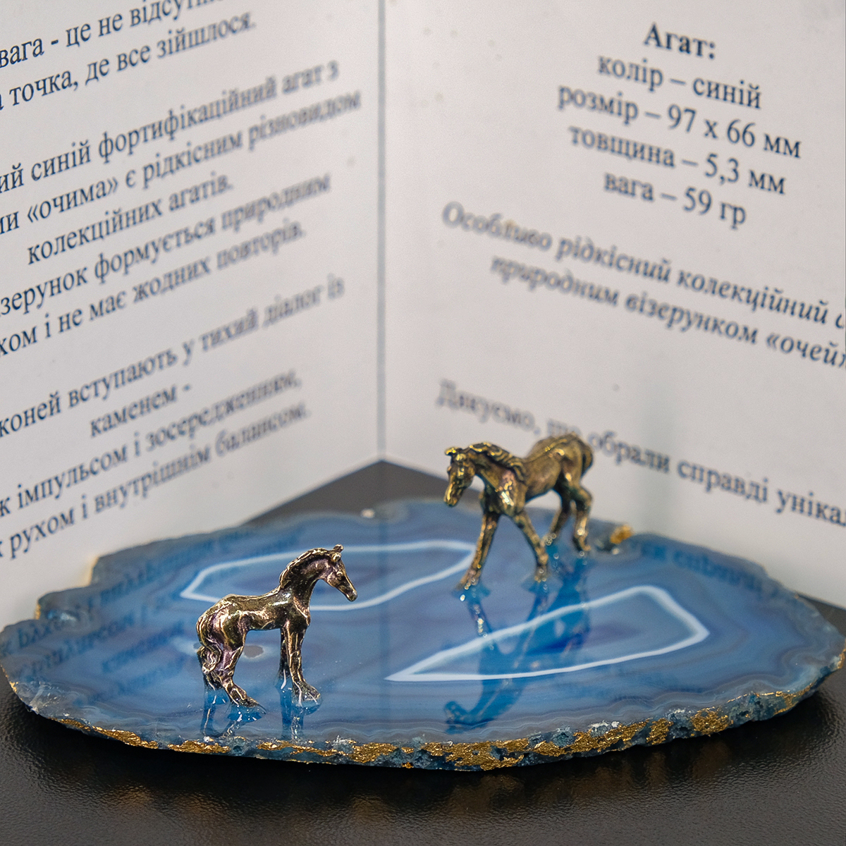 Миниатюра с двумя фигурками лошадей на подставке из агата с золотой талью "The rhythm of the wind" (синий)