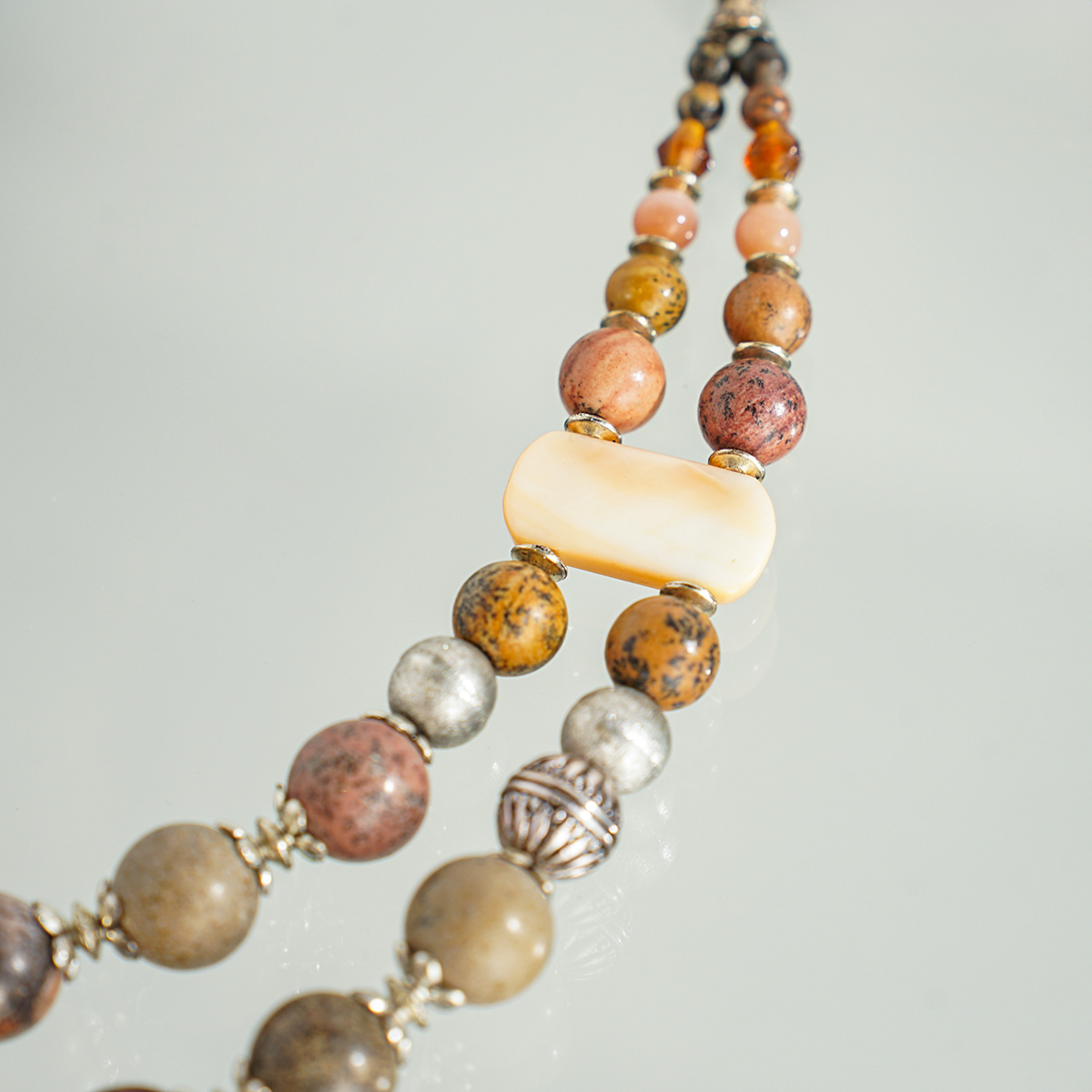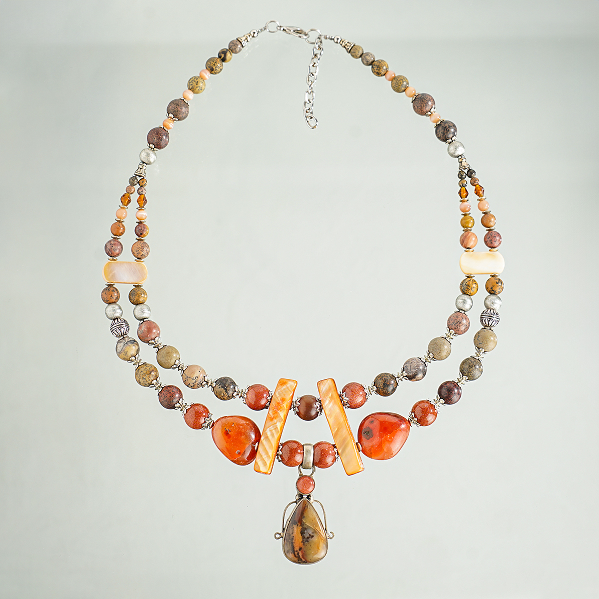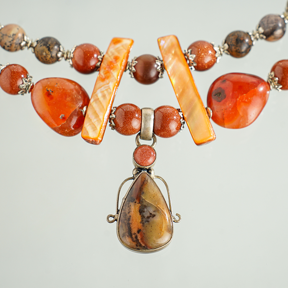 Ожерелье "Симфония" 2-рядное из агата (посеребренного), сердолика, золотого песка, яшмы