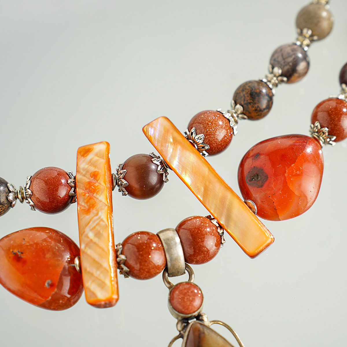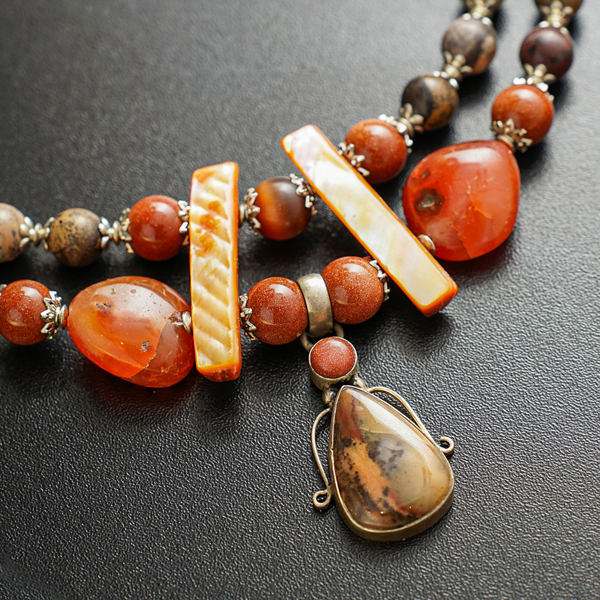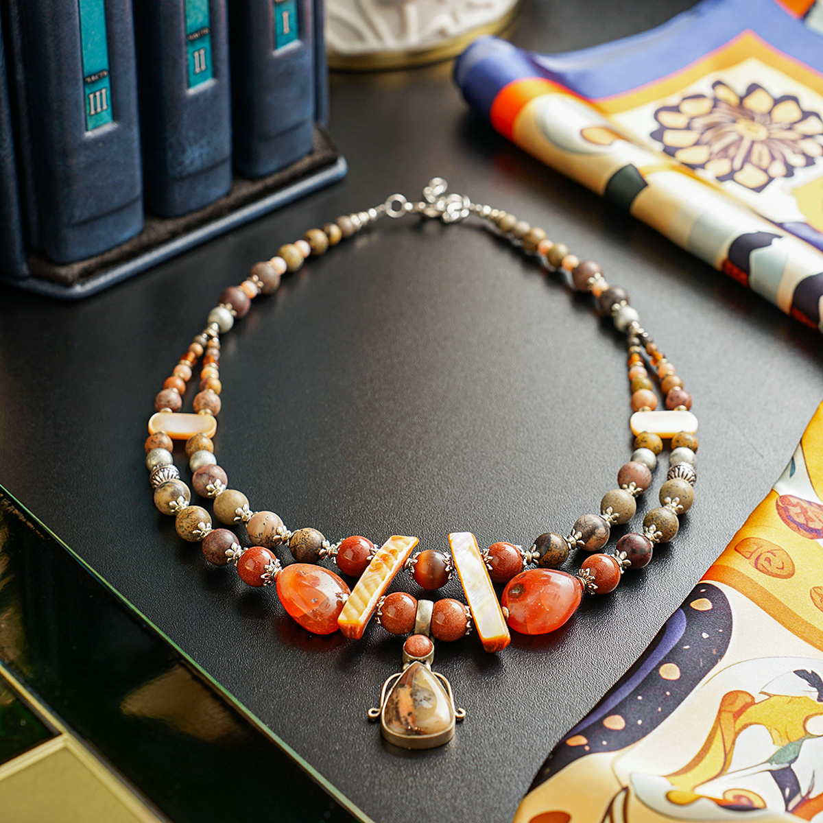 Ожерелье "Симфония" 2-рядное из агата (посеребренного), сердолика, золотого песка, яшмы