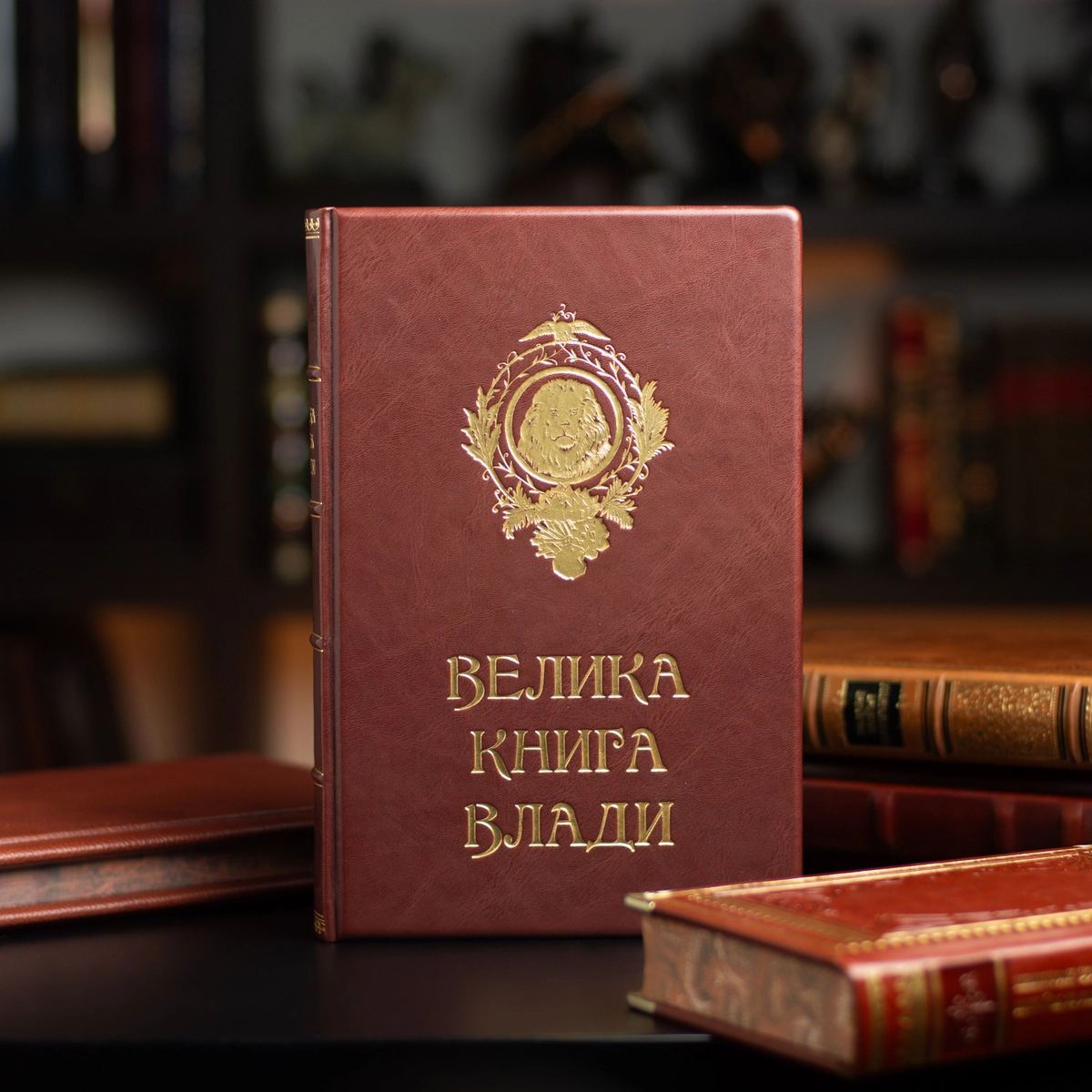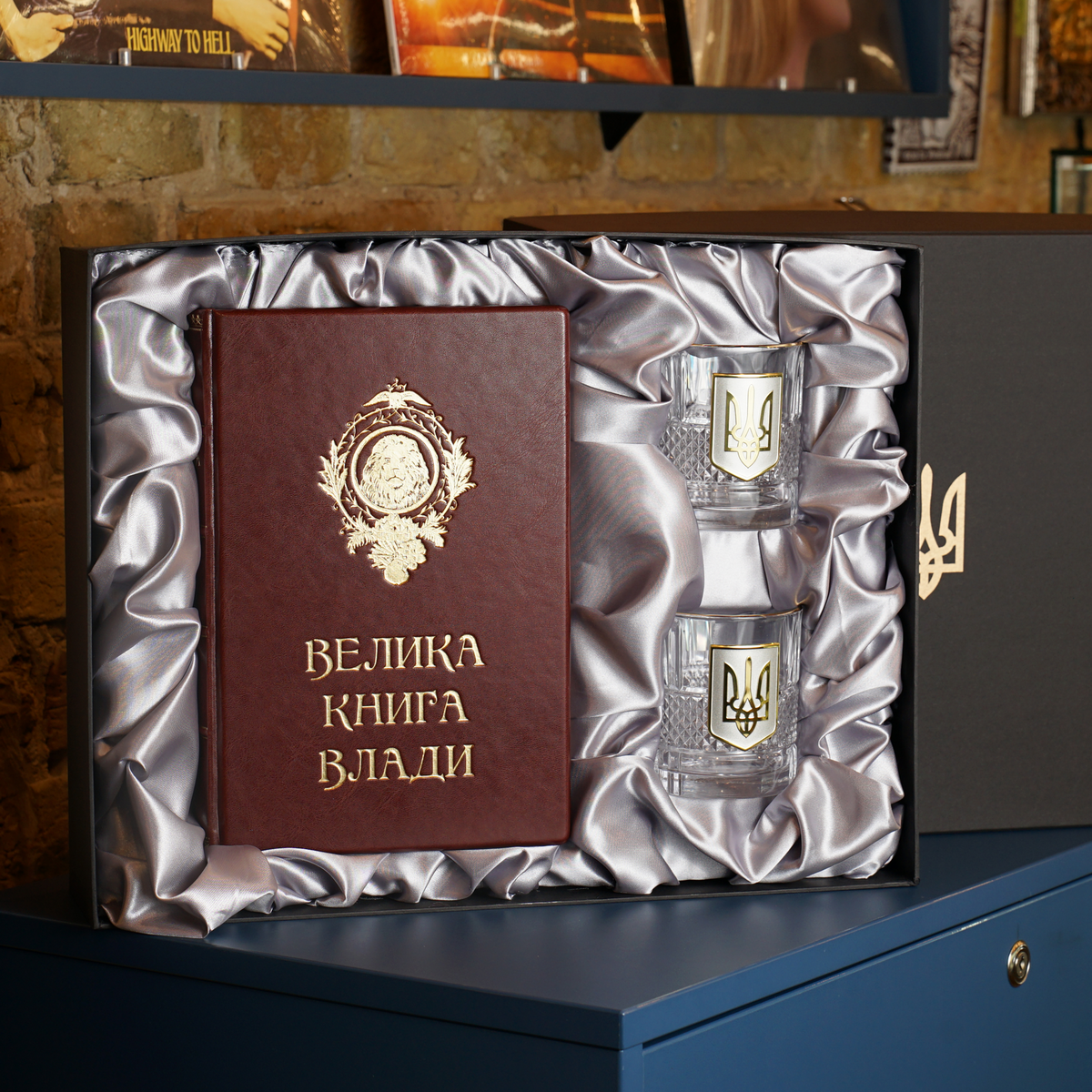 Подарочный комплект хрустальные бокалы с позолотой и серебром "Тризуб" и книга в кожаном переплете "Большая книга власти" (на украинском языке)
