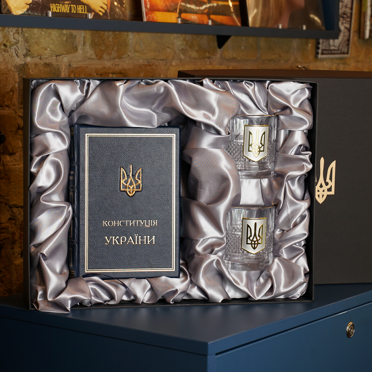 Подарочный комплект хрустальные бокалы с позолотой и серебром "Тризуб" и книга в кожаном переплете "Конституция Украины" (на украинском языке)