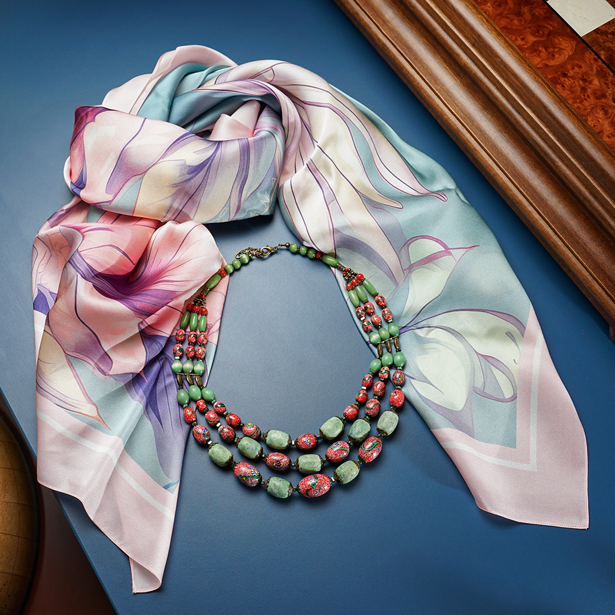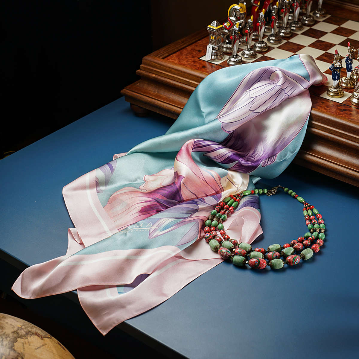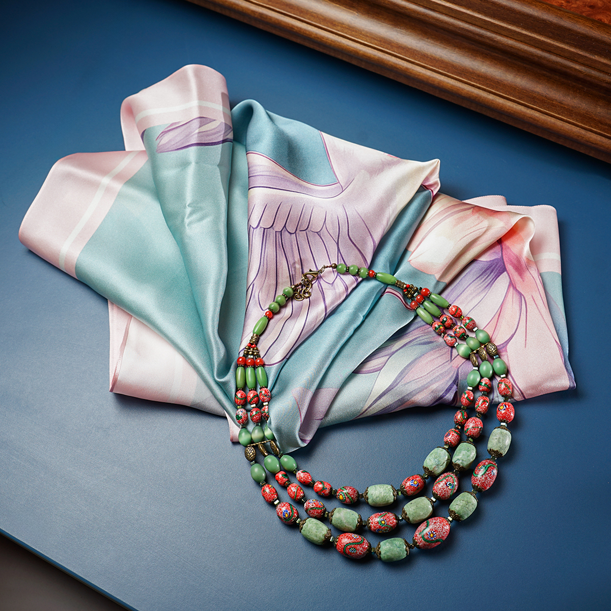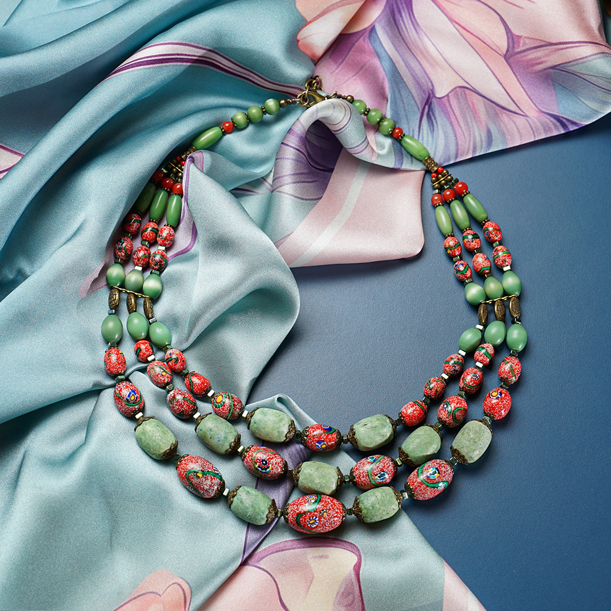 Подарочный комплект ожерелье "Загадка" 3-рядное из чешского "богемского" стекла и платок из натурального шелка "Pinky bird" от FAMA