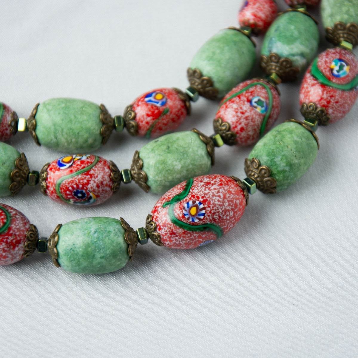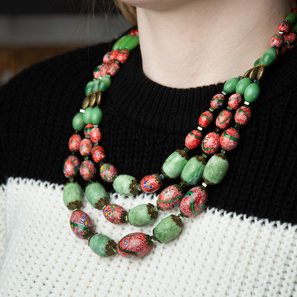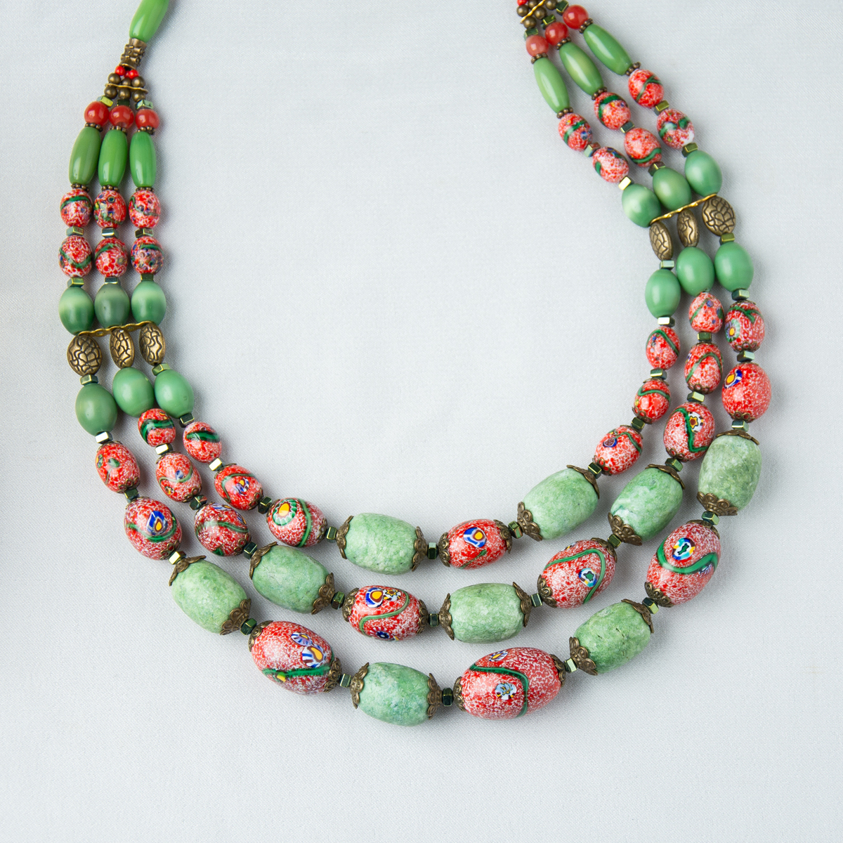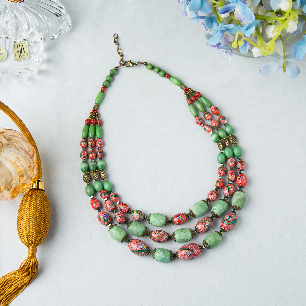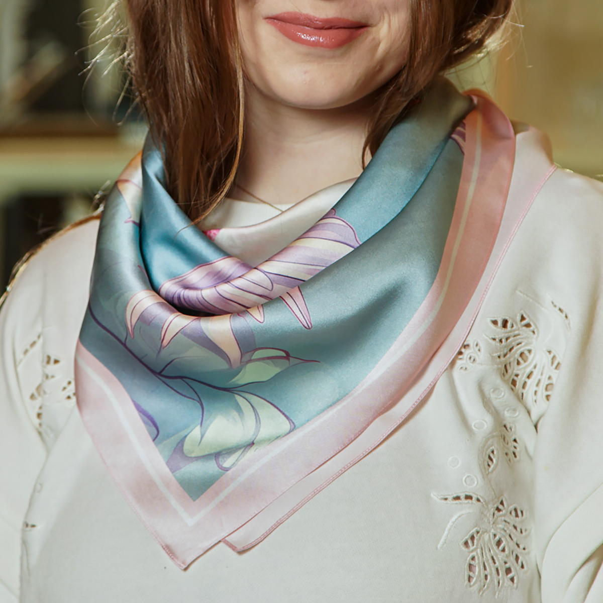 Подарочный комплект ожерелье "Загадка" 3-рядное из чешского "богемского" стекла и платок из натурального шелка "Pinky bird" от FAMA