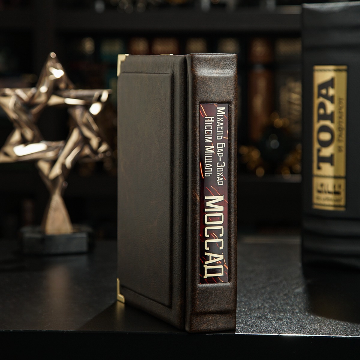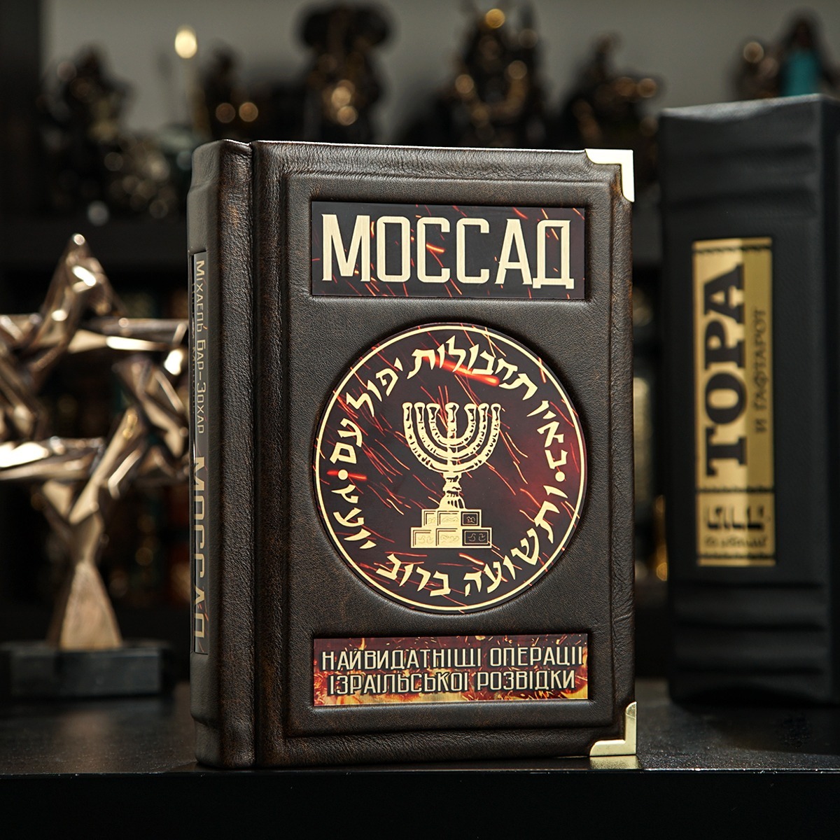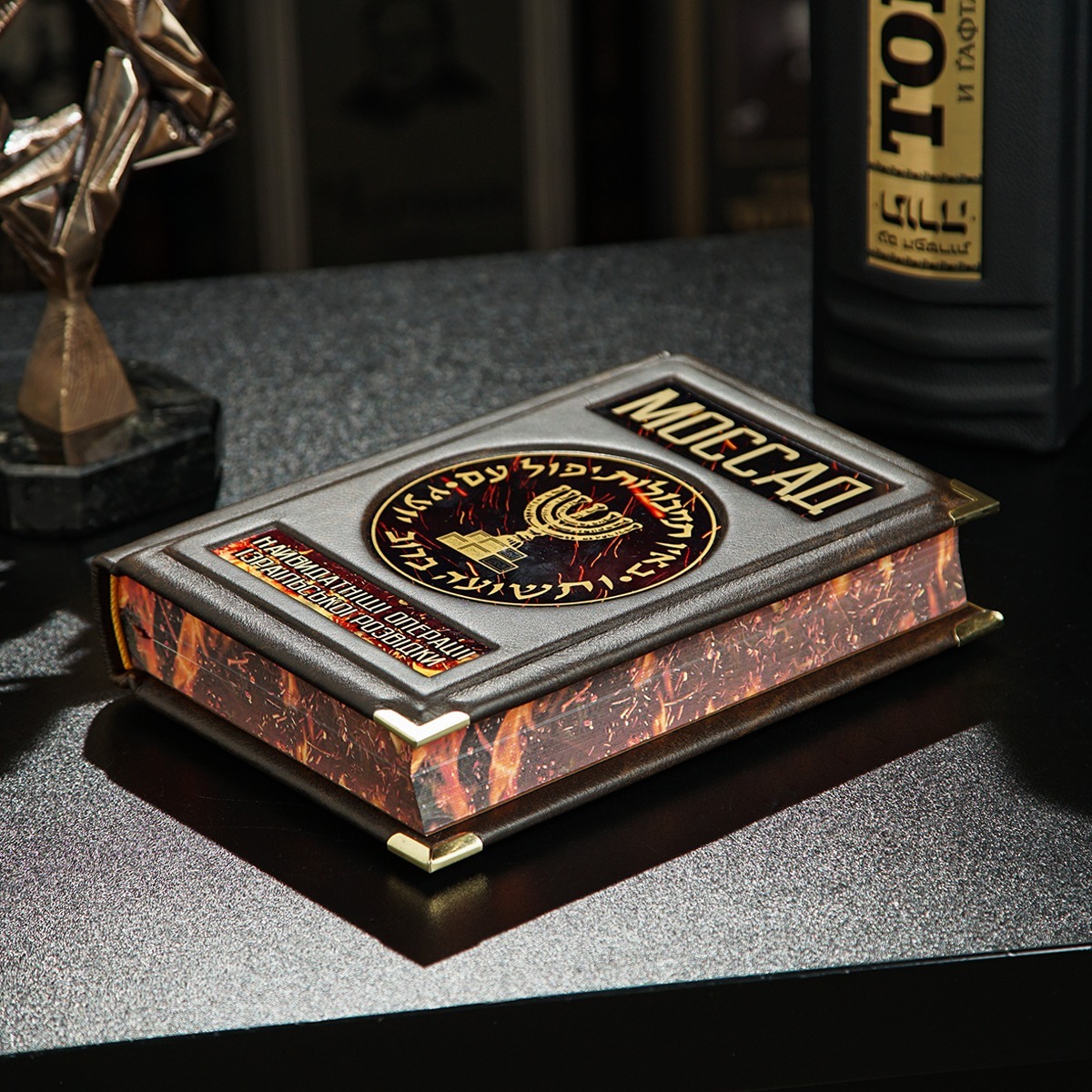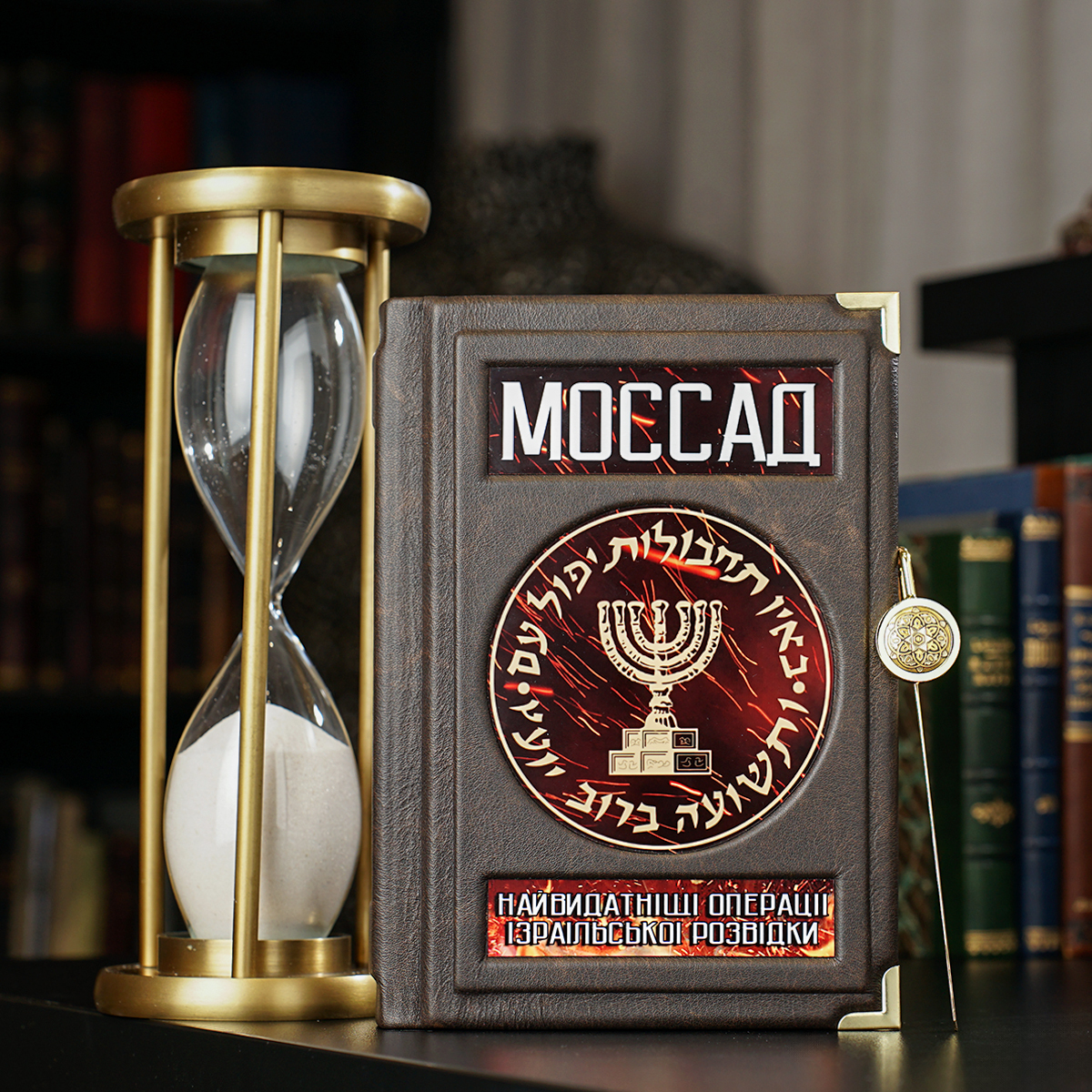 Подарочный комплект - винтажные песочные часы "Время шахмат", закладка для книги с восточным орнаментом от Anframa и книга в кожаном переплете "Моссад. Самые выдающиеся операции израильской разведки", Михаэль Бар-Зохар, Ниссим Мишаль (на украинском языке)