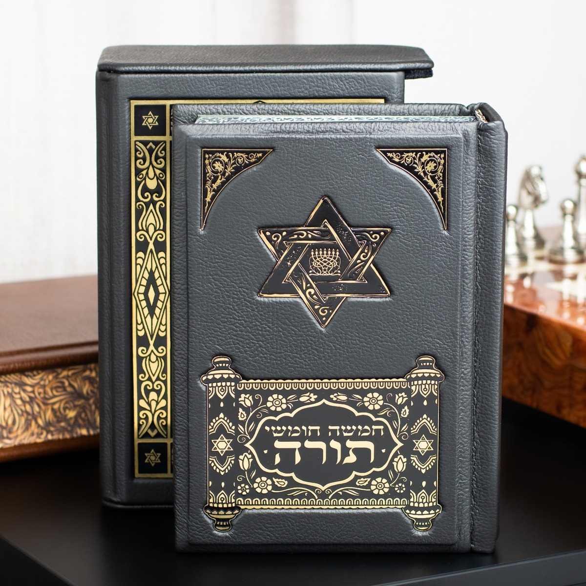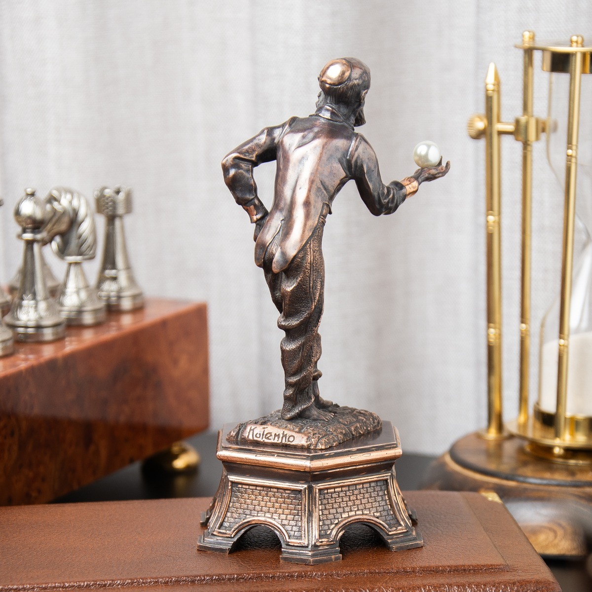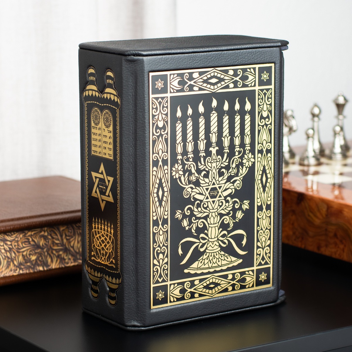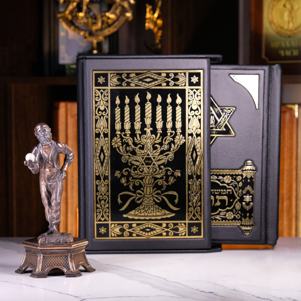 Подарочный комплект из Торы в кожаном футляре на двух языках и бронзовой статуэтки "Ювелир" ручной работы