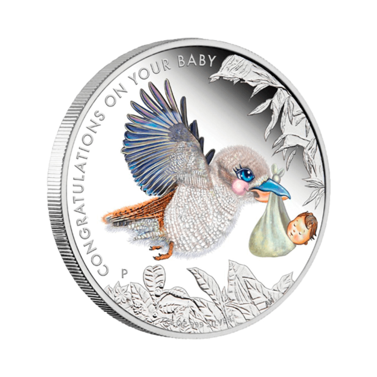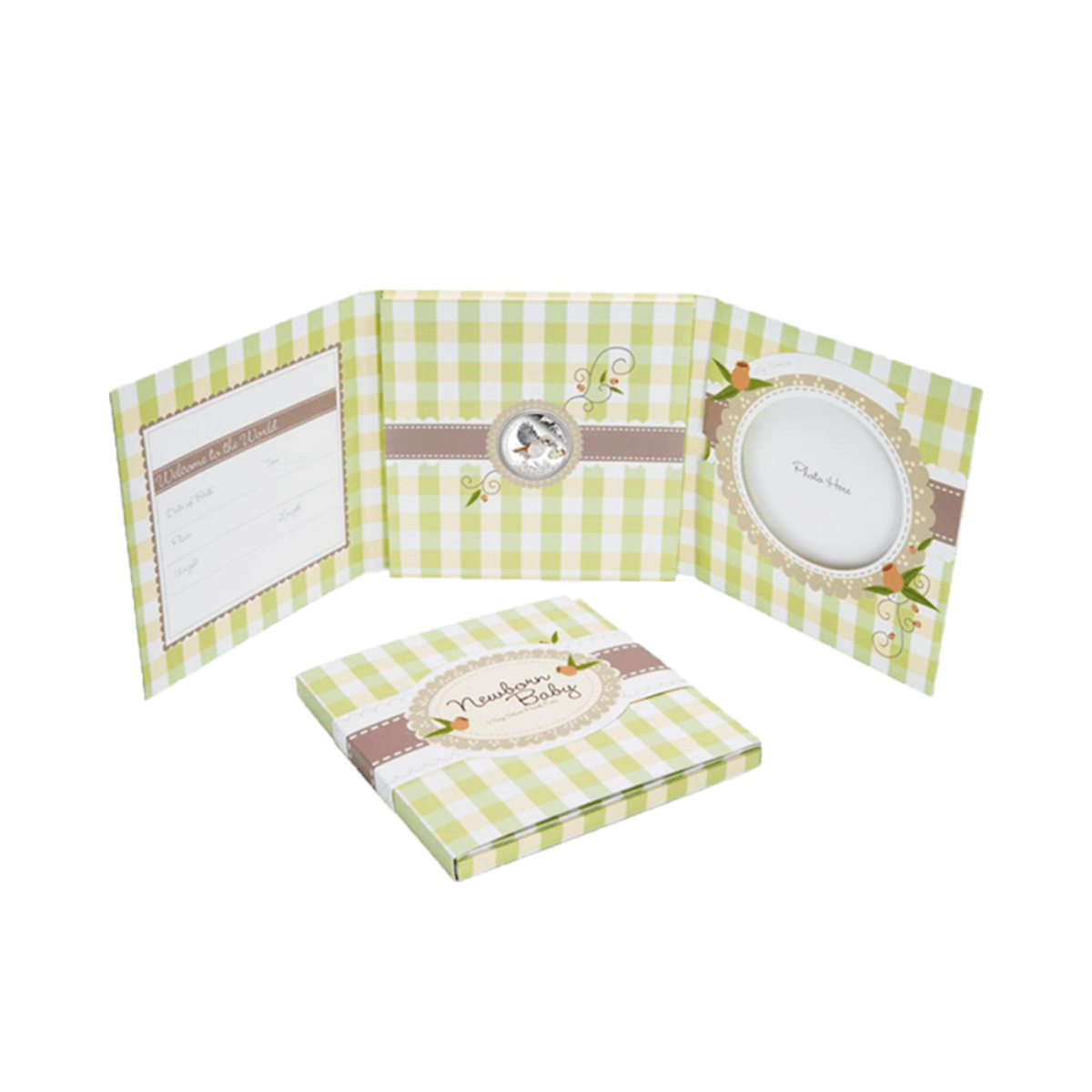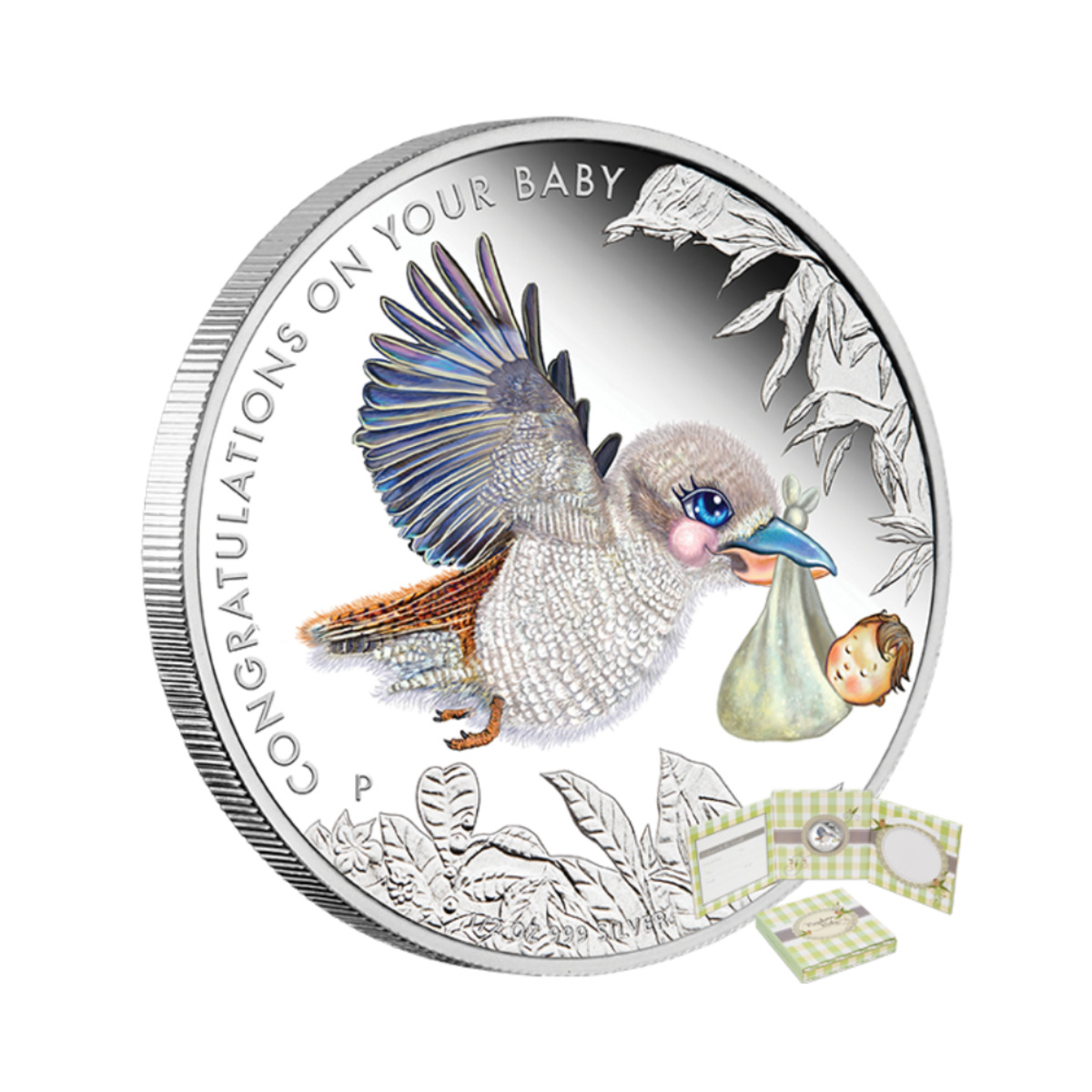Серебряная монета в книжке "Рождение ребенка"