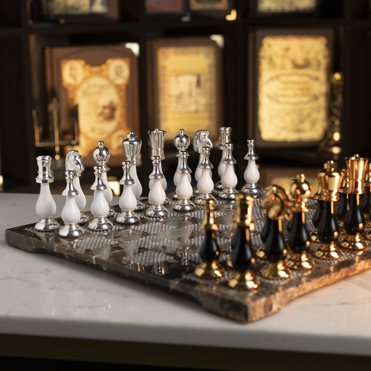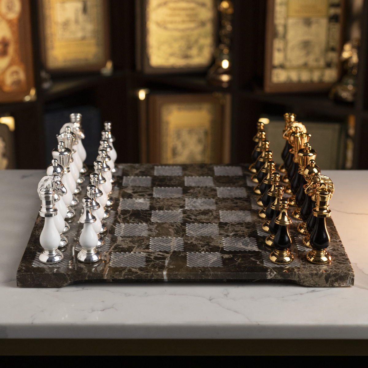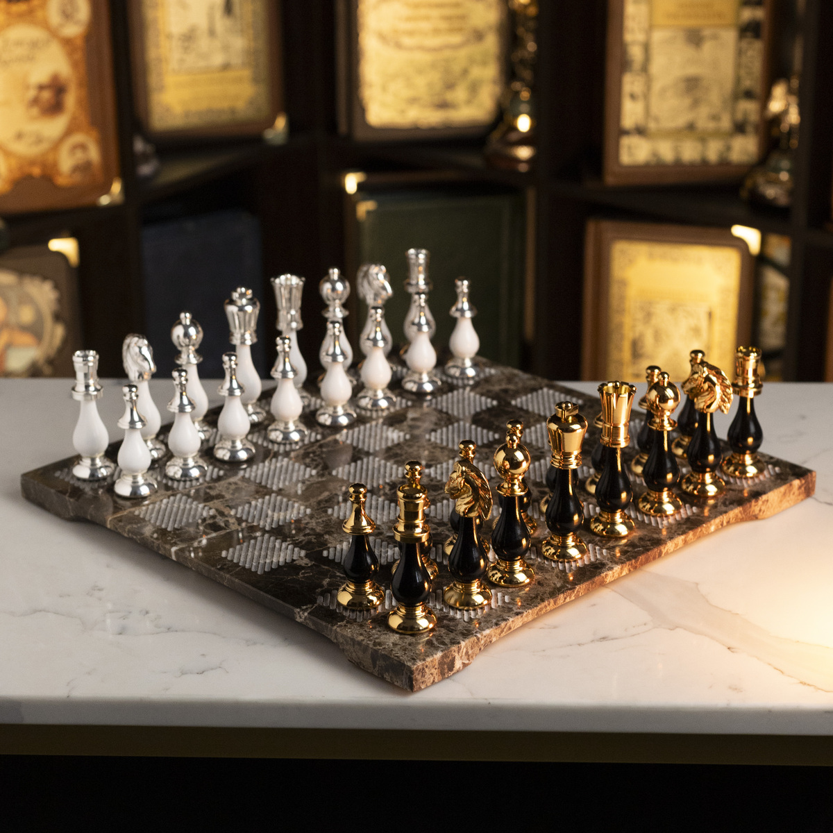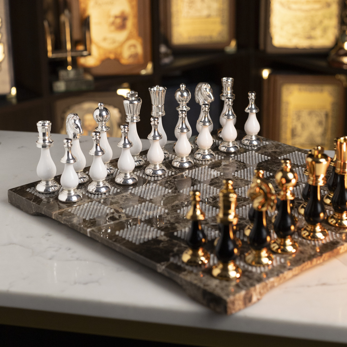 Шахматный набор "Nexa" с мраморной доской и металлическими фигурками с позолотой и посеребрением от ITALFAMA