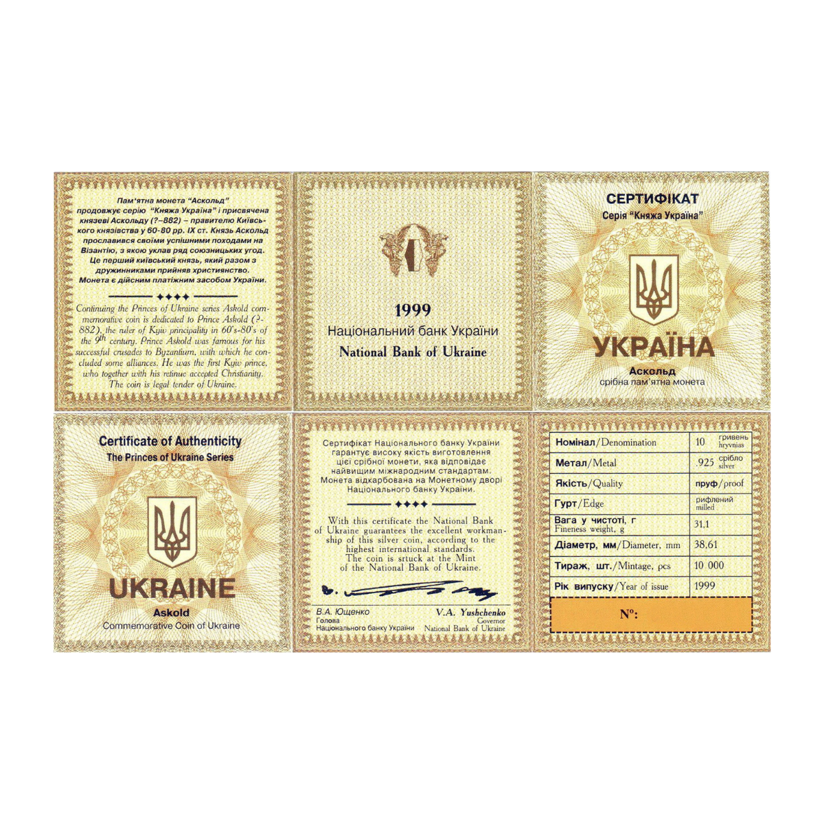 Серебряная монета "Askold", 10 гривен (1999)