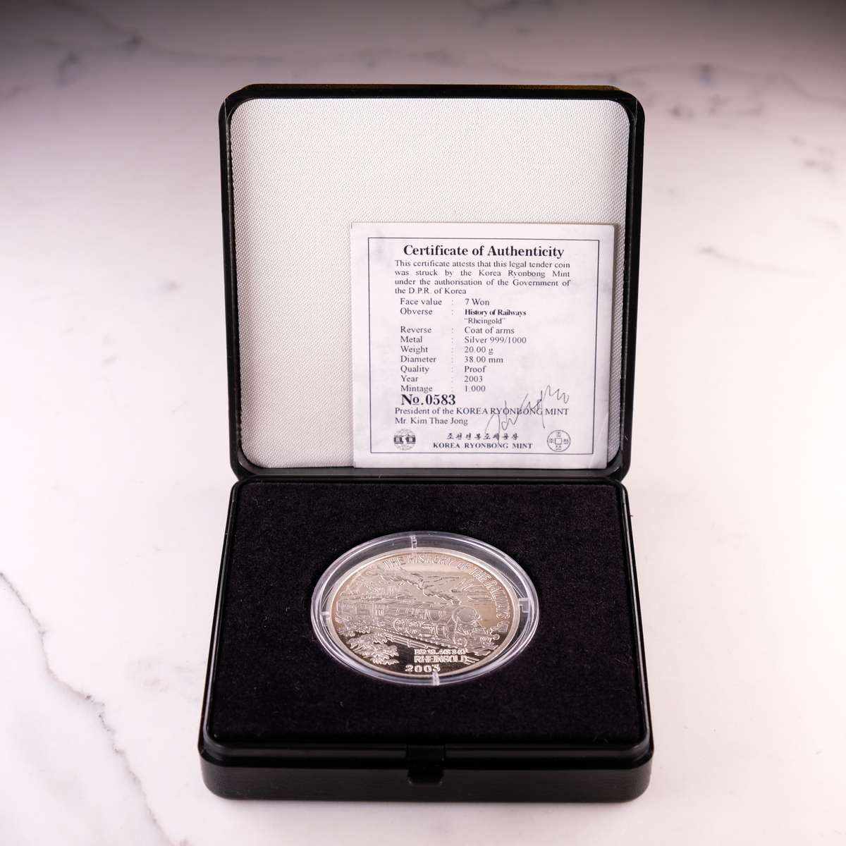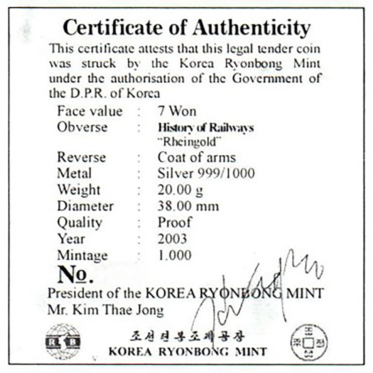 Серебряная монета "History of the Rheingold Railways", 7 вон