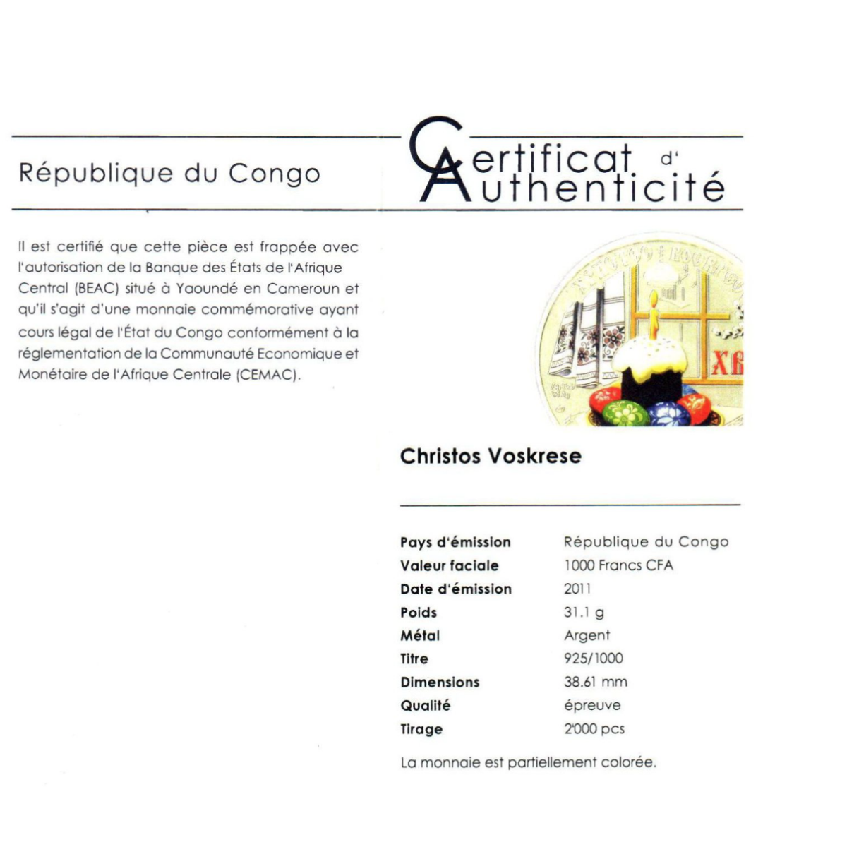 Серебряная монета "Христос Воскрес" (1000 франков) 2011, Конго