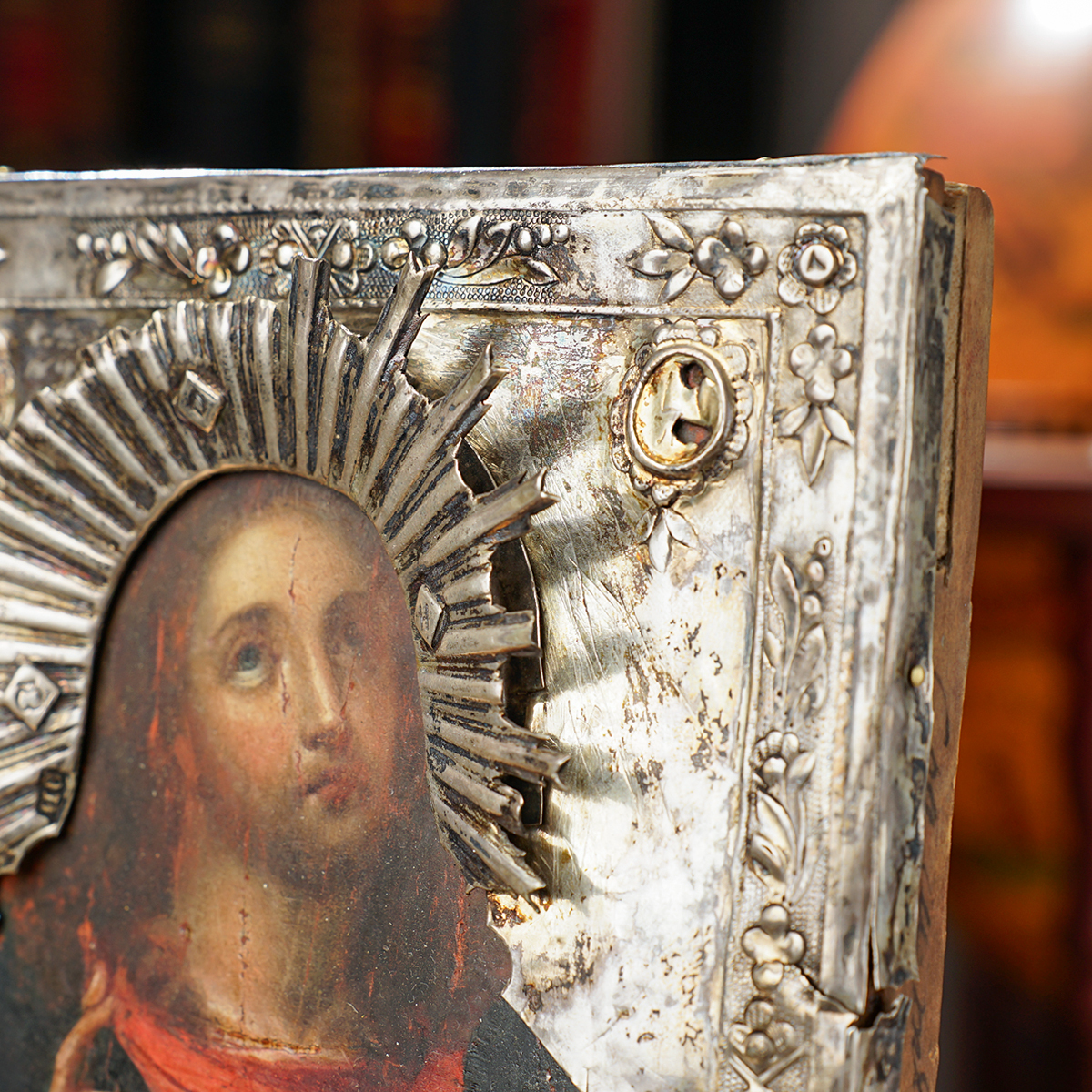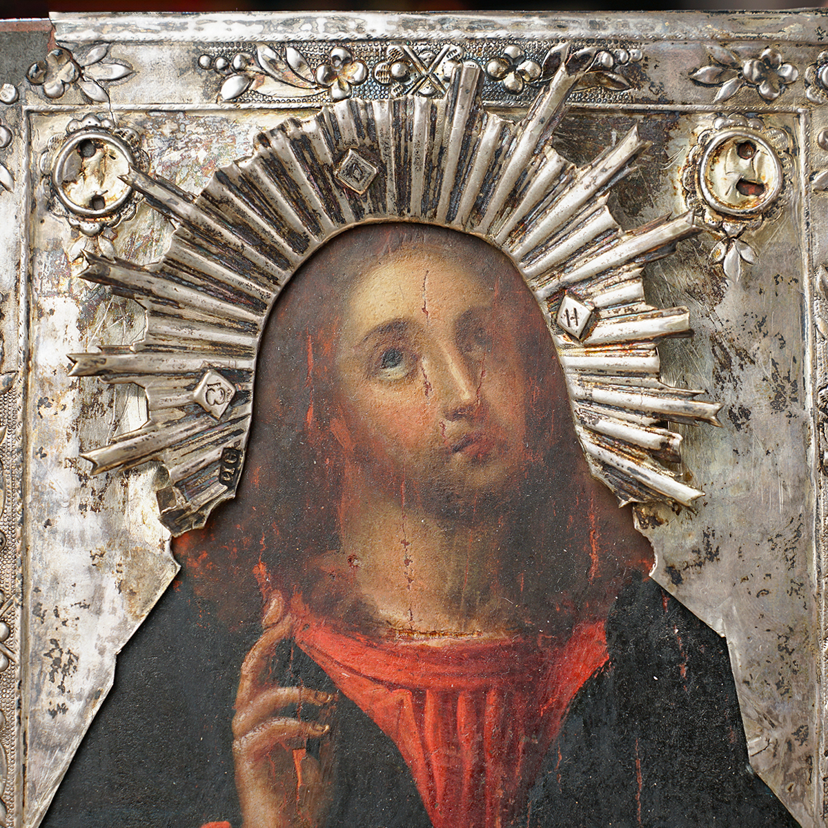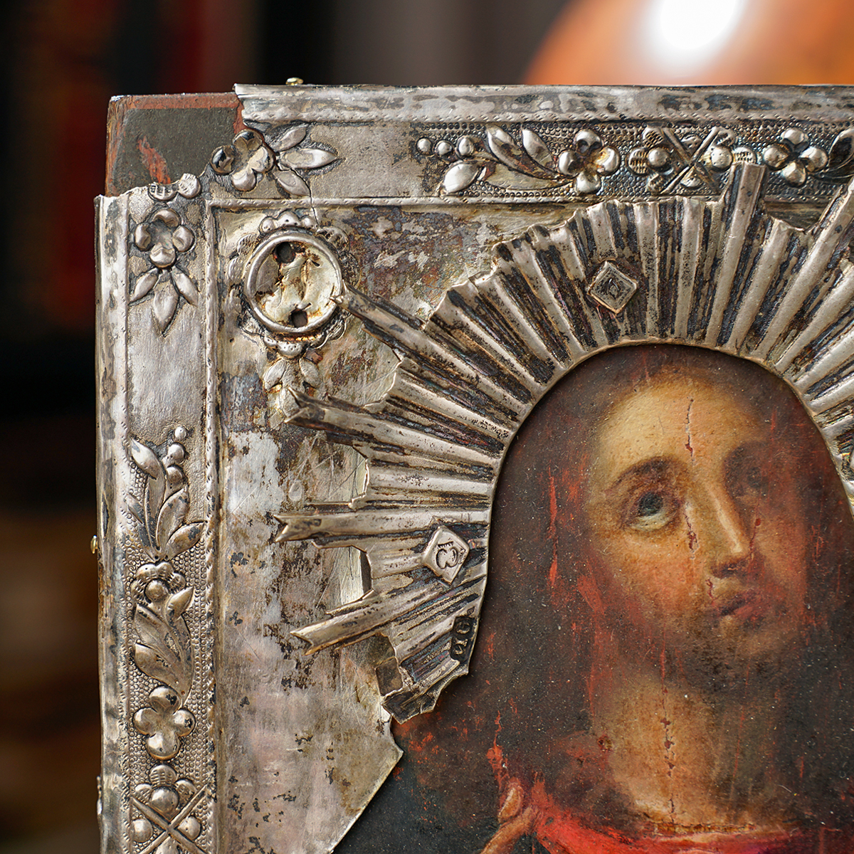 Старинная икона в серебряной ризе Хлебный Спас середины 19 века, Центральные регионы православия (без реставрации)