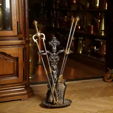 Возле каждого камина необходимо наличие специальных предметов по уходу и эксплуатации: совок, щетка, кочерга и щипцы, поэтому дорогой подарок станет еще более ценным для владельца. Эксклюзивные предложения внесут определенную изюминку – изящность, роскошь, стиль. Подставка и все элементы набора имеют богатый вид – они изготовлены из бронзы и отполированы до такой степени, что издали можно принять металл изделия за золото. Общая грация набора идеально подходит к любому стилю: модерн, хай-тек или классике.