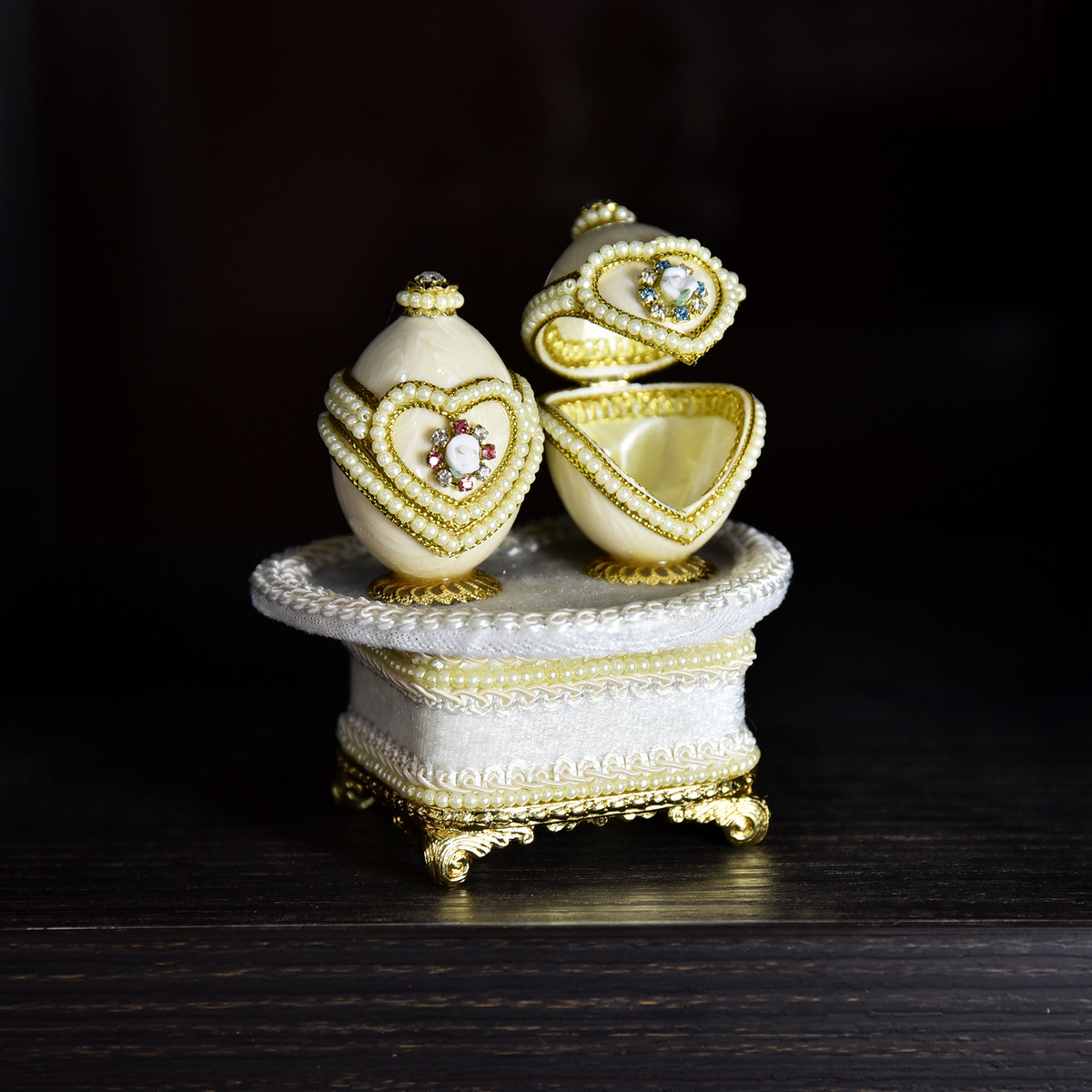 Цікавою є скринька-яйце «Love forever». Це ексклюзивна шкатулка ручної роботи з двох натуральних голубиних яєць на музичній підставці у формі серця виконана в класичному стилі.