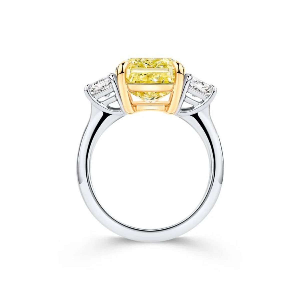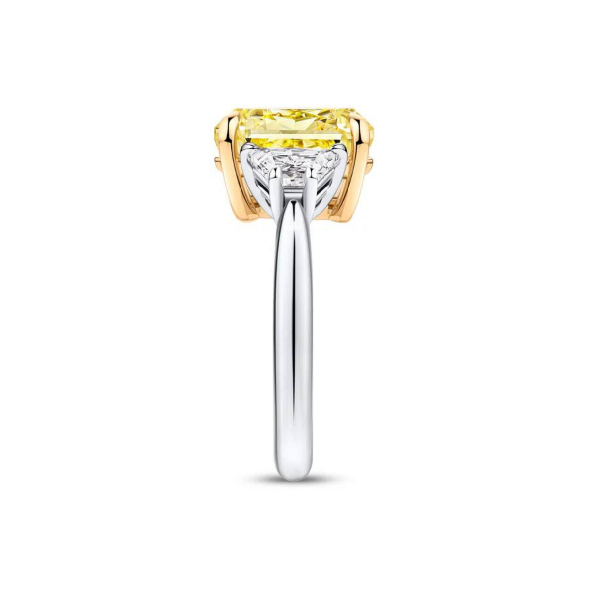 Каблучка "Clarion" з білого та жовтого золота, з лабораторним 5-ти каратним діамантом в огранці "Кушон", в кольорі Fancy vivid yellow
