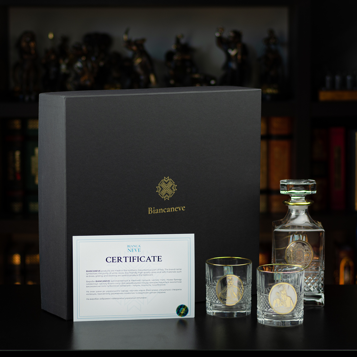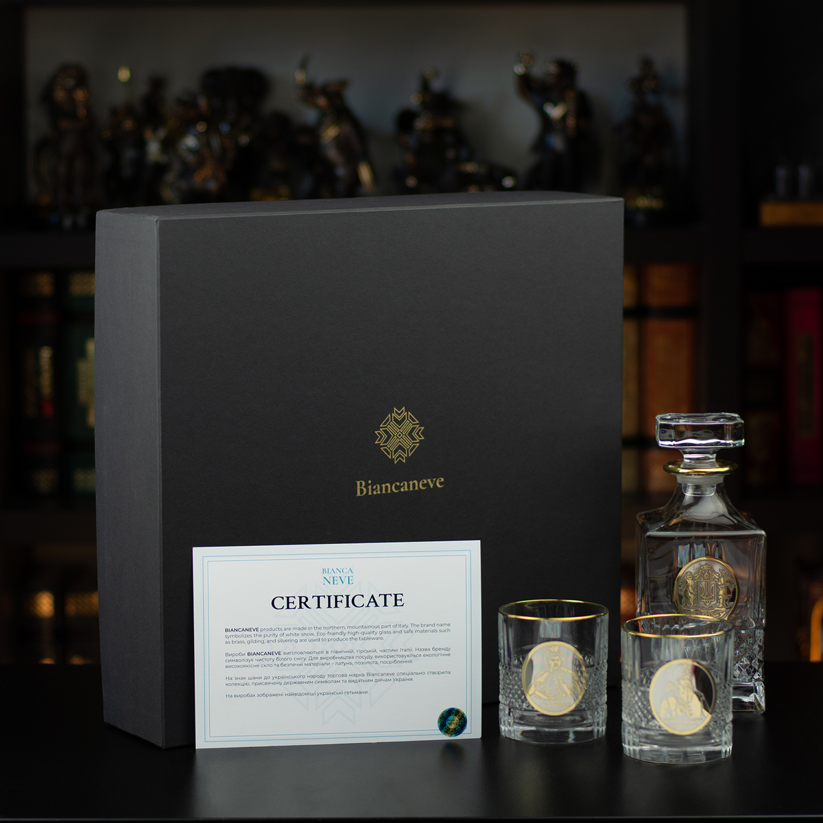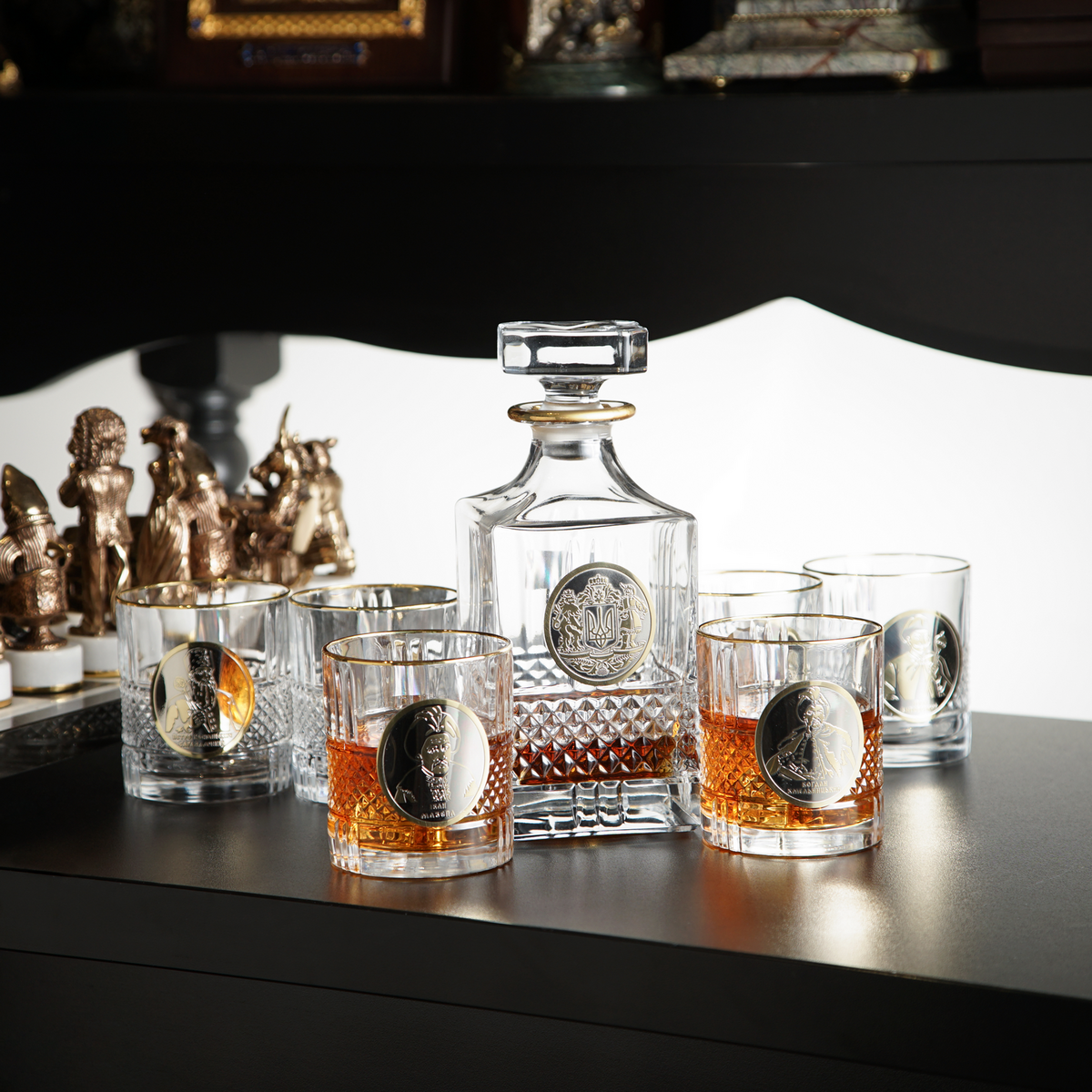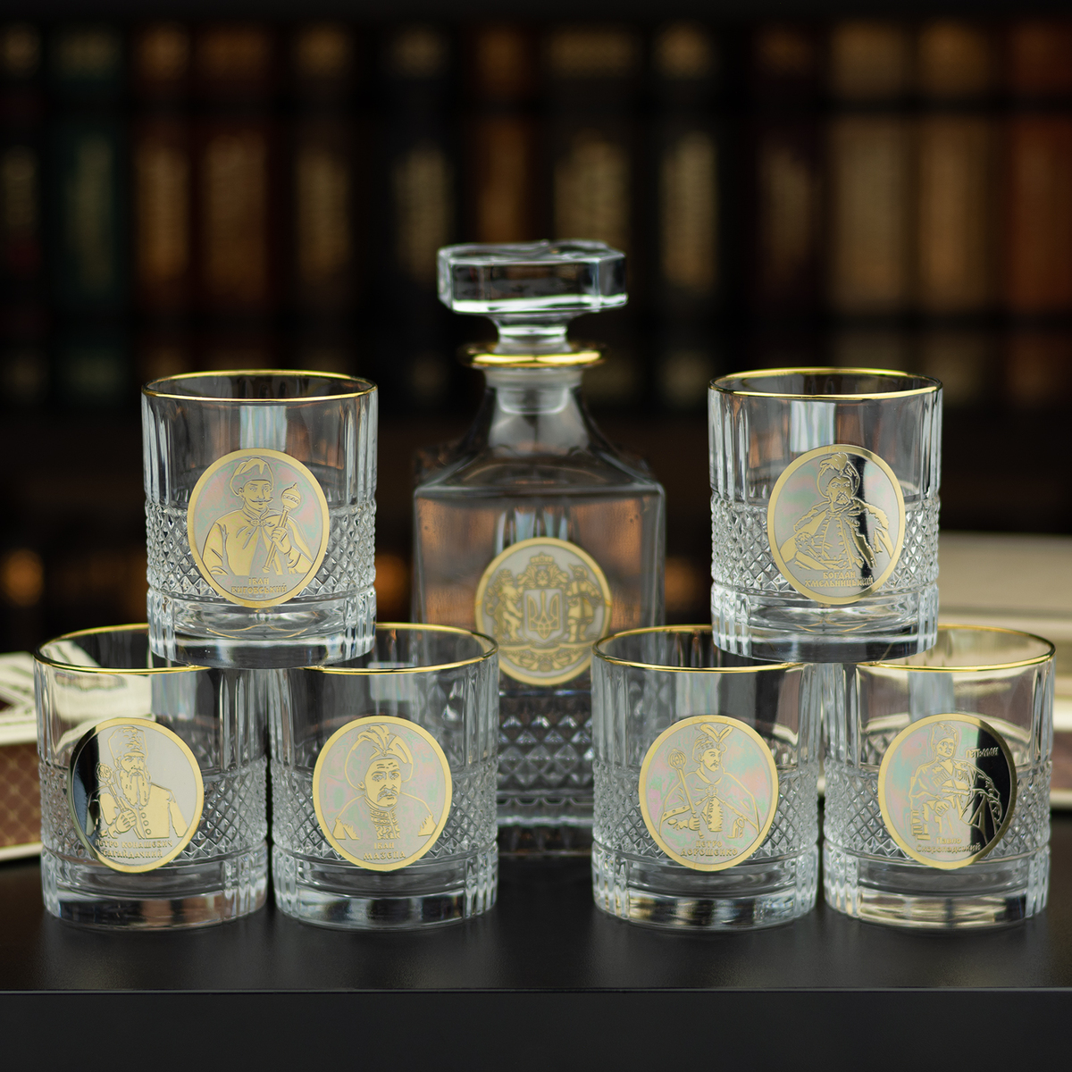 Кришталевий графин та 6 склянок для віскі та води із серії "Гетьмани України" (Виговський, Дорошенко, Мазепа, Скоропадський, Хмельницький, Конашевич-Сагайдачний) від BIANCANEVE