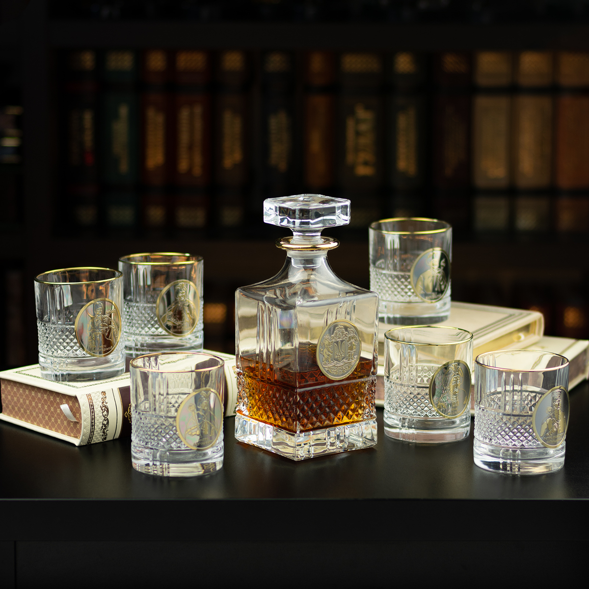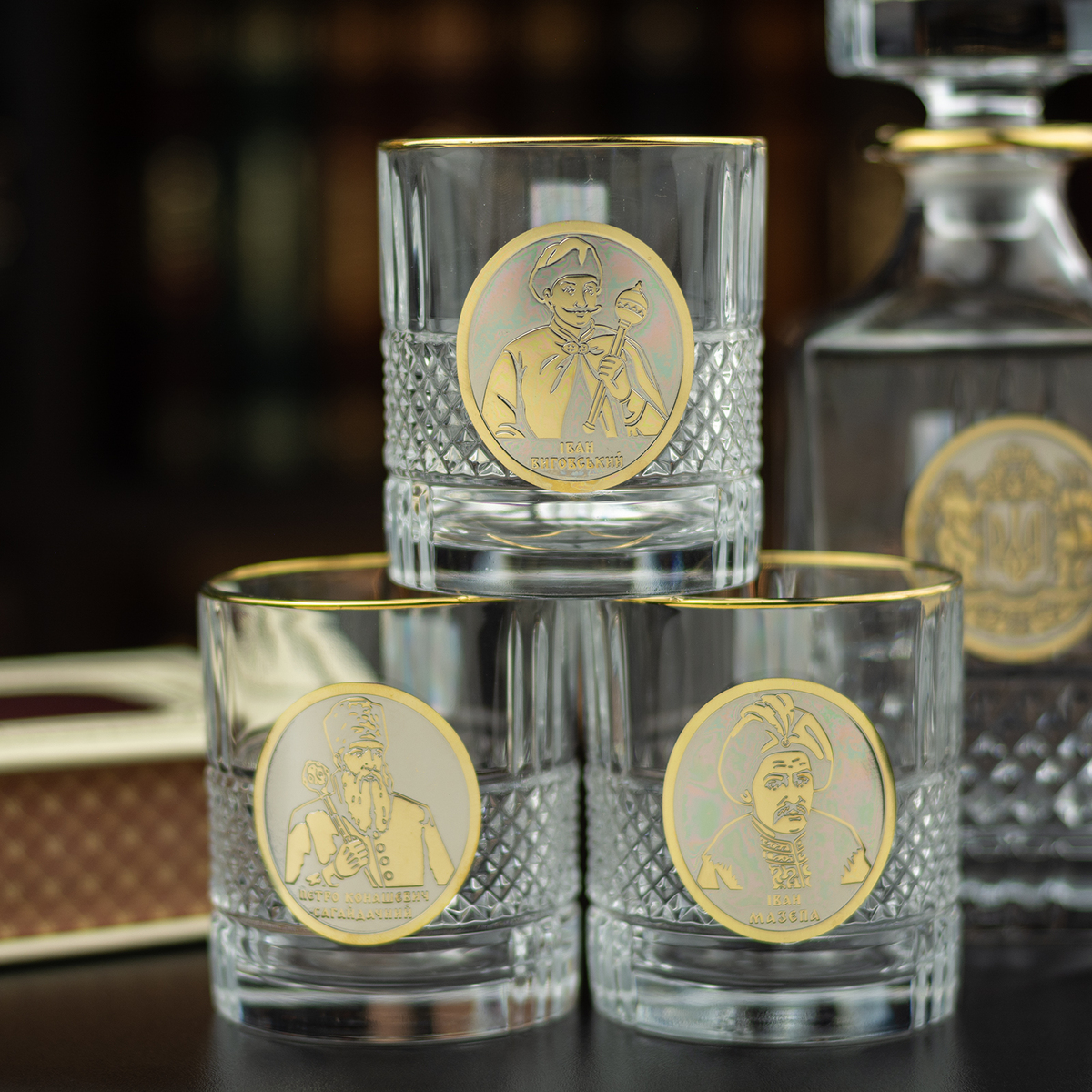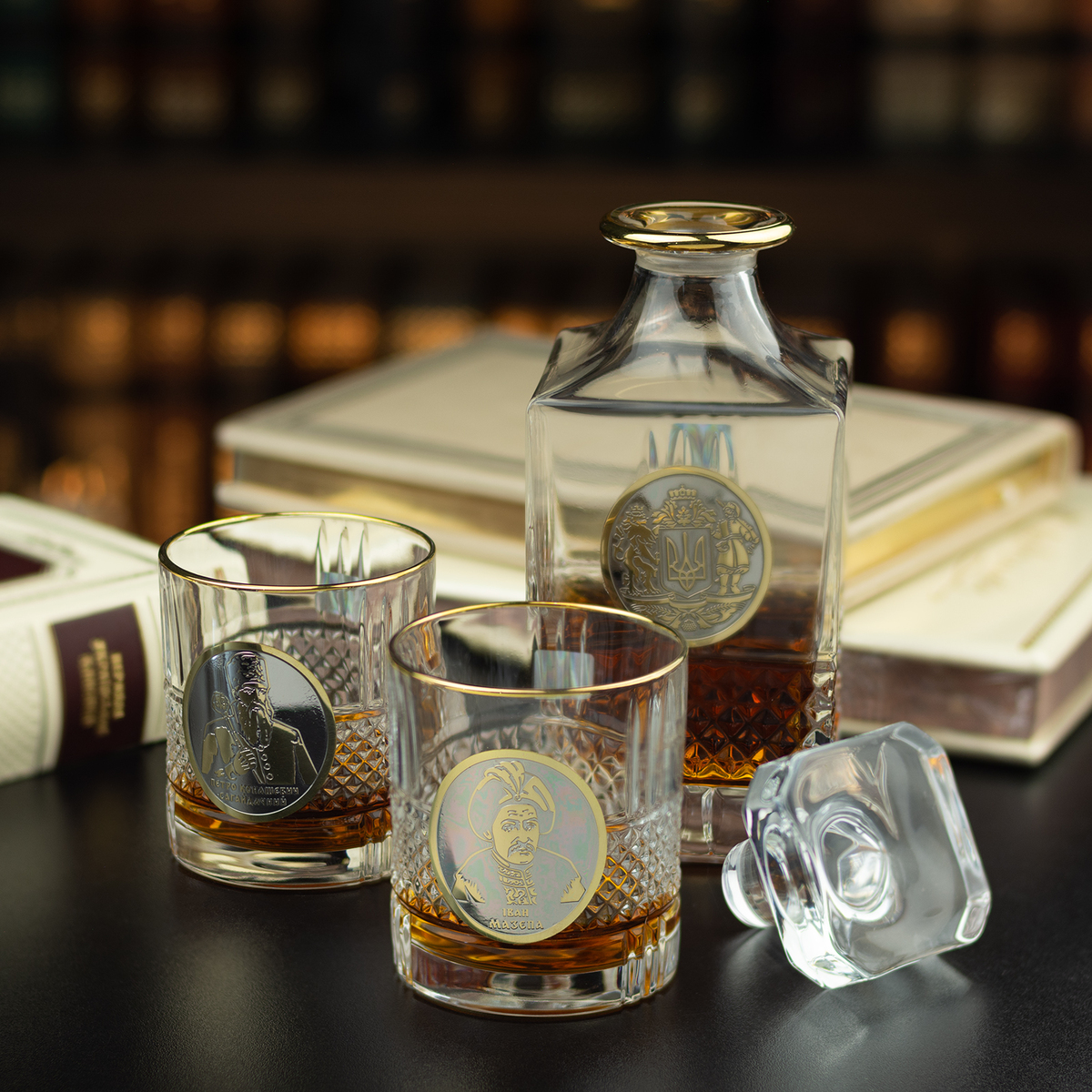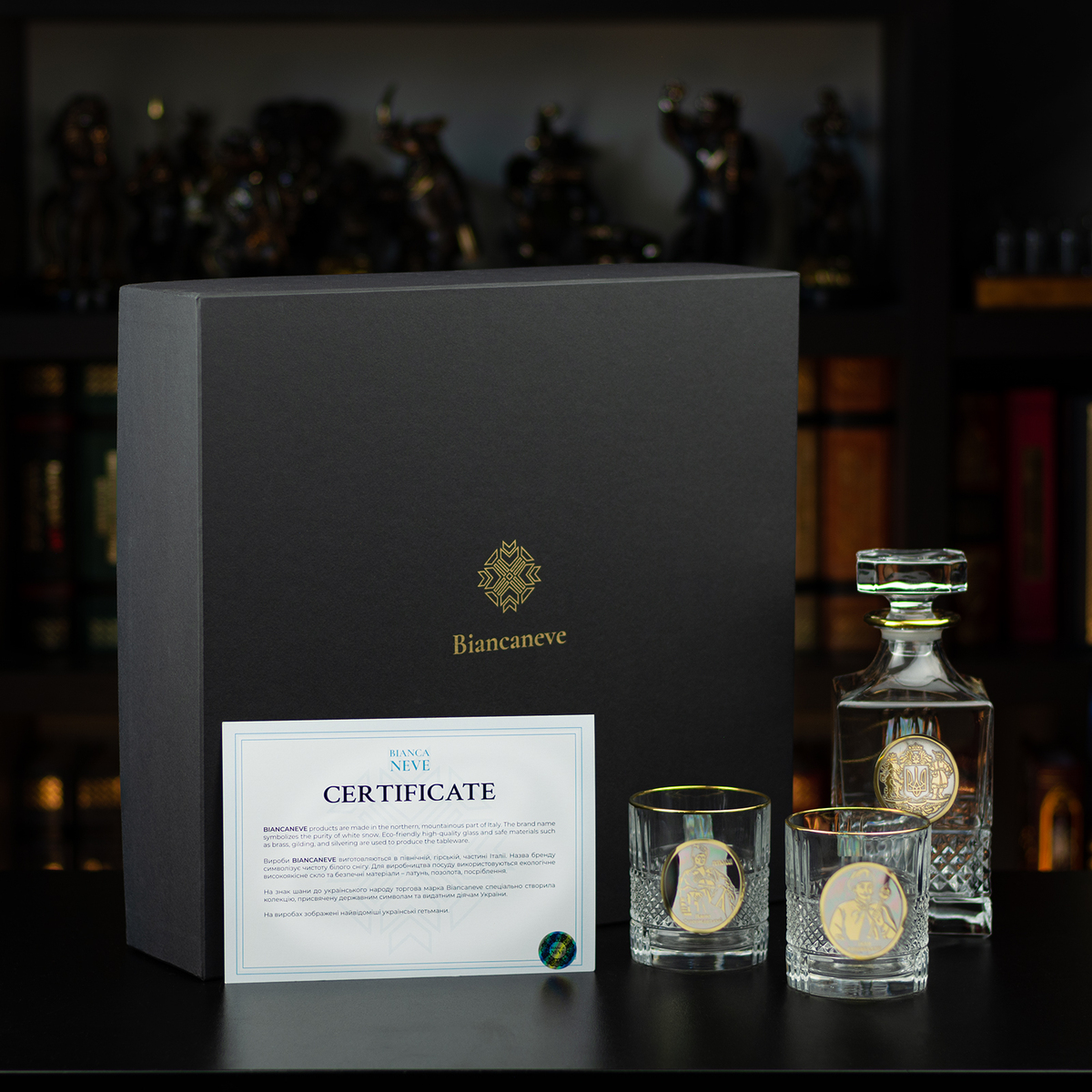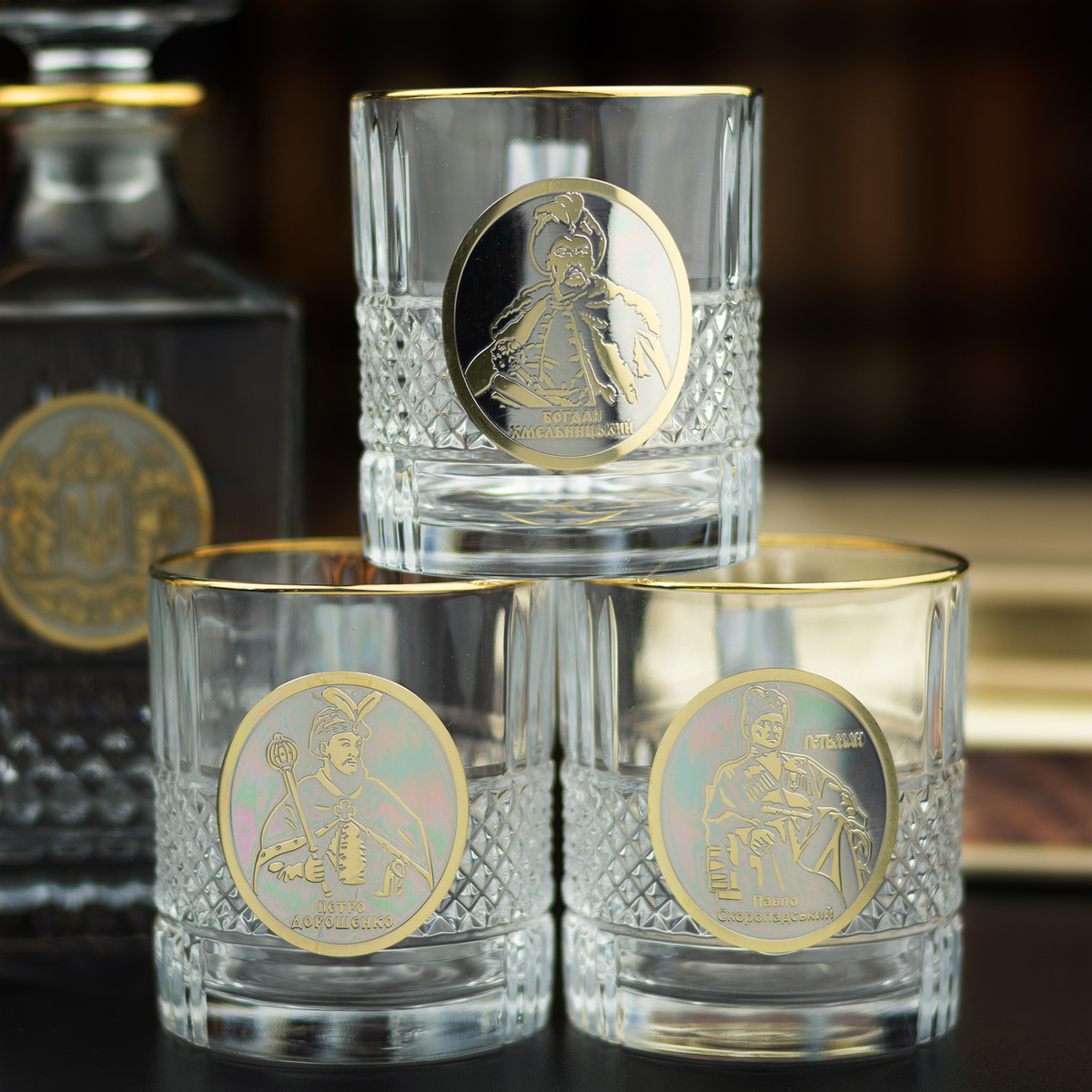 Кришталевий графин та 6 склянок для віскі та води із серії "Гетьмани України" (Виговський, Дорошенко, Мазепа, Скоропадський, Хмельницький, Конашевич-Сагайдачний) від BIANCANEVE