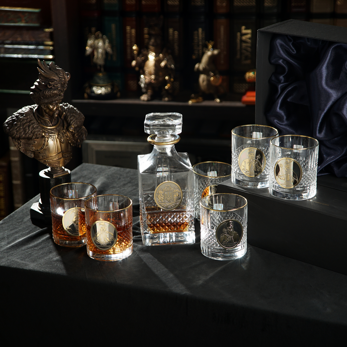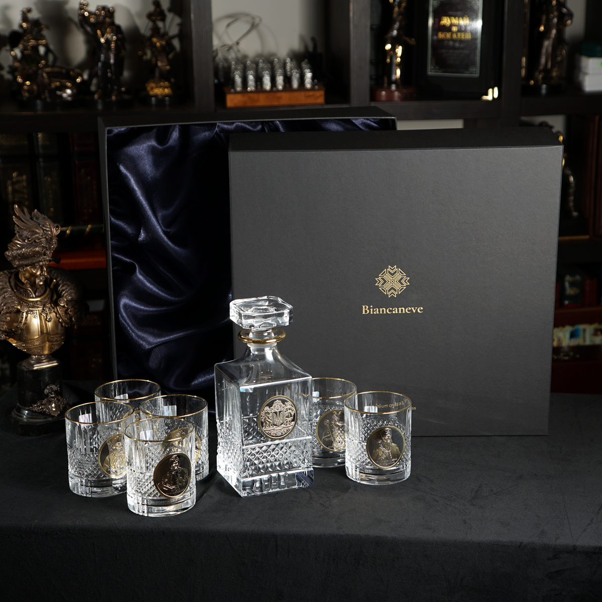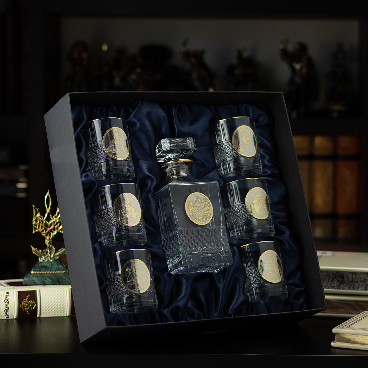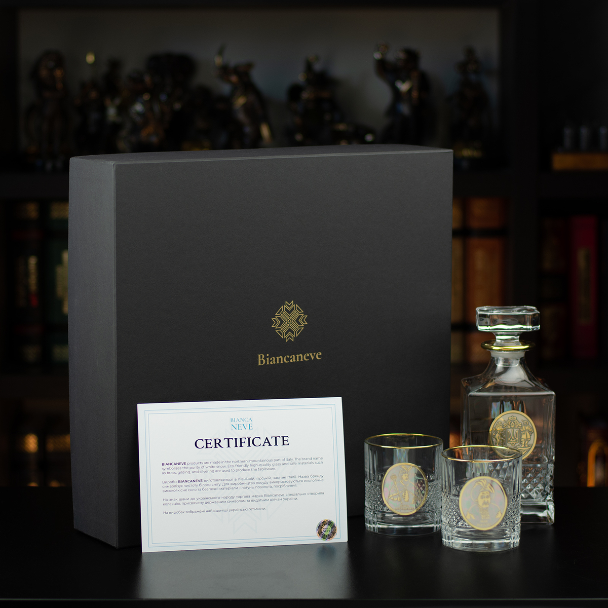 Кришталевий графин та 6 склянок для віскі та води із серії "Гетьмани України" (Виговський, Дорошенко, Мазепа, Скоропадський, Хмельницький, Конашевич-Сагайдачний) від BIANCANEVE