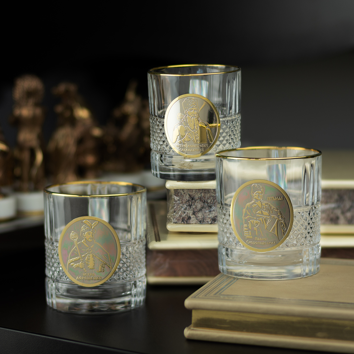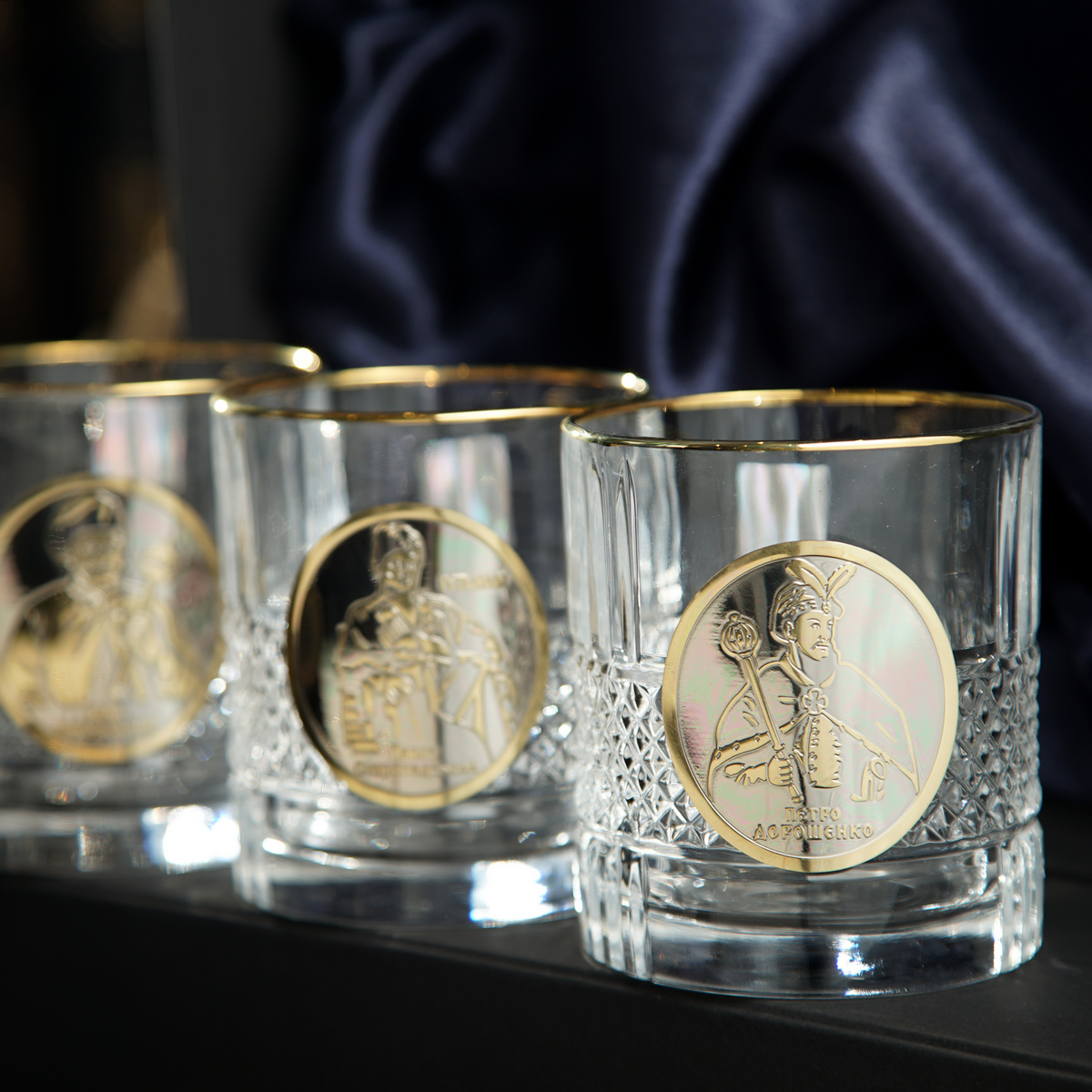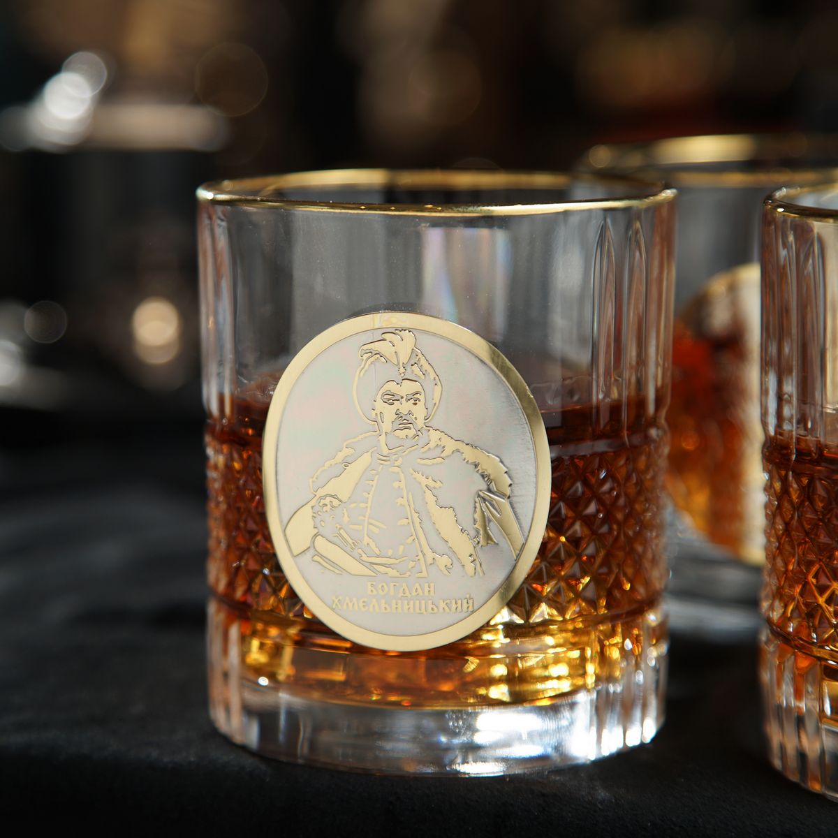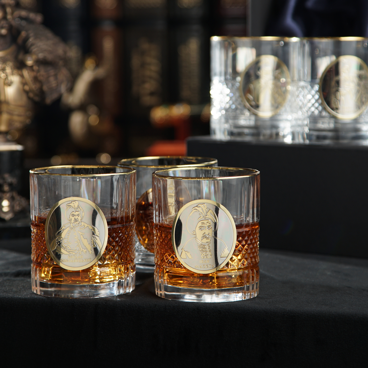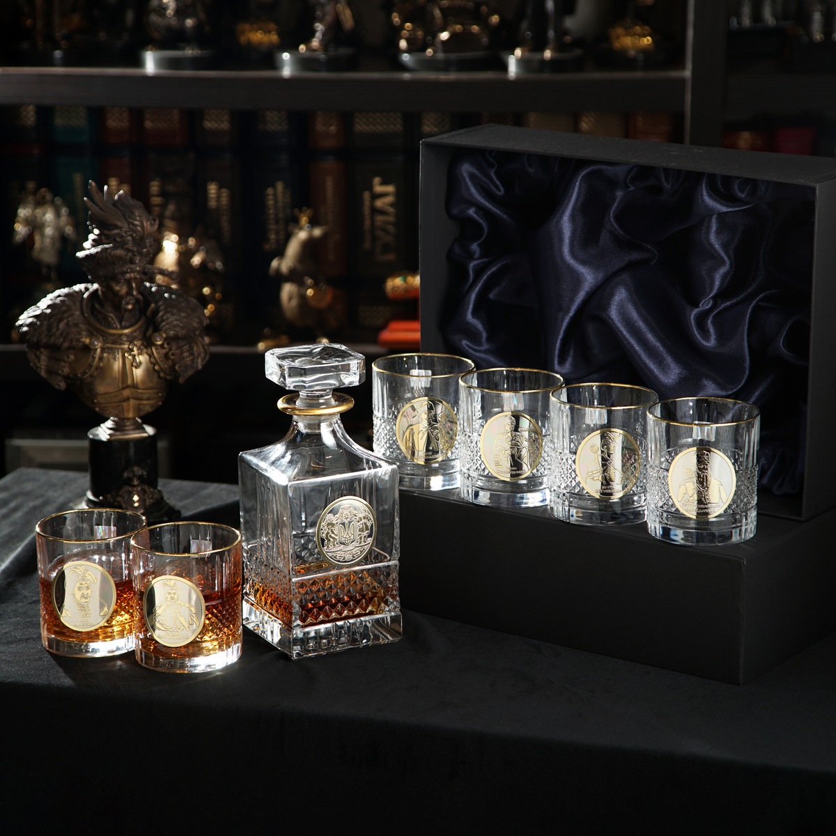 Кришталевий графин та 6 склянок для віскі та води із серії "Гетьмани України" (Виговський, Дорошенко, Мазепа, Скоропадський, Хмельницький, Конашевич-Сагайдачний) від BIANCANEVE