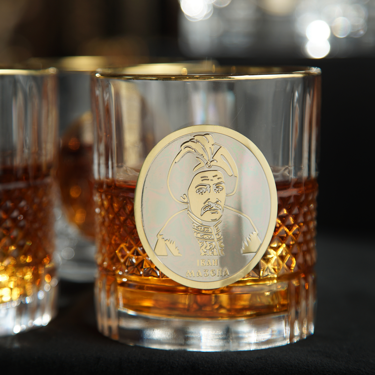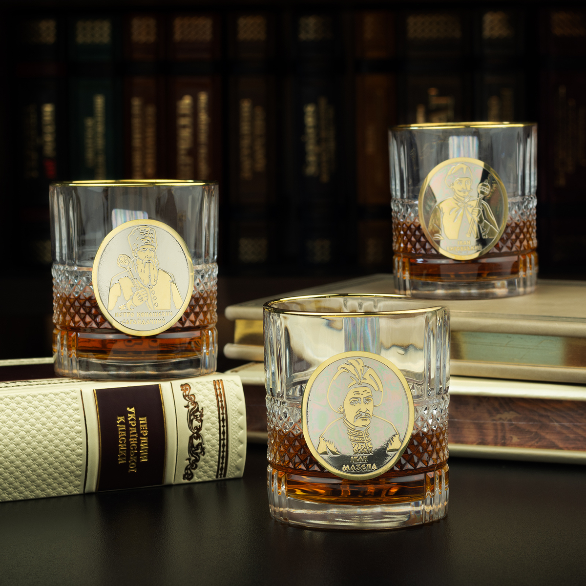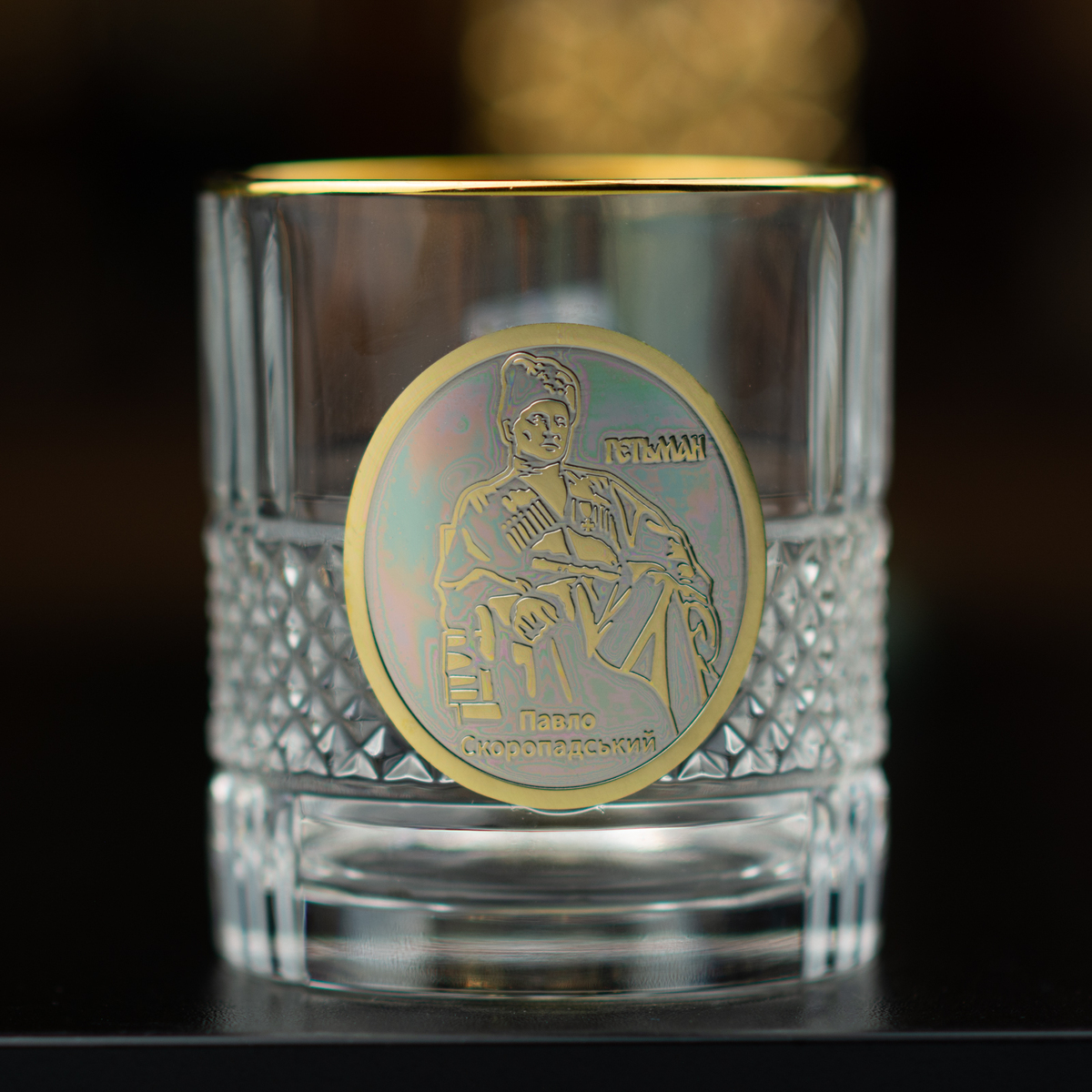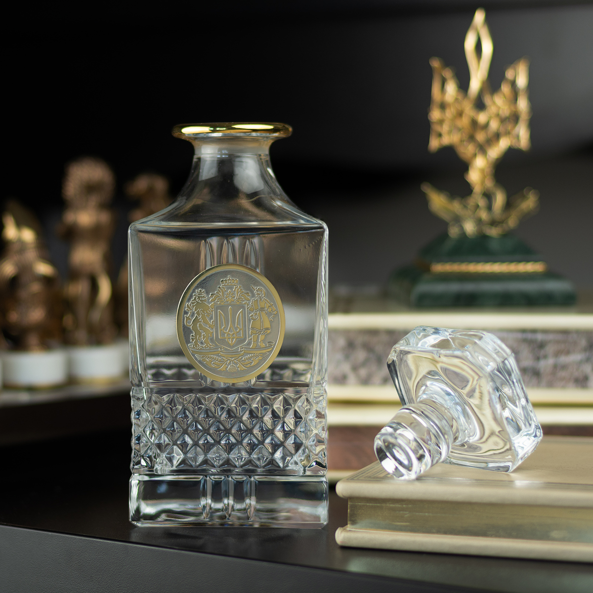 Кришталевий графин та 6 склянок для віскі та води із серії "Гетьмани України" (Виговський, Дорошенко, Мазепа, Скоропадський, Хмельницький, Конашевич-Сагайдачний) від BIANCANEVE