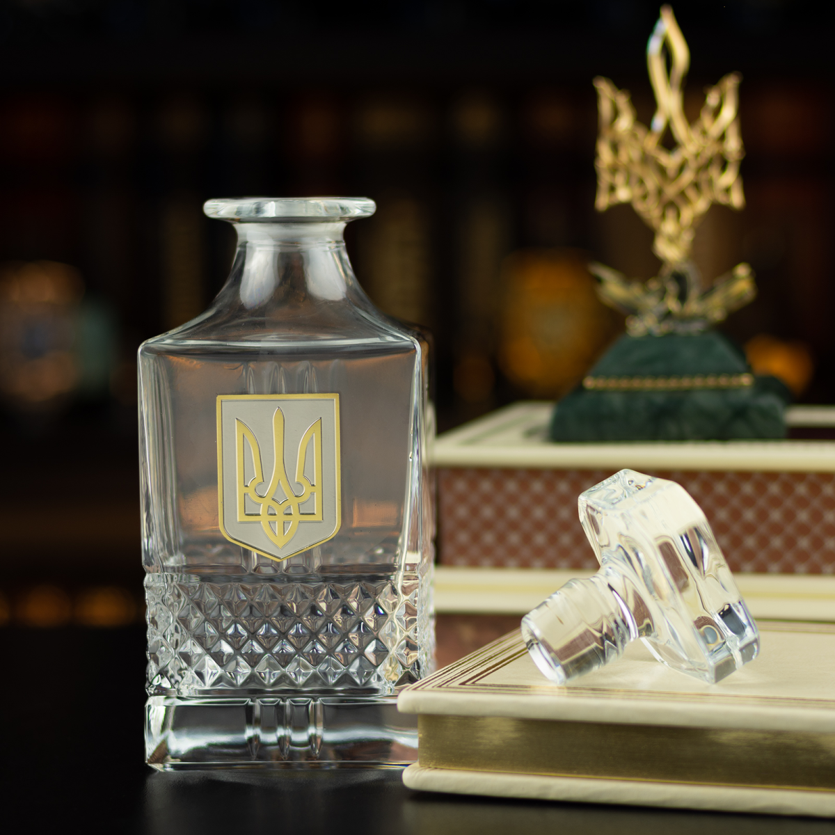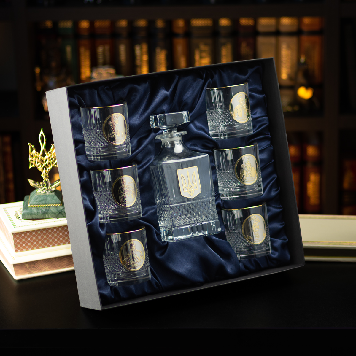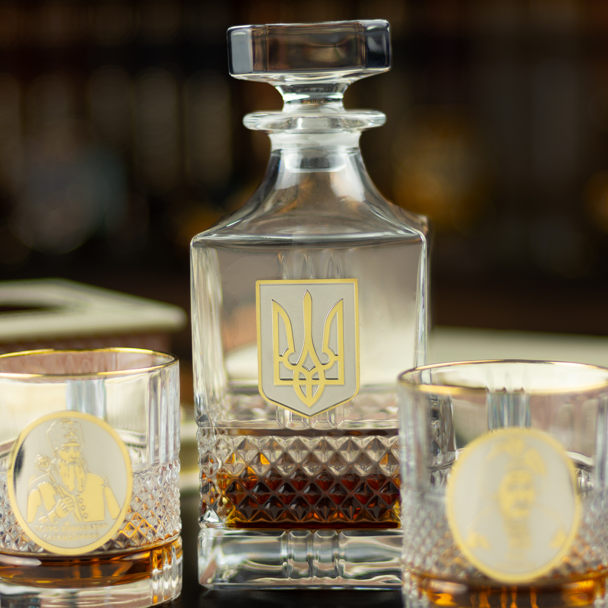 Кришталевий графин та 6 склянок для віскі та води із серії "Видатні гетьмани України" (Виговський, Дорошенко, Мазепа, Скоропадський, Хмельницький, Конашевич-Сагайдачний) від BIANCANEVE