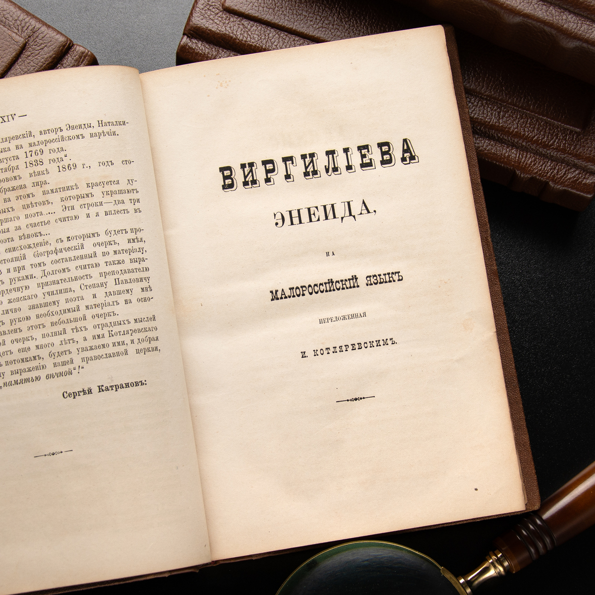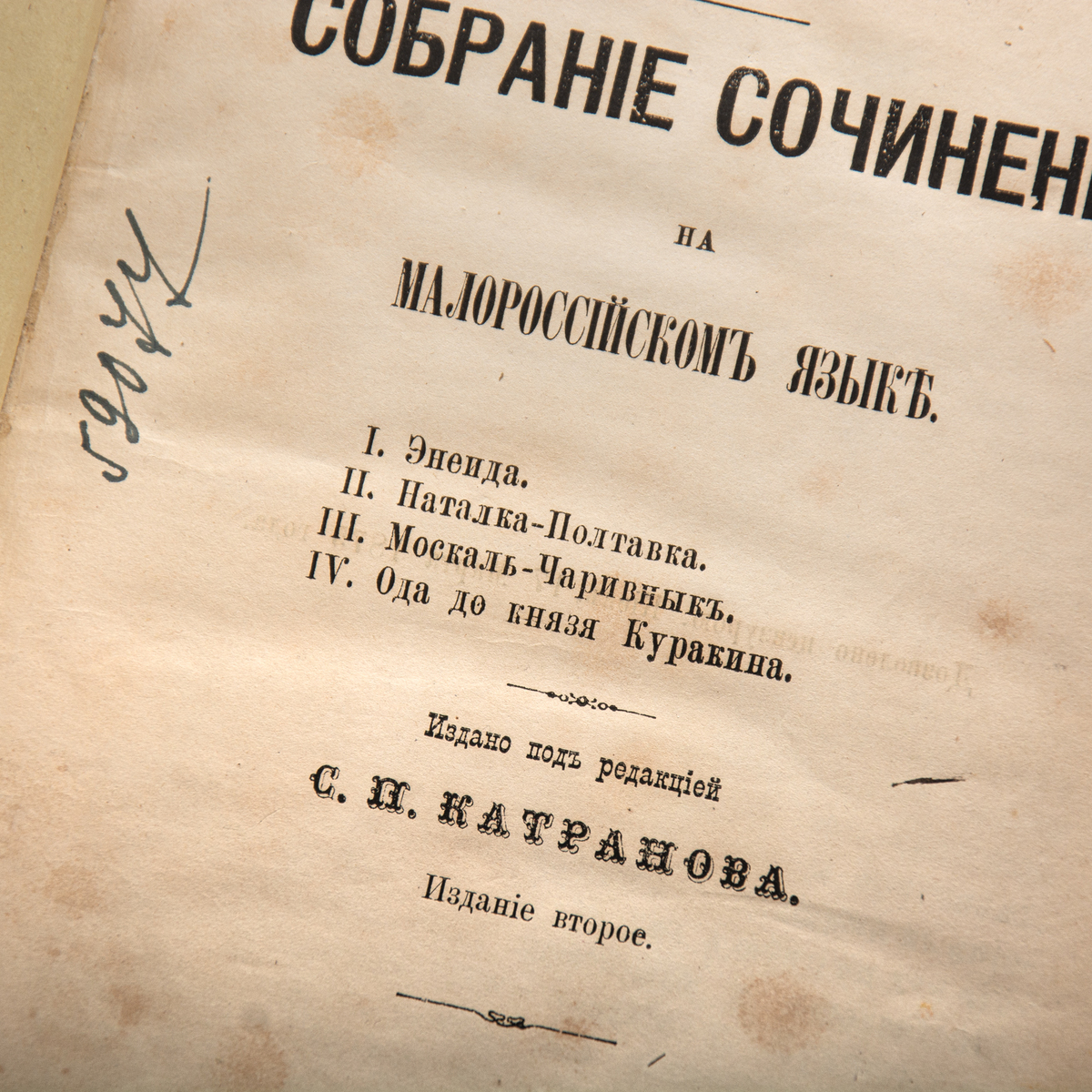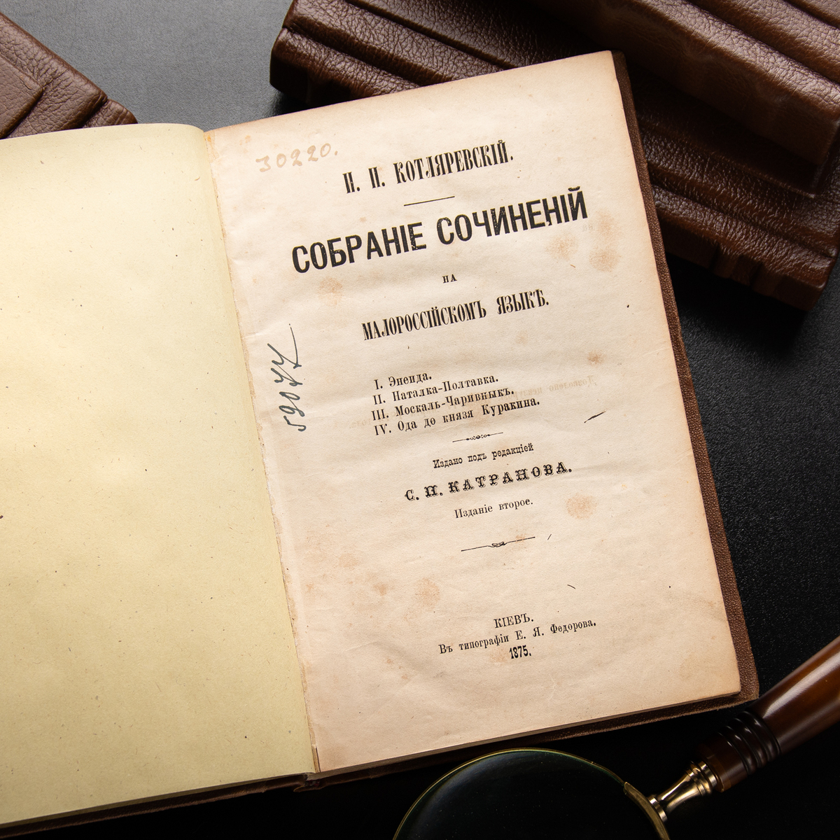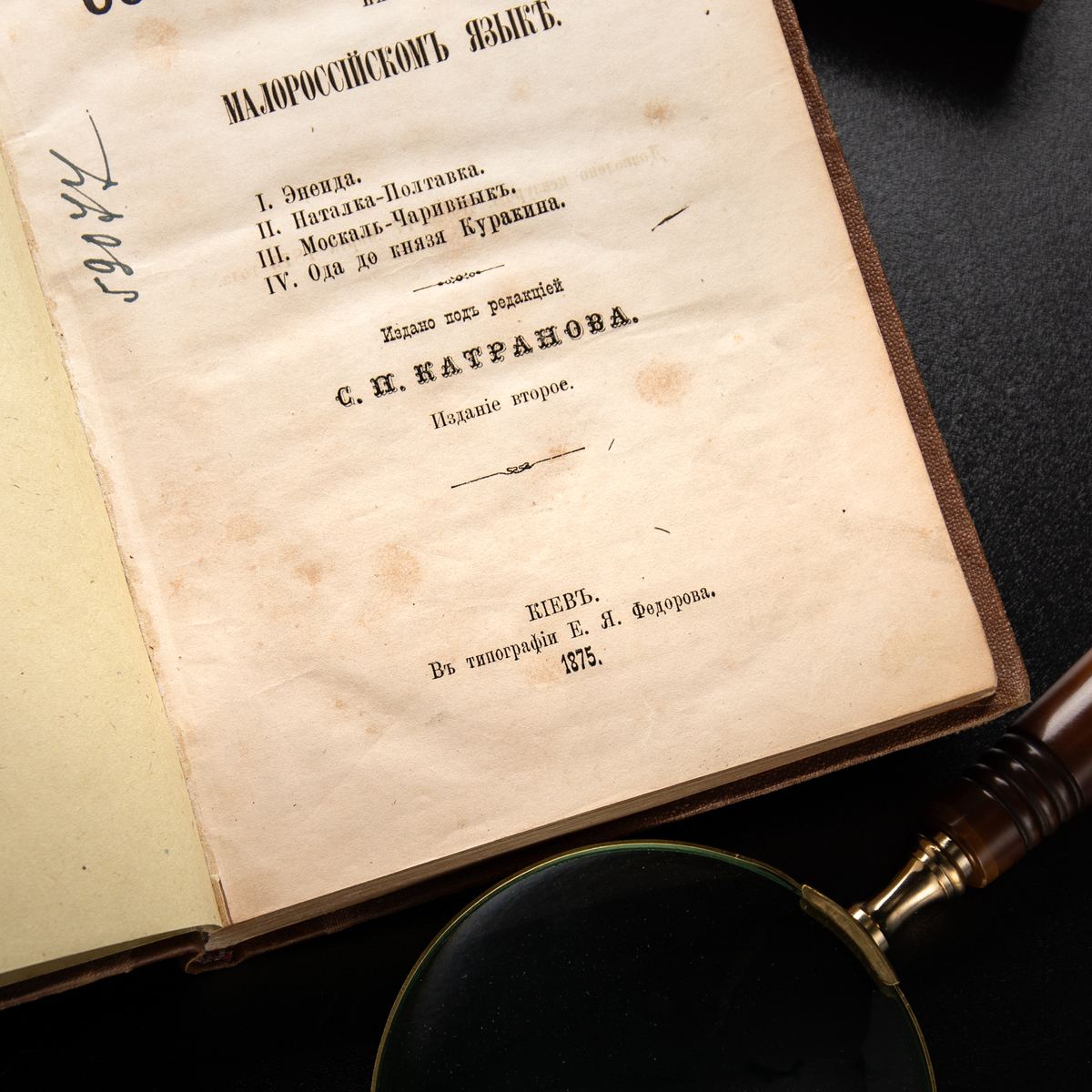 Книга І. Котляревського "Зібрання творів: Енеїда, Наталка Полтавка, Москаль-Чарівник, Ода до князя Куракіна" за ред. С. Катранова, видання друге. Київ: друкарня О.Я. Федорова, 1875 рік