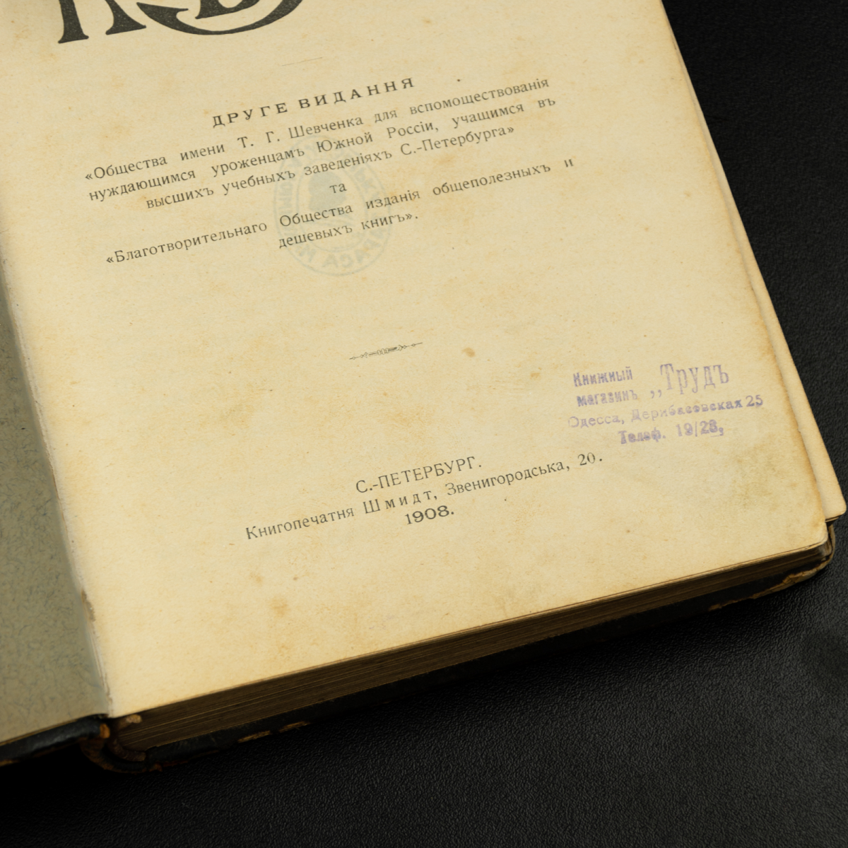 "Кобзар", Тарас Шевченко, 2-е видання, Книгодрук Шмідт, СПб, 1908 рік (українською мовою)