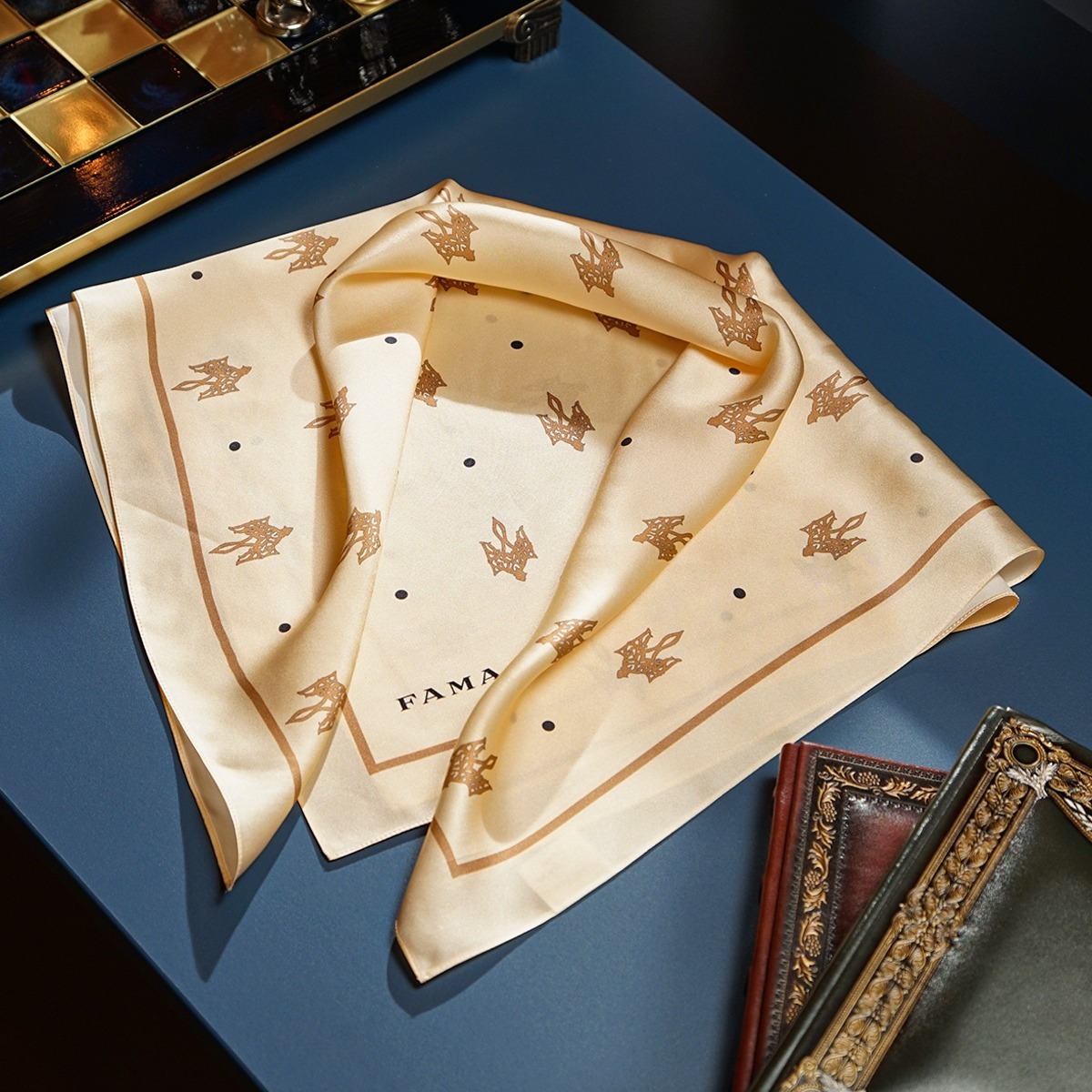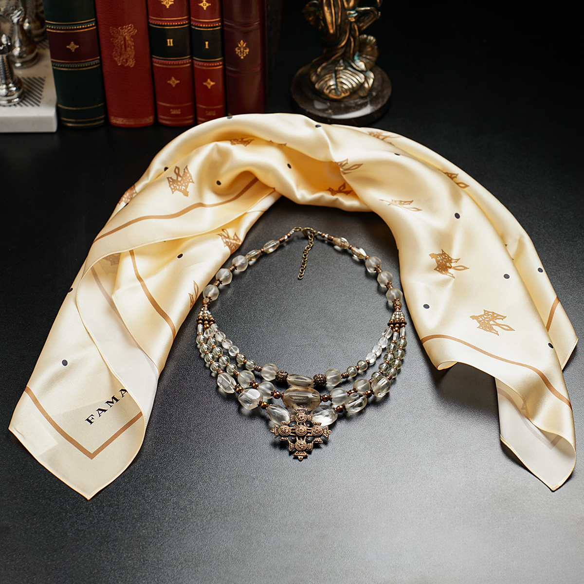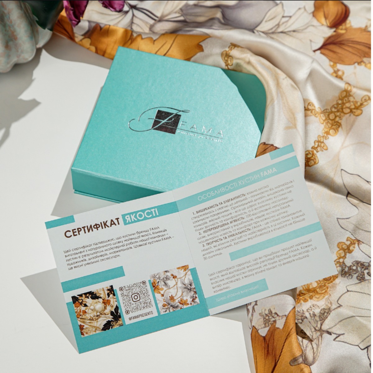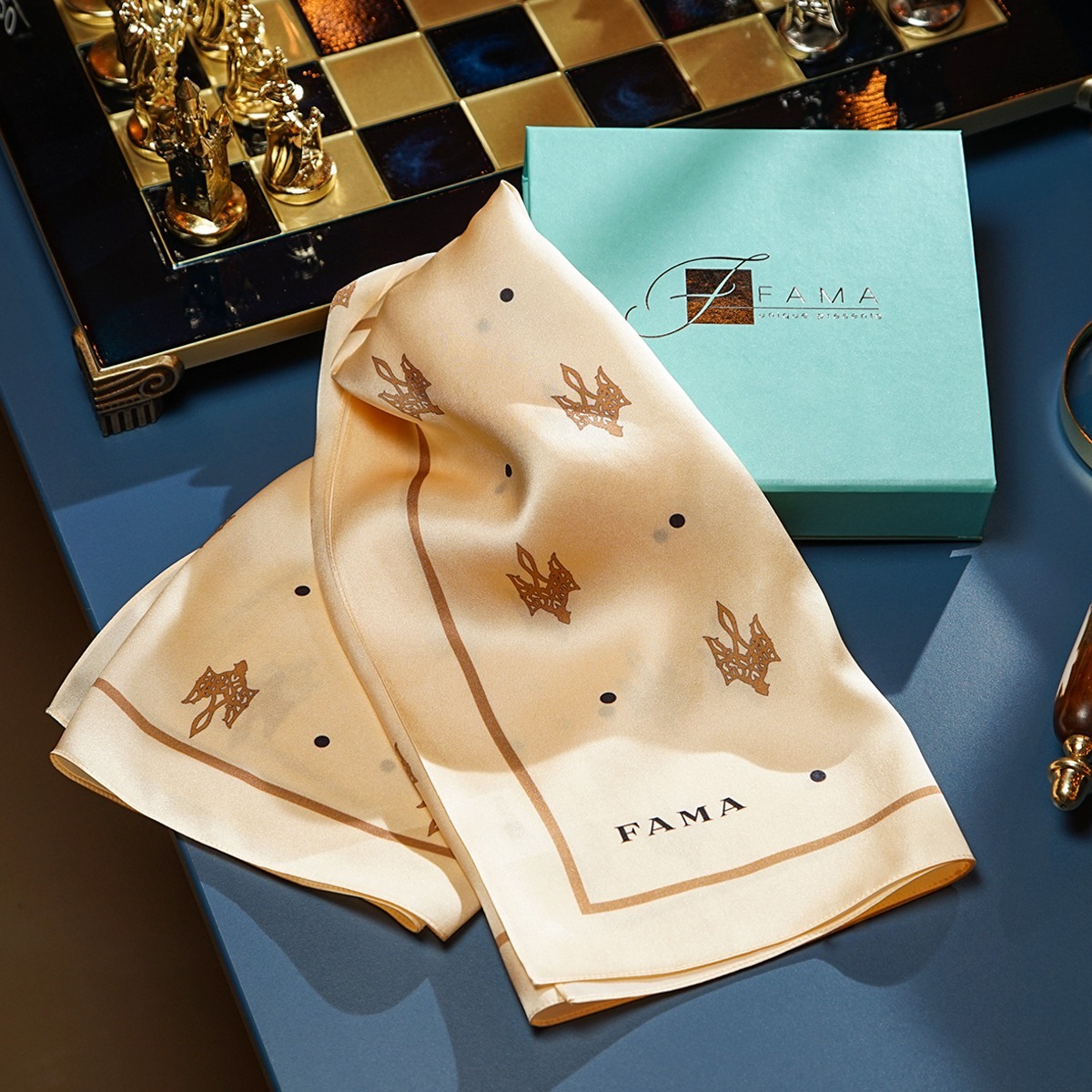 Подарунковий комплект - шовкова хустка "Trident" від FAMA (лімітована колекція, 65х65 см) та коралове намисто "Гармонія"