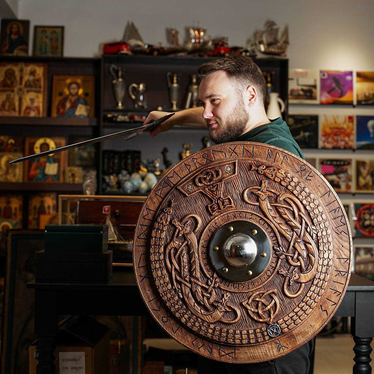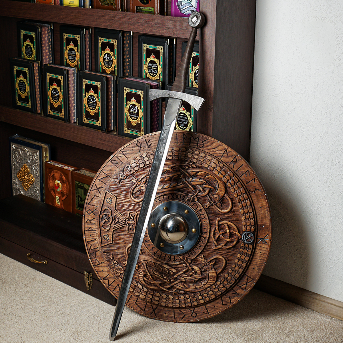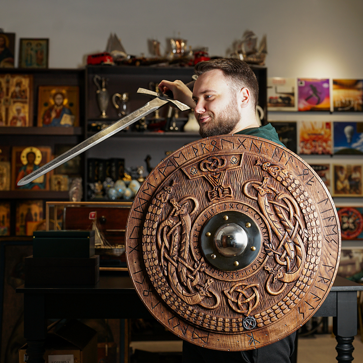 Подарунковий комплект – Дерев'яний щит вікінгів ручної роботи "Norse runes" від Topor & Molot та Ексклюзивний меч із чорної сталі "Millennium" від Topor & Molot