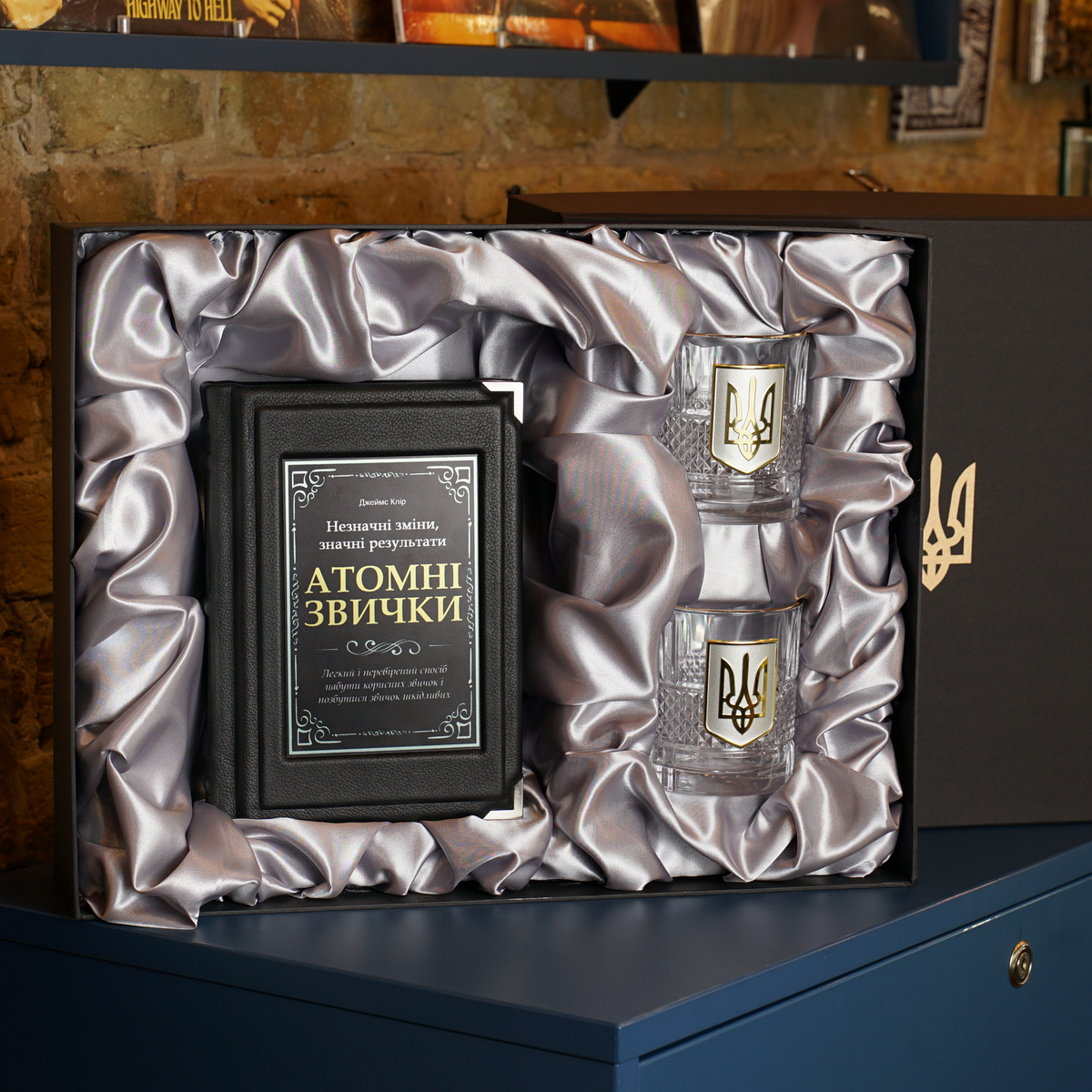 Подарунковий комплект книга Джеймс Клір "Атомні Звички" (українською мовою) та набір для віскі "Тризуб" латунь пандора з позолотою та сріблом (2 келихи) від BIANCANEVE