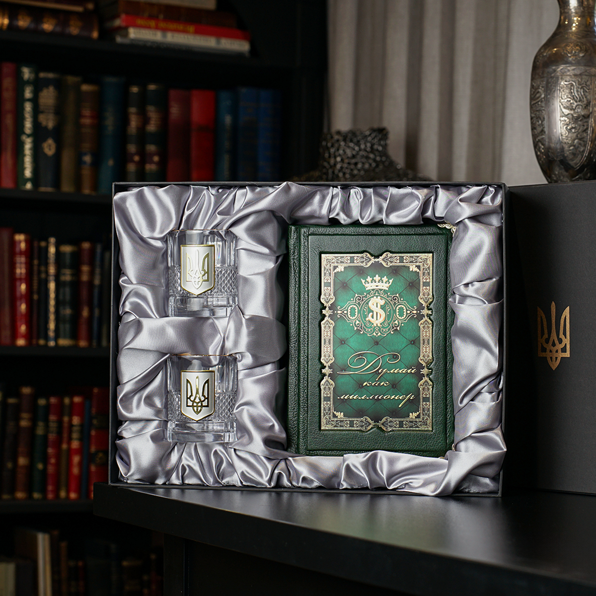 Подарунковий комплект кришталеві келихи з позолотою та сріблом "Тризуб" та книга «Думай як мільйонер», Т. Харв Екер