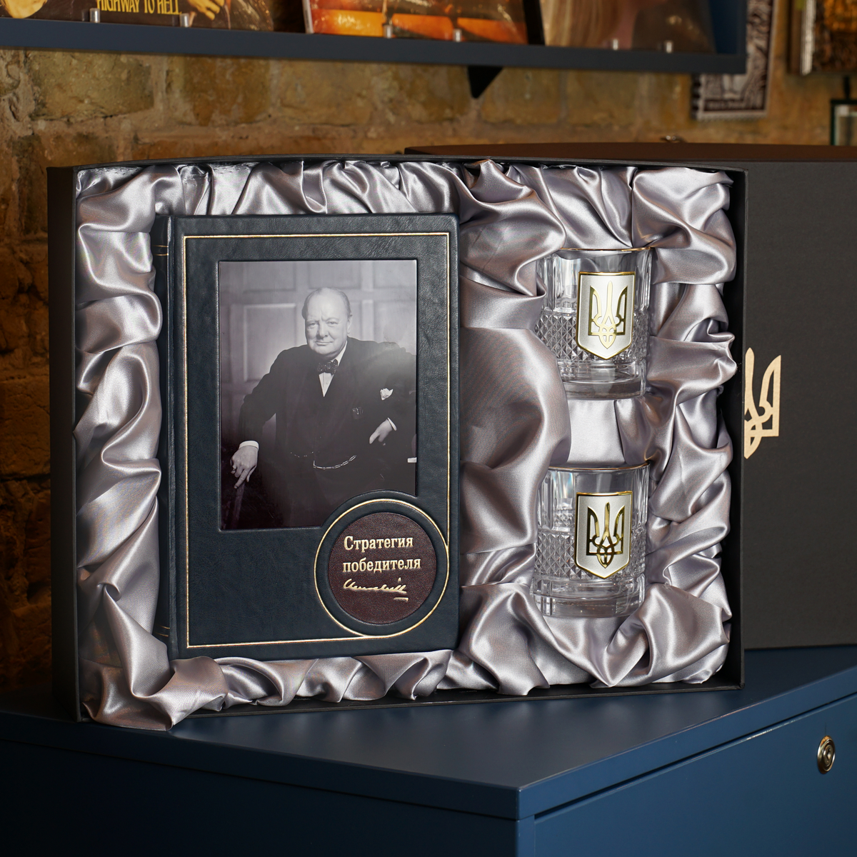 Подарунковий комплект кришталеві келихи з позолотою та сріблом "Тризуб" та книга "Стратегія переможця", Вінстон Черчилль