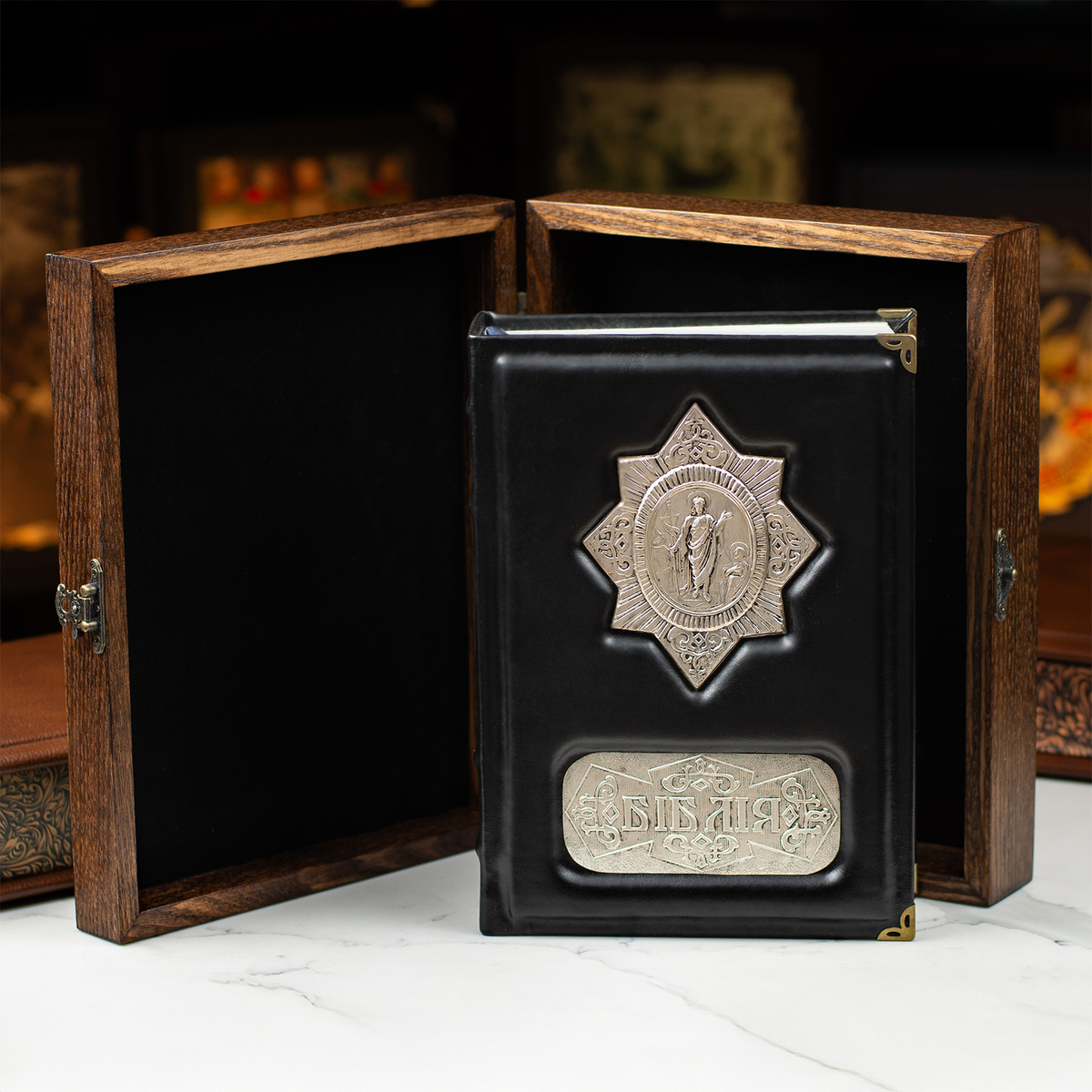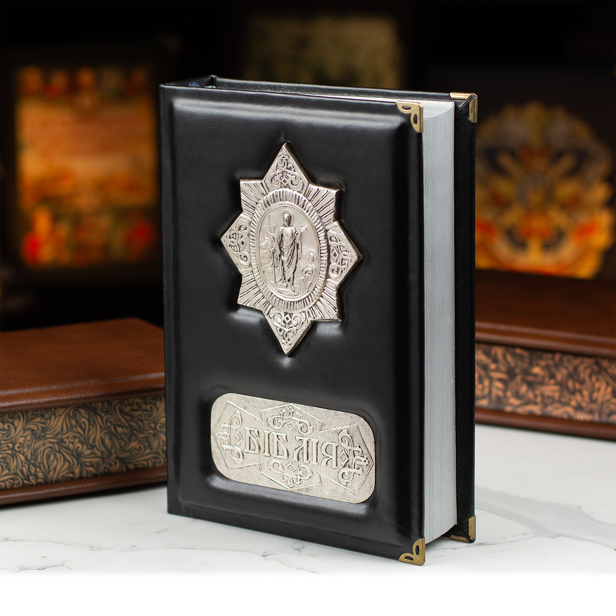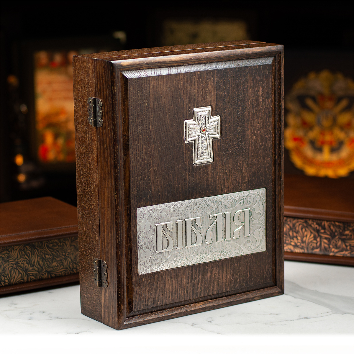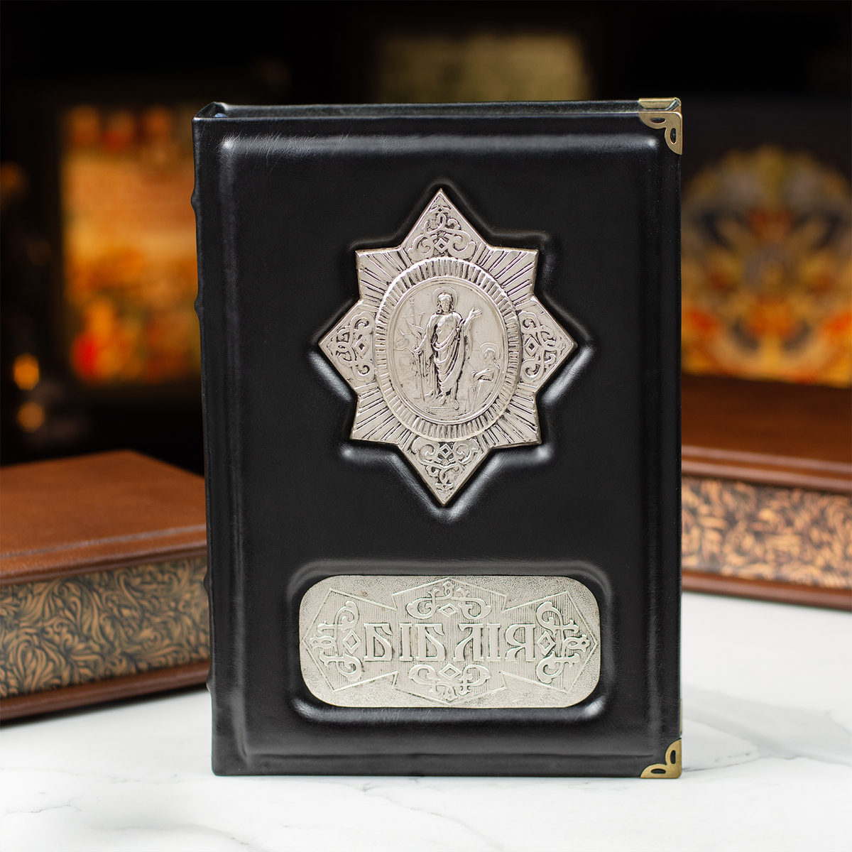 Шкіряна Біблія ручної роботи в кейсі з посрібленням (українською мовою)
